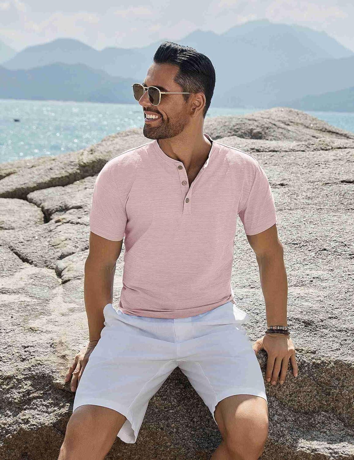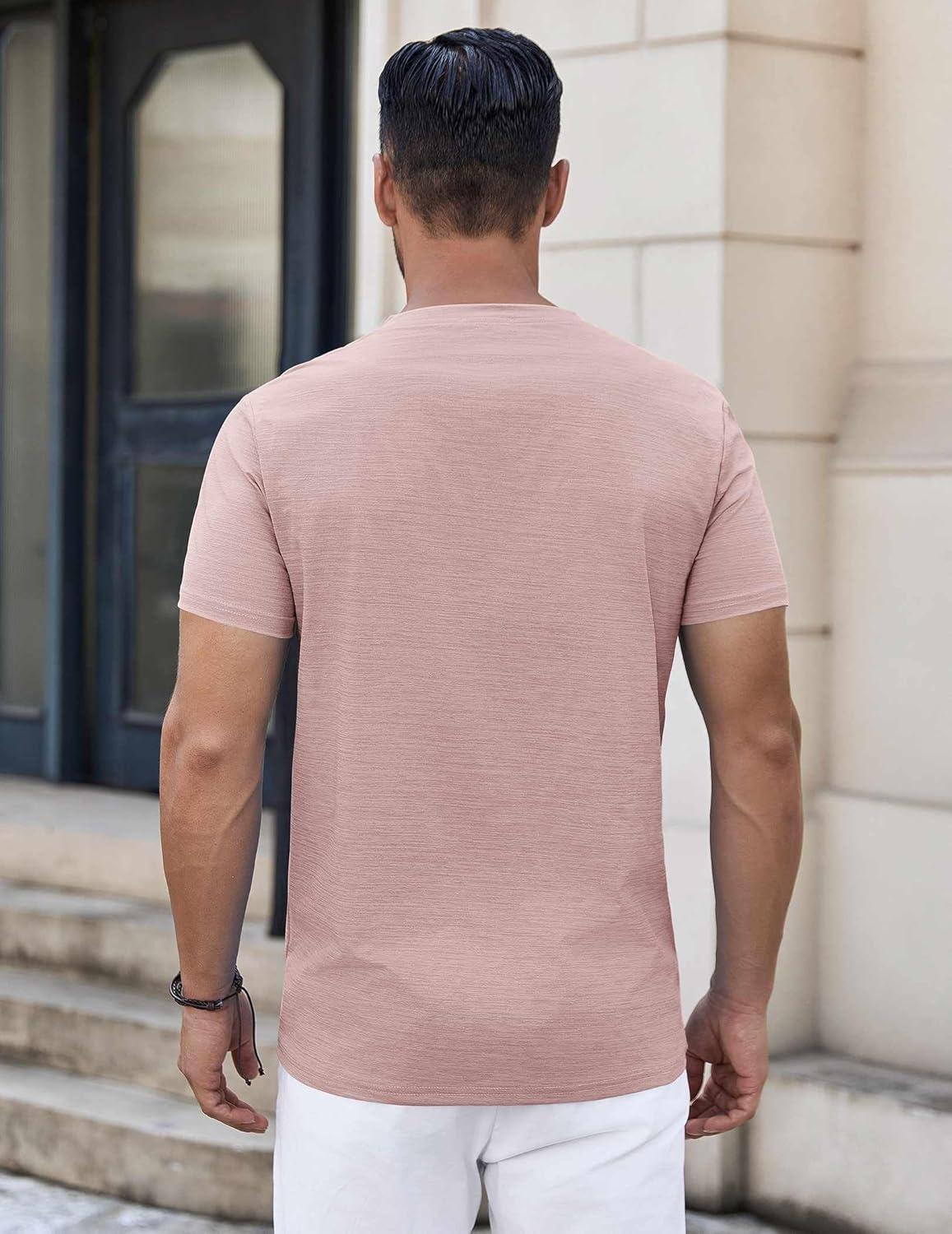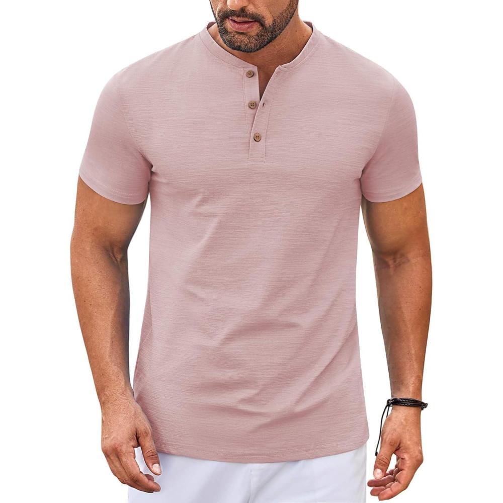 COOFANDY Mens Henley Shirts Short Sleeve Casual Button Down Shirts Lightweight Summer Basic Tee(Pink)