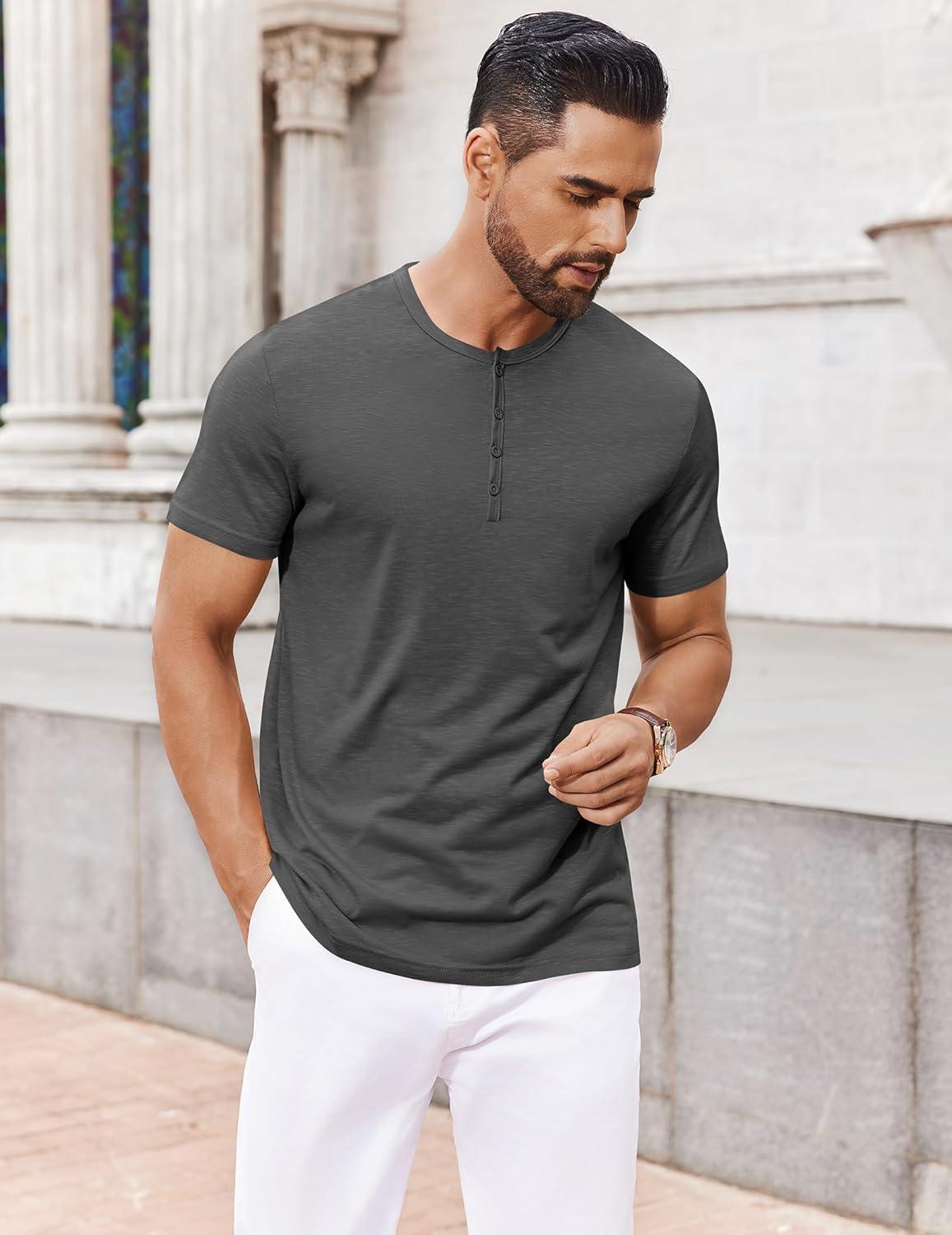 COOFANDY Men’s Henley Shirts Short Sleeve Collarless Button T-Shirt Fashion Casual Basic Tee Tops(Dark Grey)