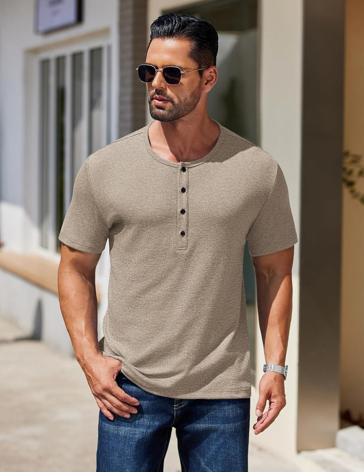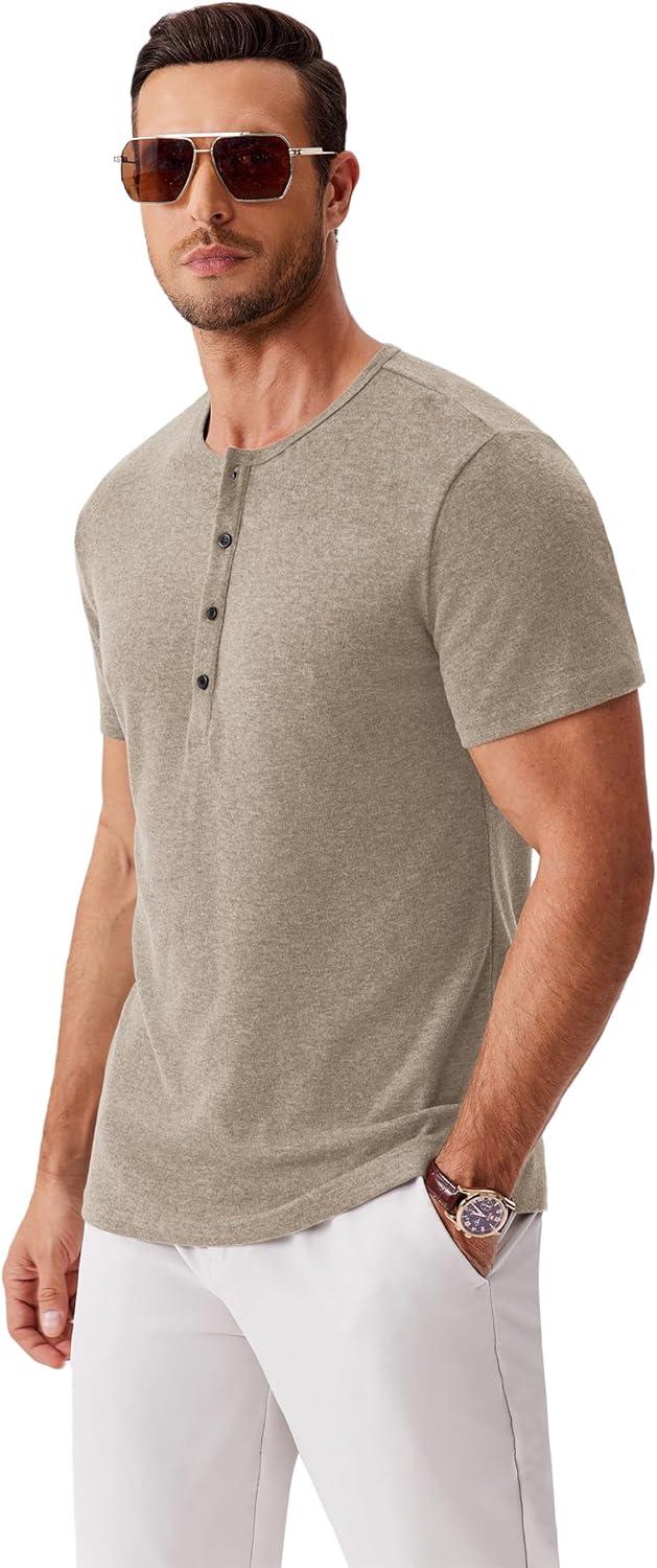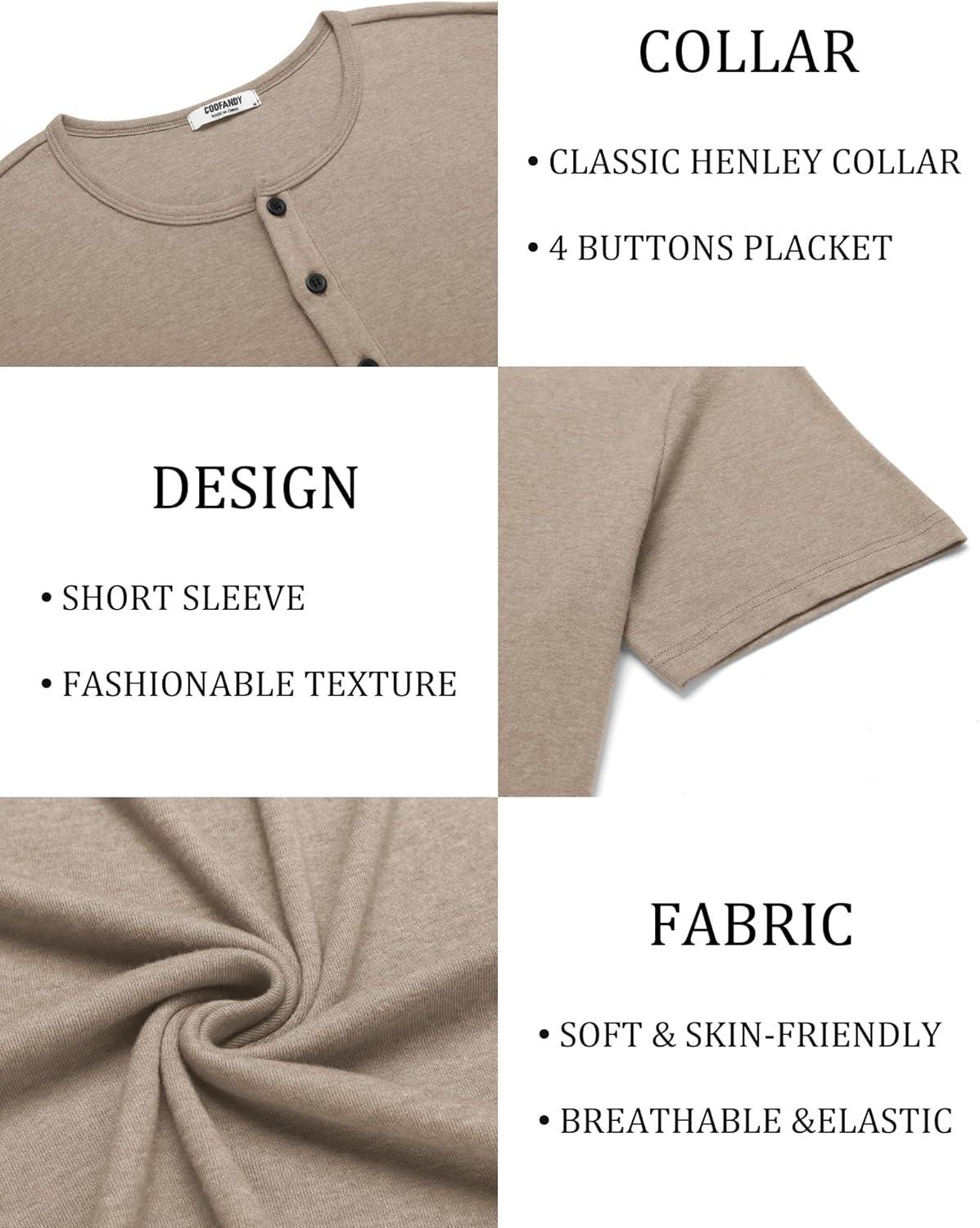 COOFANDY Men’s Henley Shirts Short Sleeve Fashion Casual T-Shirts Summer Button Basic Tee(Khaki)