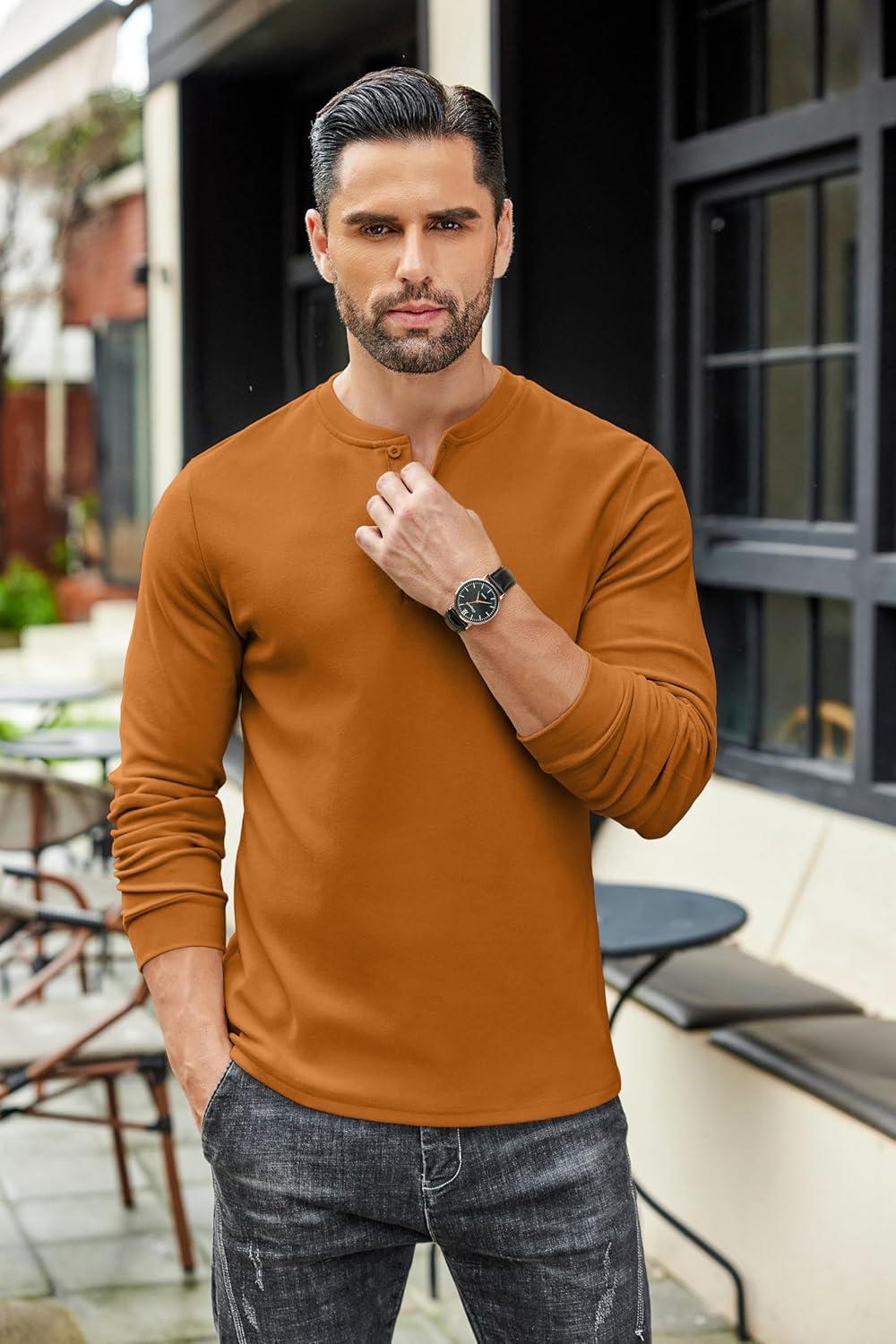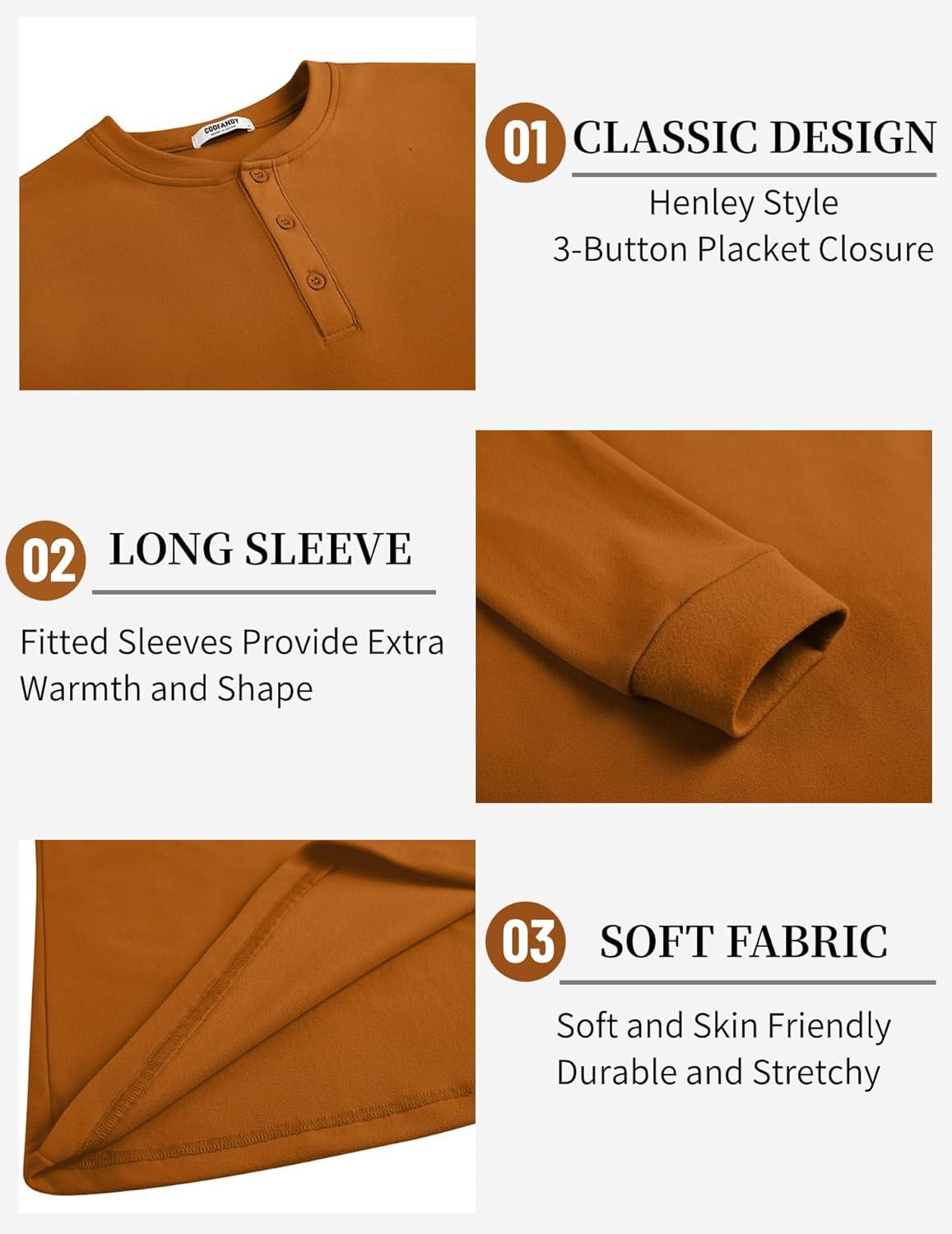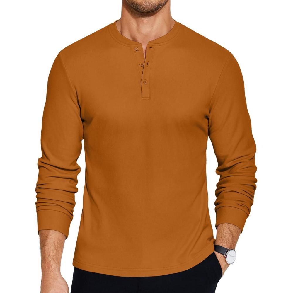 COOFANDY Men’s Henley T-Shirts Long Sleeve Pullover Shirt Casual Heavyweight Button Shirts Basic Tees(Caramel Brown)