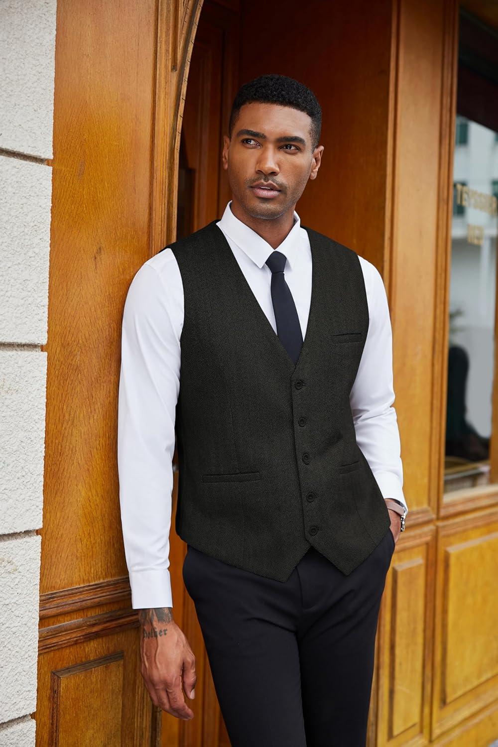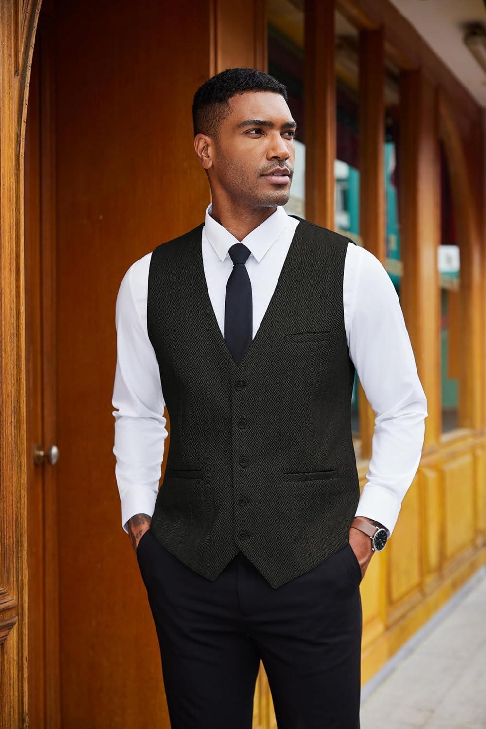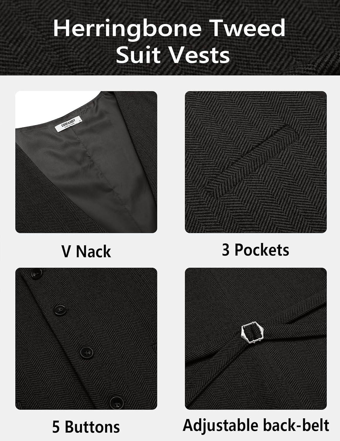 COOFANDY Men’s Herringbone Tweed Suit Vests Slim Fit Waistcoat Casual Business Dress Vest(Black)