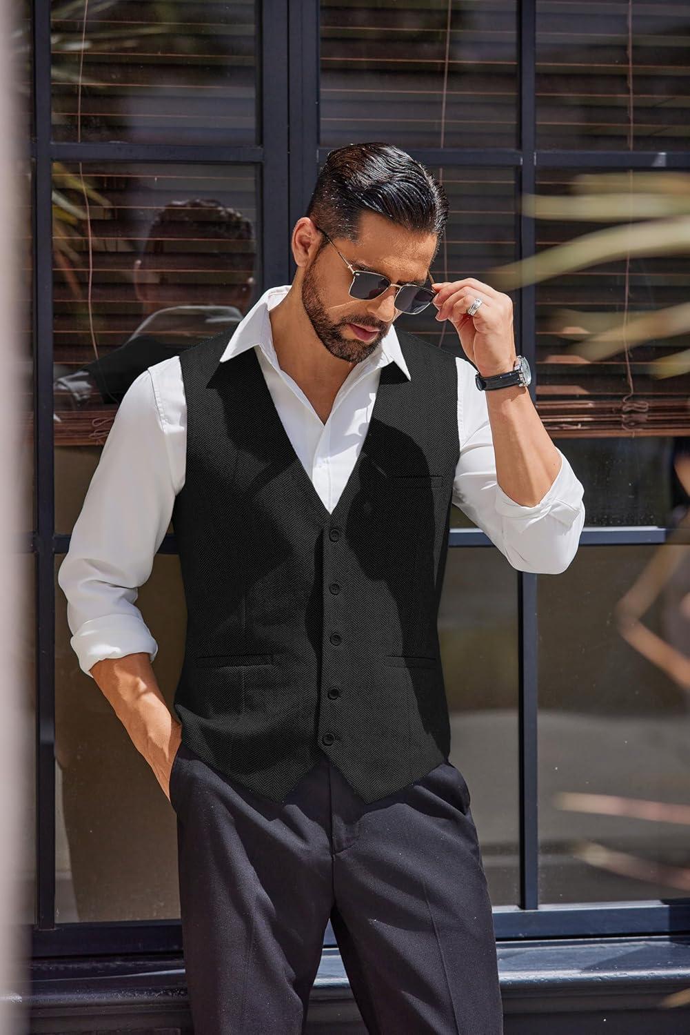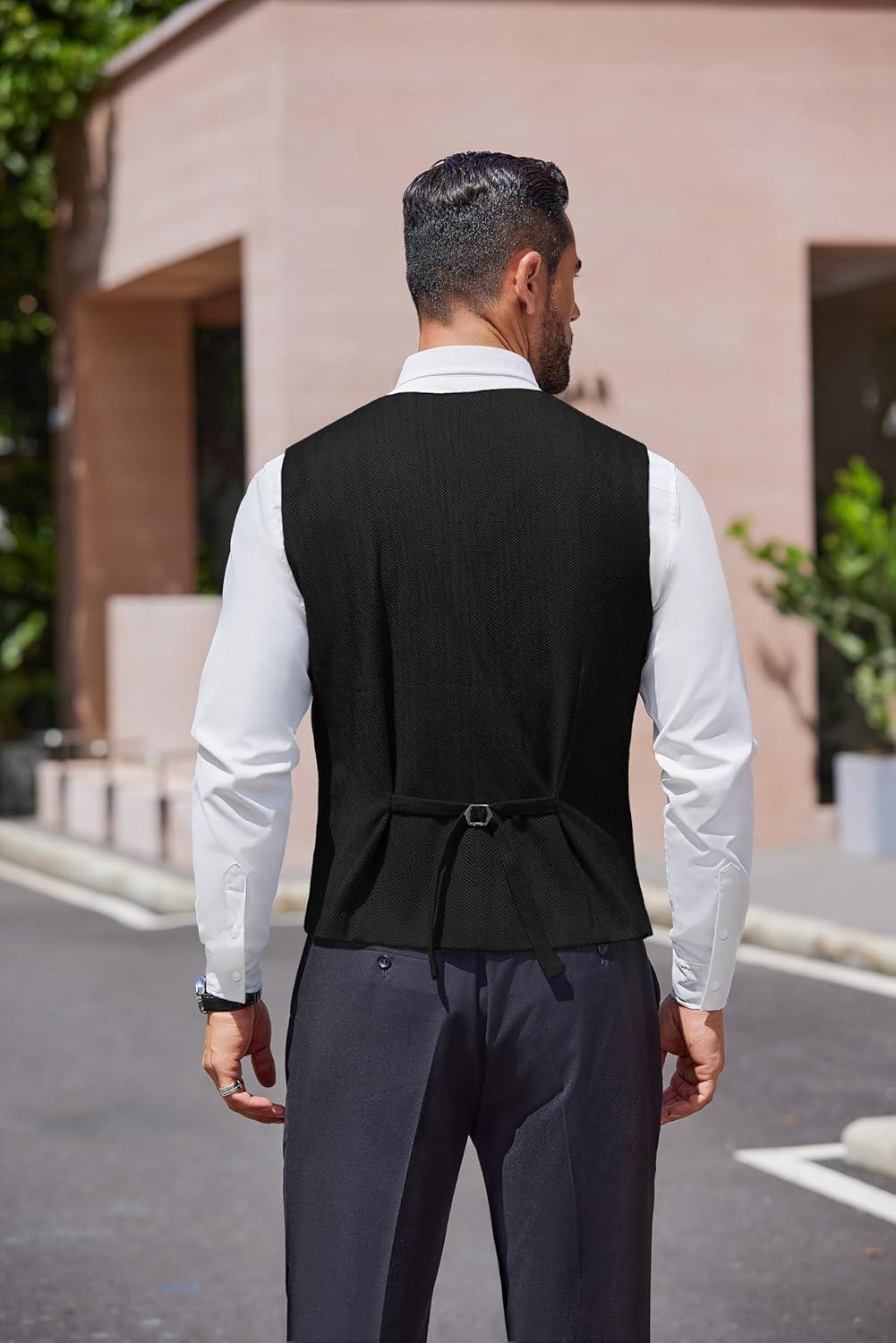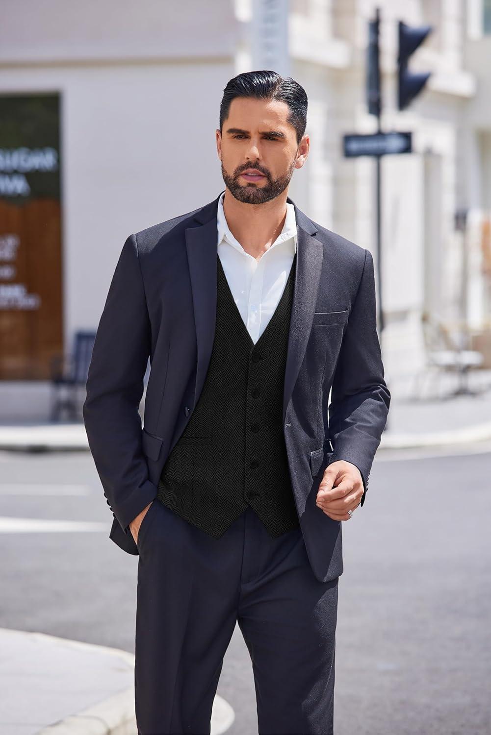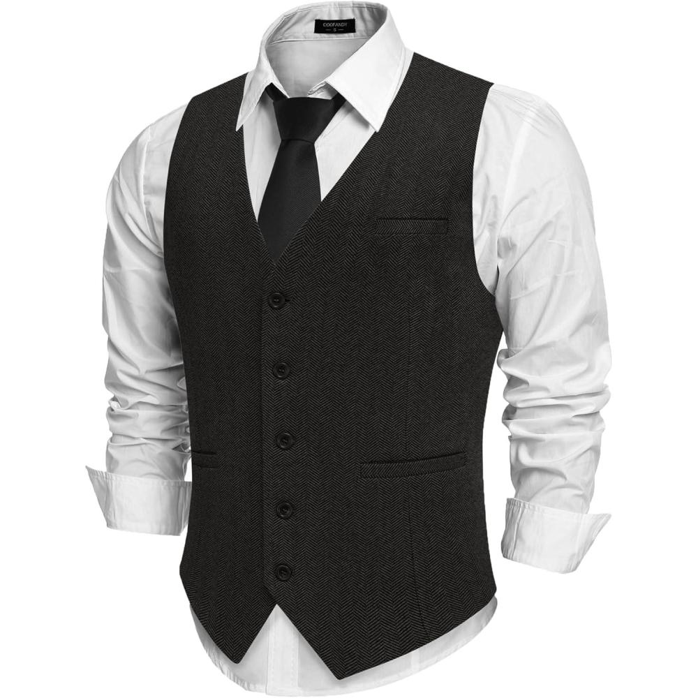 COOFANDY Men’s Herringbone Tweed Suit Vests Slim Fit Waistcoat Casual Business Dress Vest(Black)