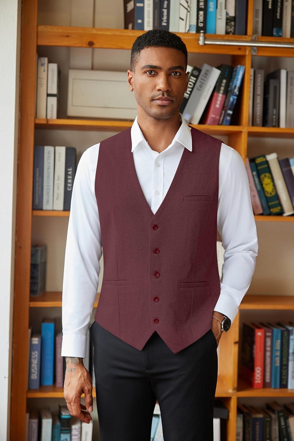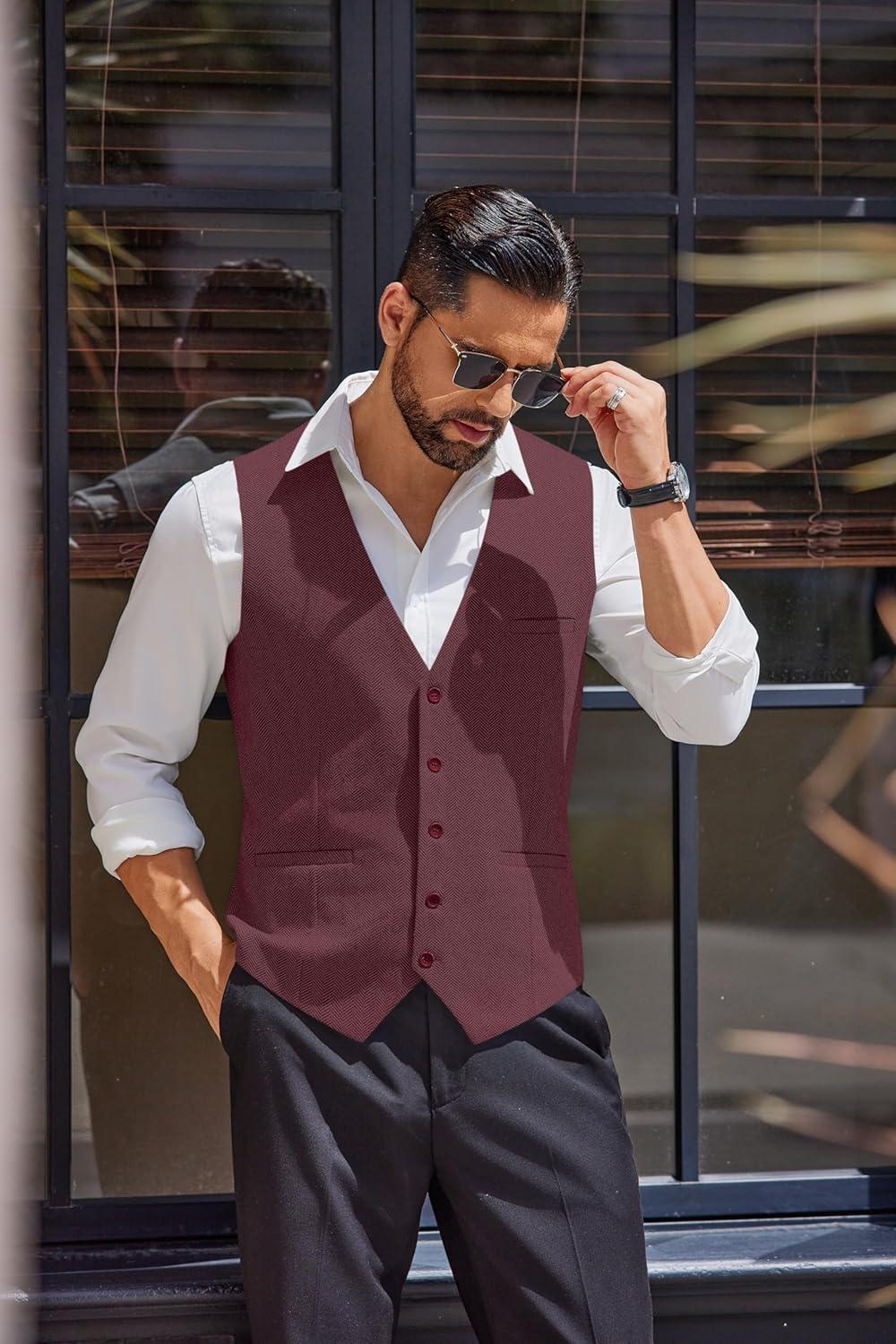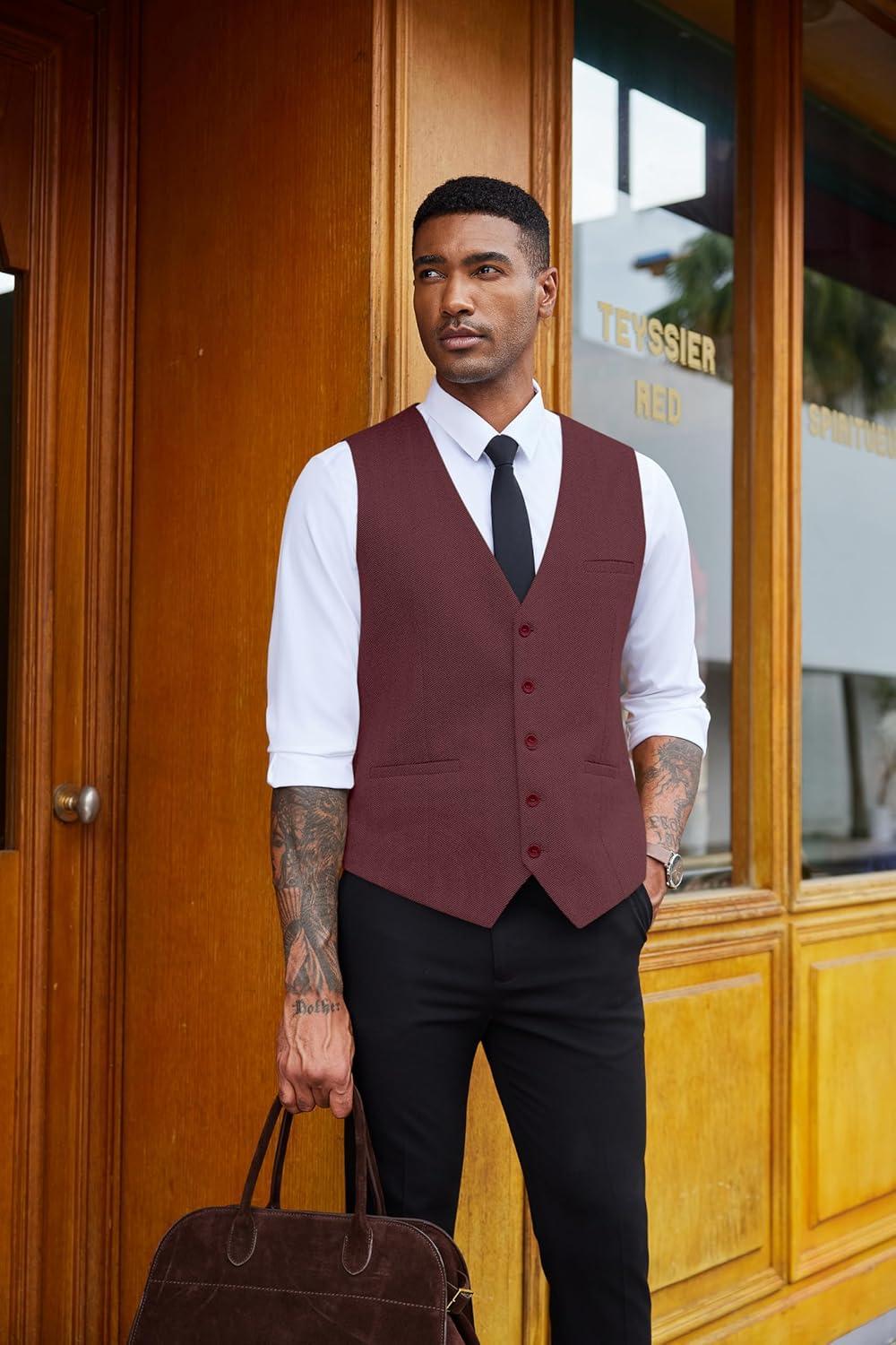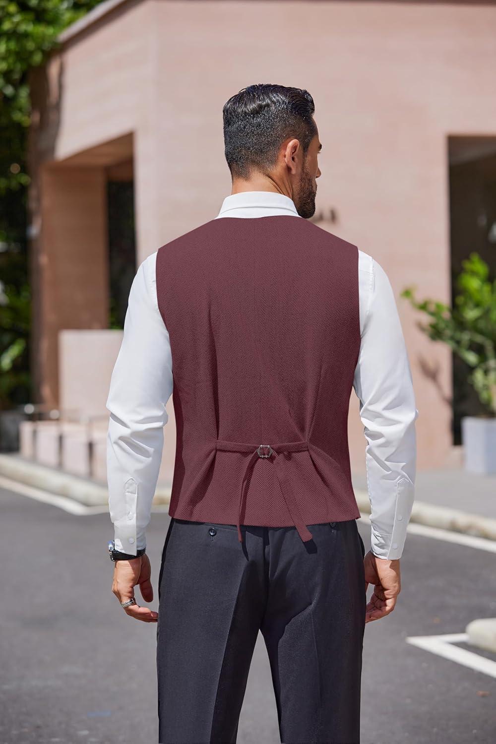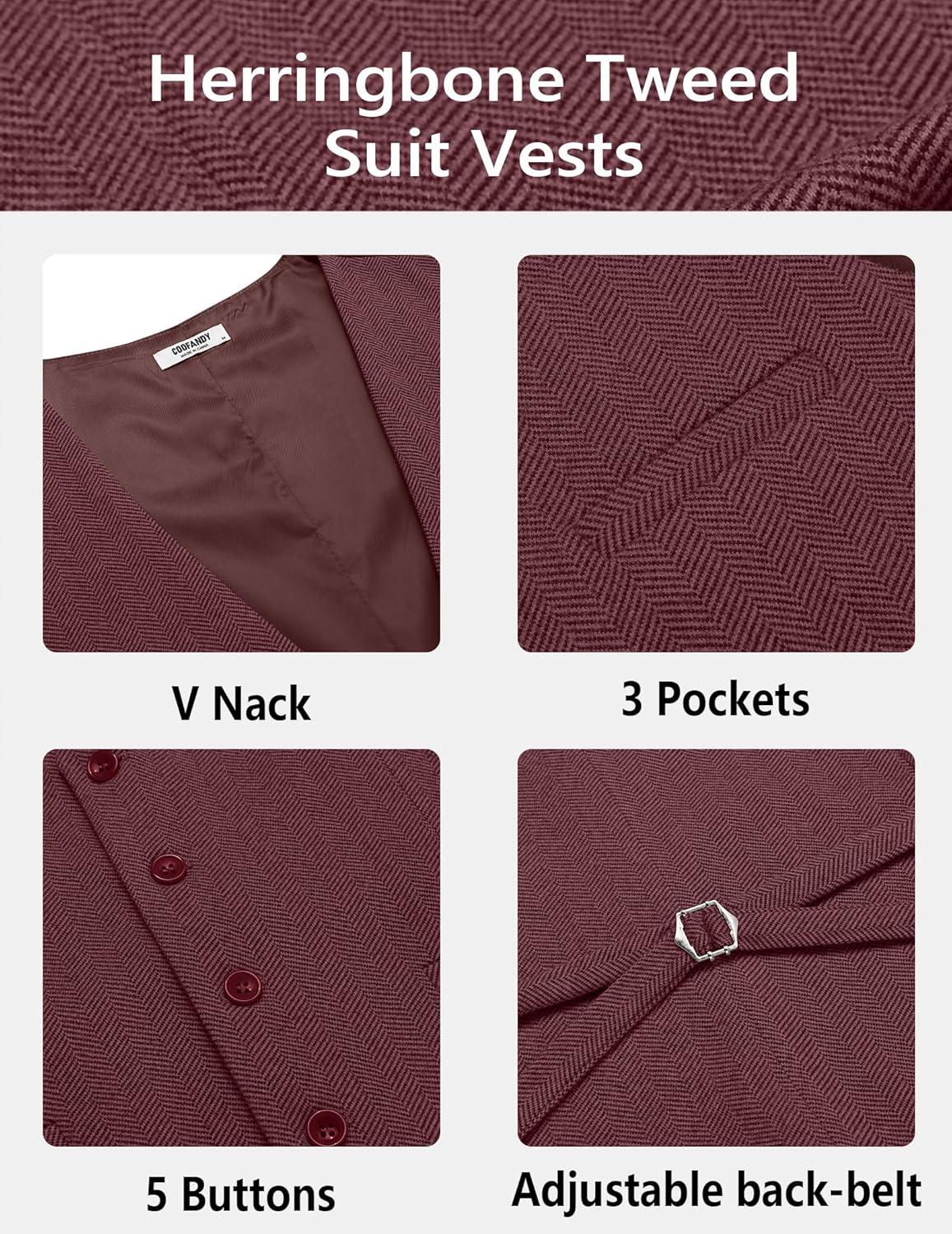 COOFANDY Men’s Herringbone Tweed Suit Vests Slim Fit Waistcoat Casual Business Dress Vest(Red)