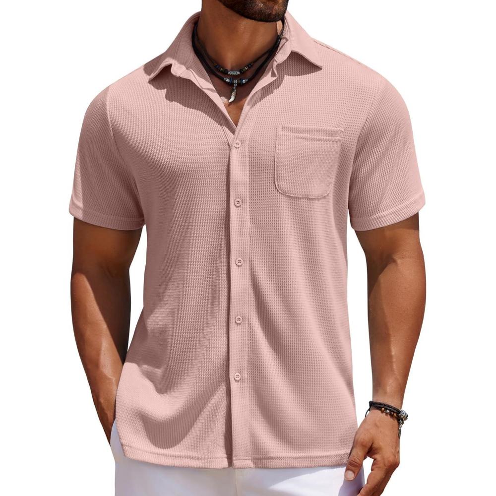 COOFANDY Men’s Knit Button Down Shirts Casual Short Sleeve Polo Shirt Summer Beach Shirts with Pocket(Misty Rose)