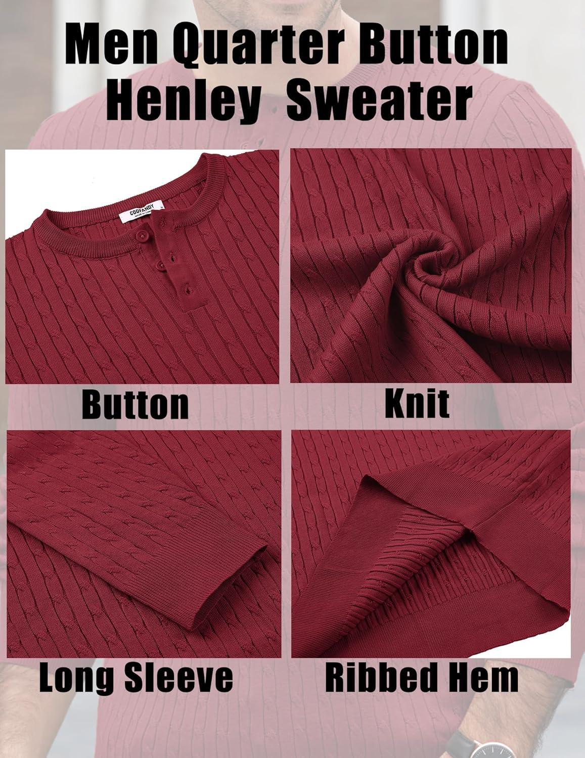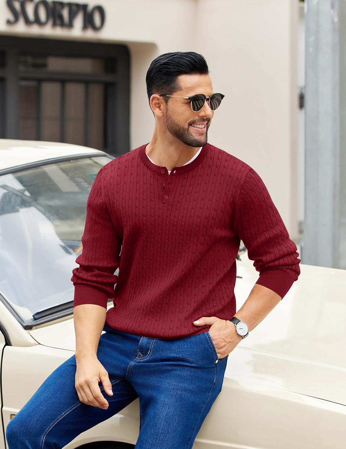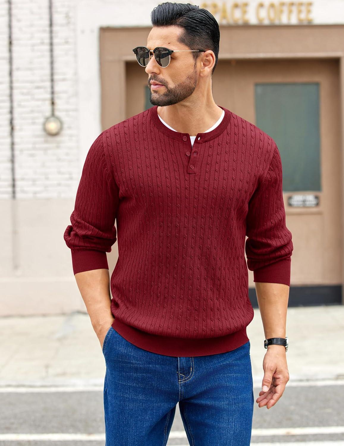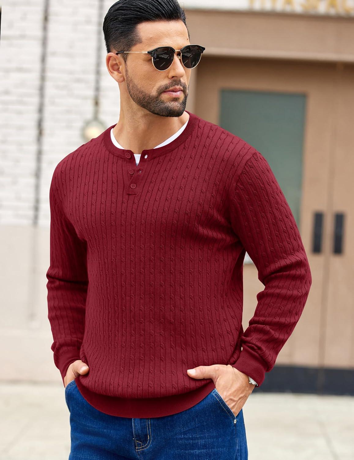 COOFANDY Men’s Knit Henley Sweater Long Sleeve Button Down Fall Sweaters and Pullovers(Wine Red)