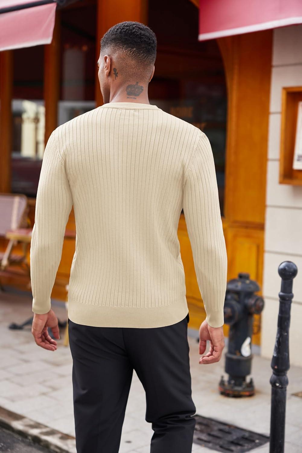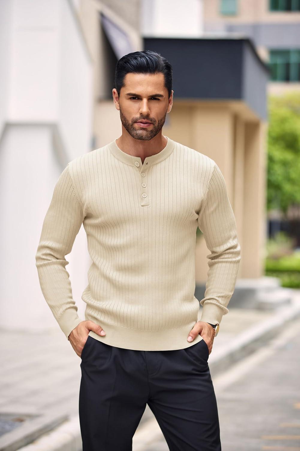 COOFANDY Mens Knit Henley Sweater Long Sleeve Button Down Lightweight Sweater Fall Slim Fit Ribbed Pullover(Beige)