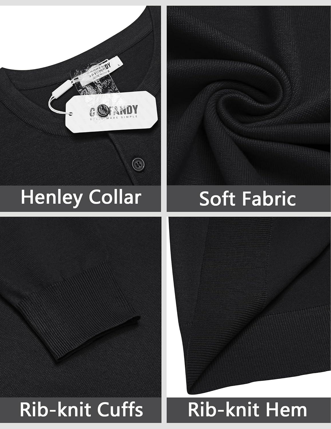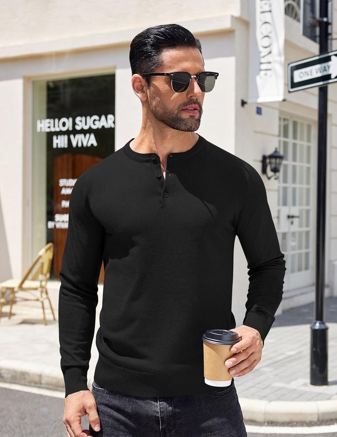 COOFANDY Mens Knit Henley T-Shirts Dress Long Sleeve Sweater Casual Collarless Quarter Button Pullover(Black)