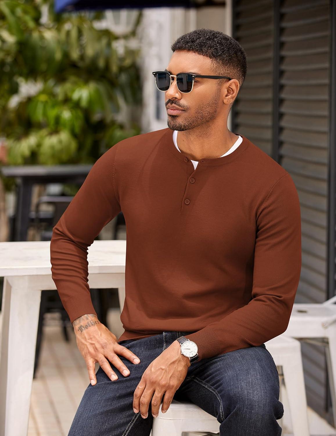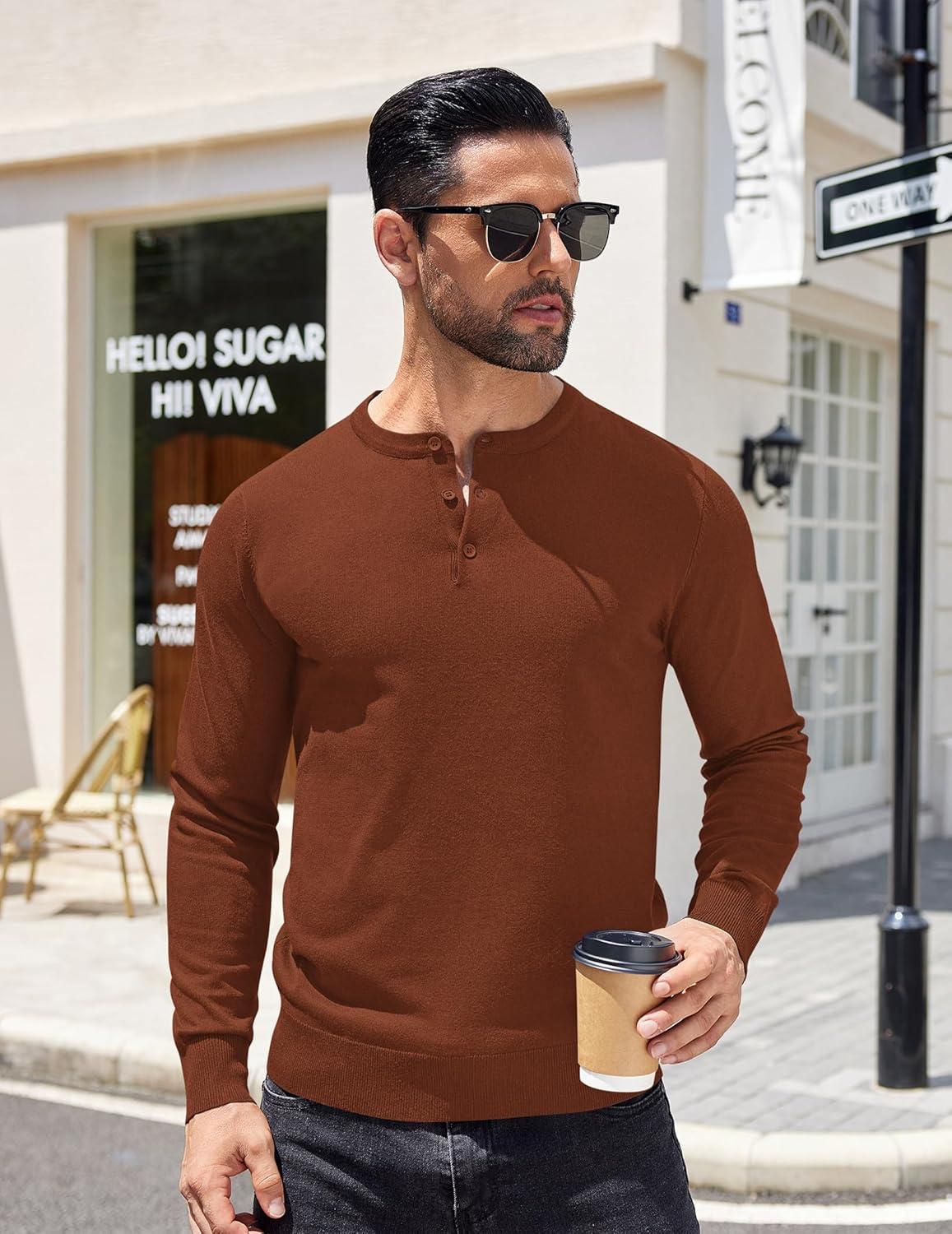 COOFANDY Mens Knit Henley T-Shirts Dress Long Sleeve Sweater Casual Collarless Quarter Button Pullover(Caramel)
