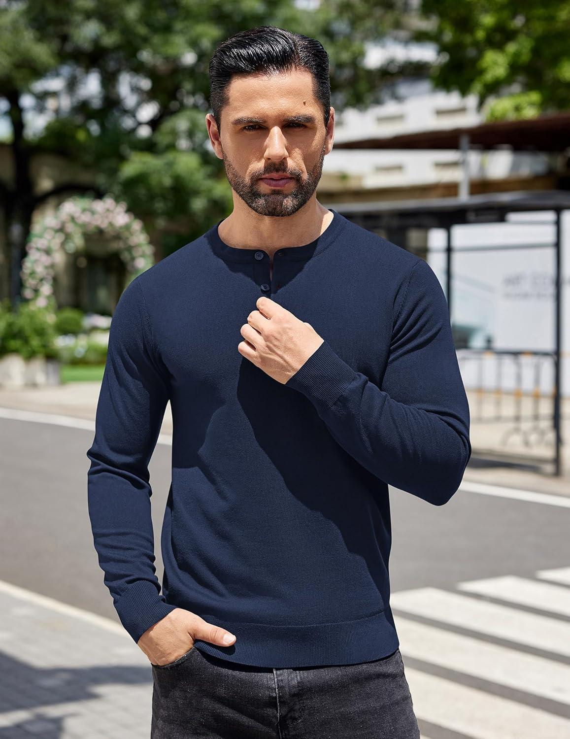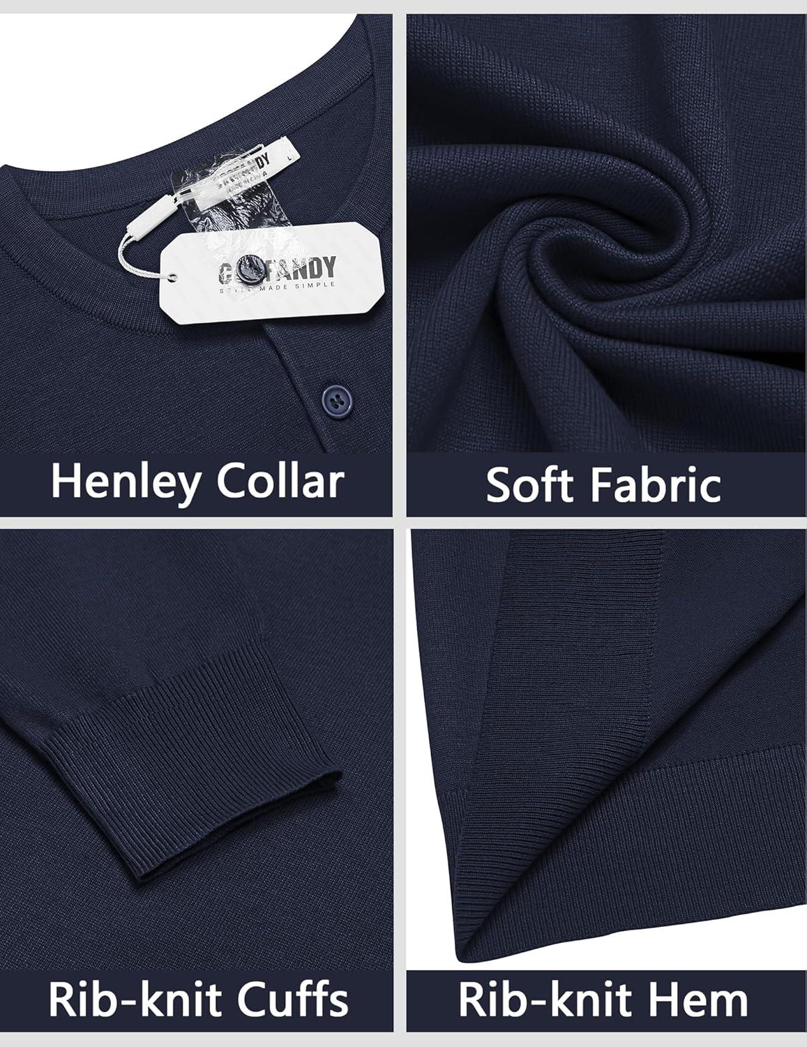 COOFANDY Mens Knit Henley T-Shirts Dress Long Sleeve Sweater Casual Collarless Quarter Button Pullover(Dark Navy Blue)