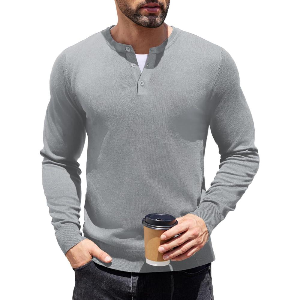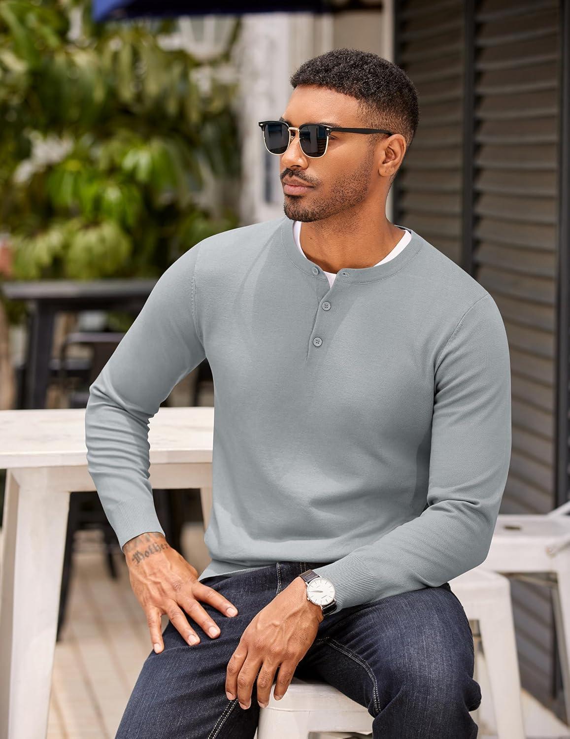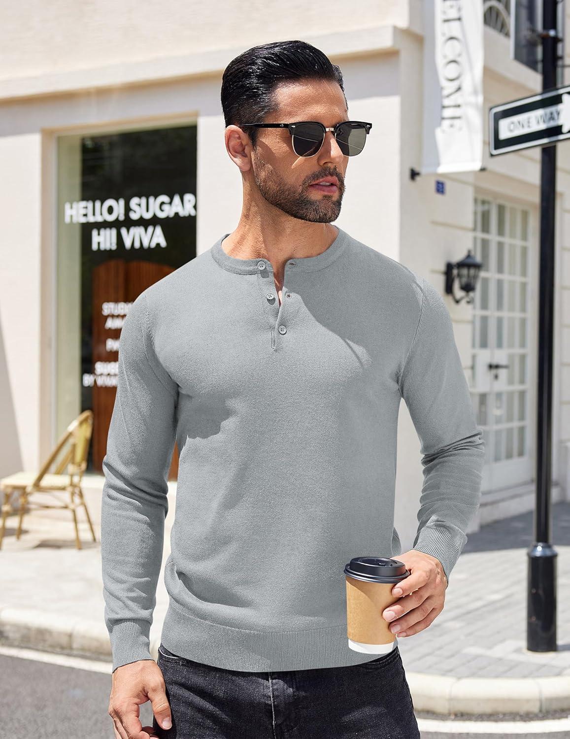 COOFANDY Mens Knit Henley T-Shirts Dress Long Sleeve Sweater Casual Collarless Quarter Button Pullover(Light Grey)