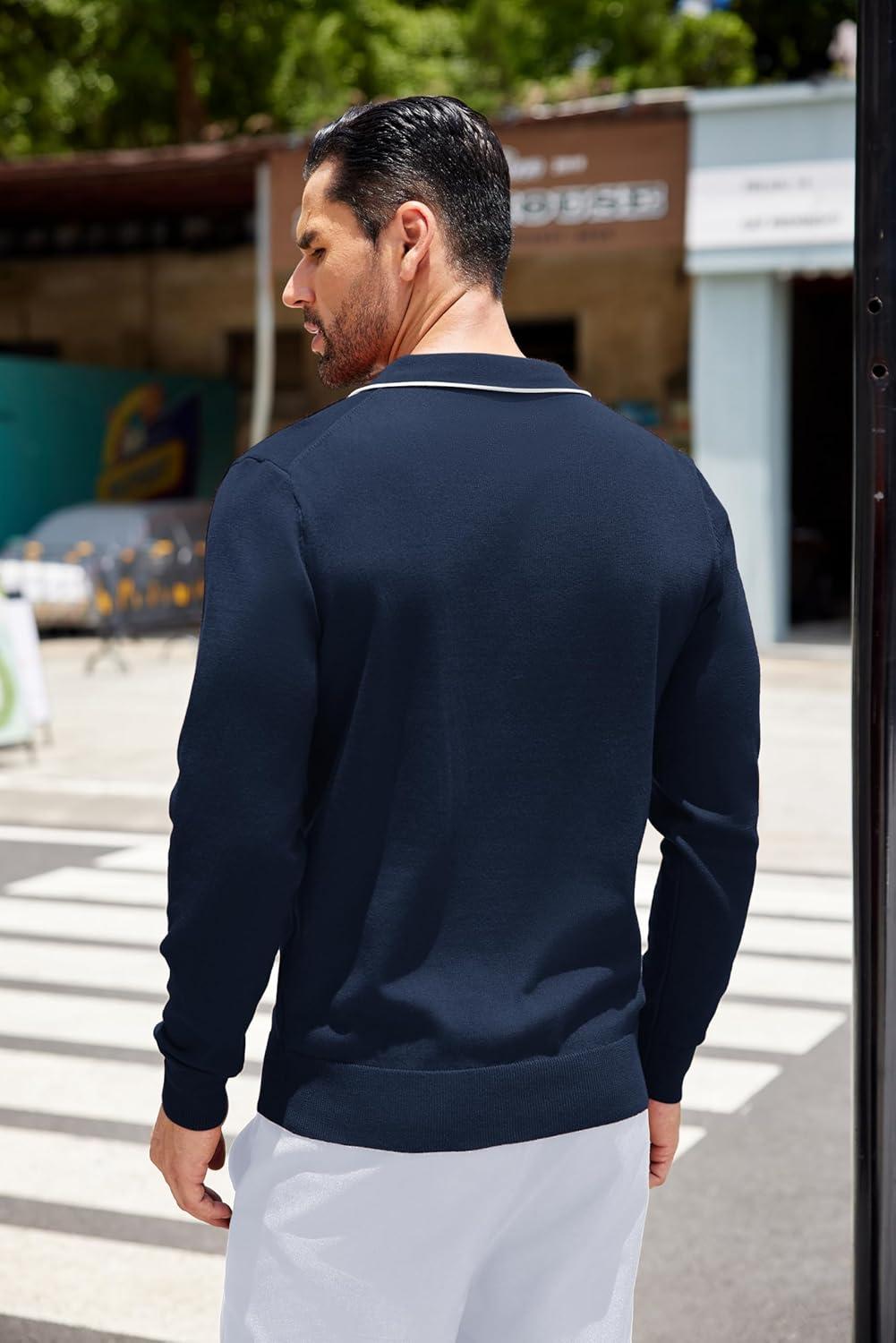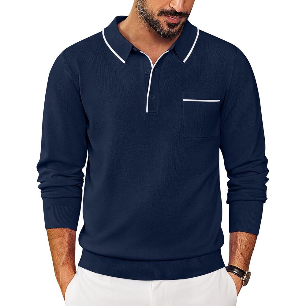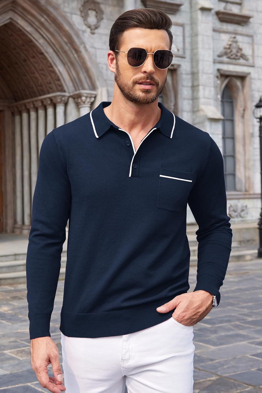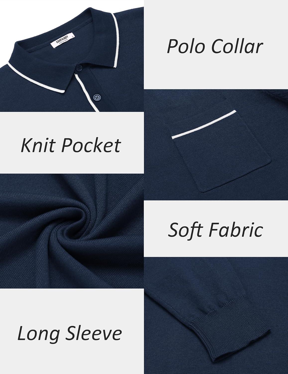 COOFANDY Mens Knit Polo Long Sleeve Collared Sweater Polo Business Casual Polos with Pocket(Navy Blue)