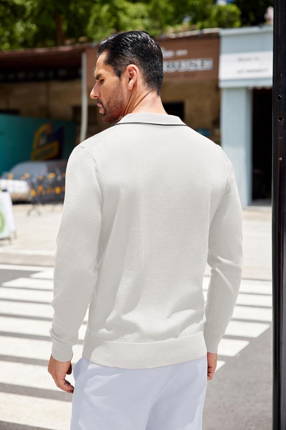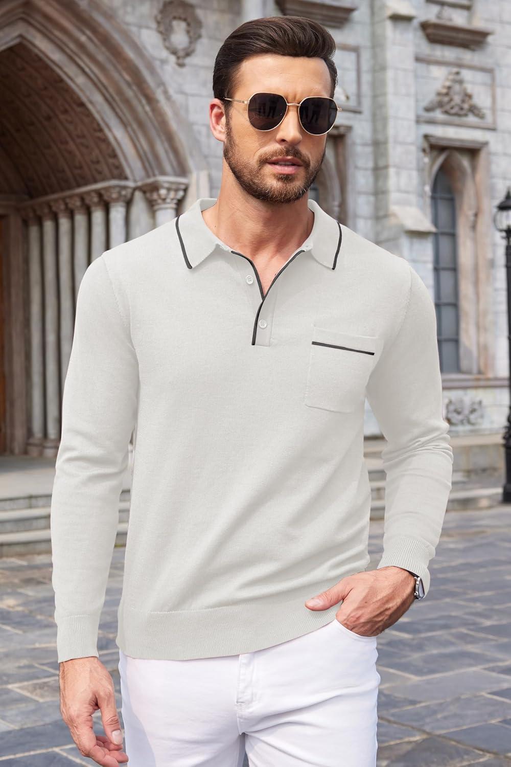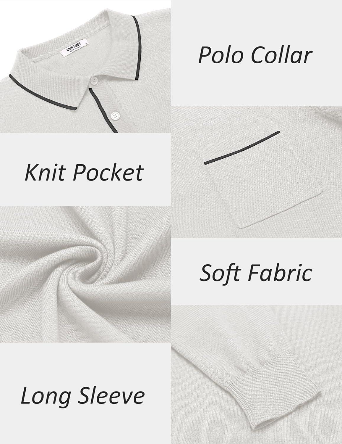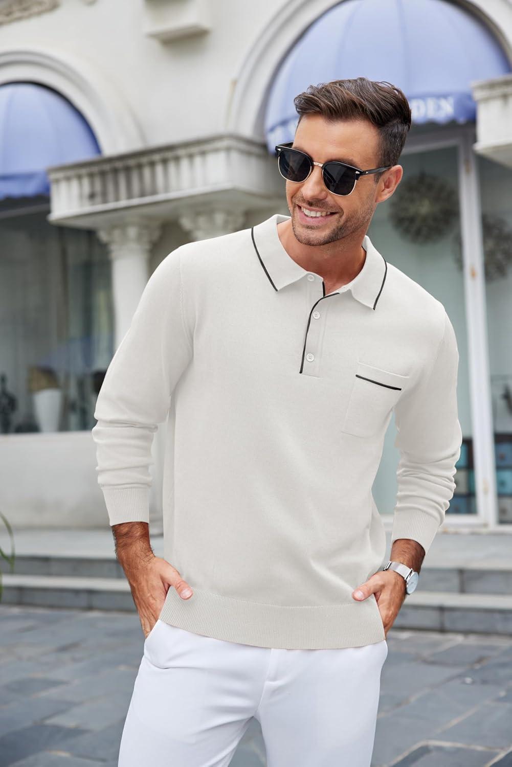 COOFANDY Mens Knit Polo Long Sleeve Collared Sweater Polo Business Casual Polos with Pocket(White)