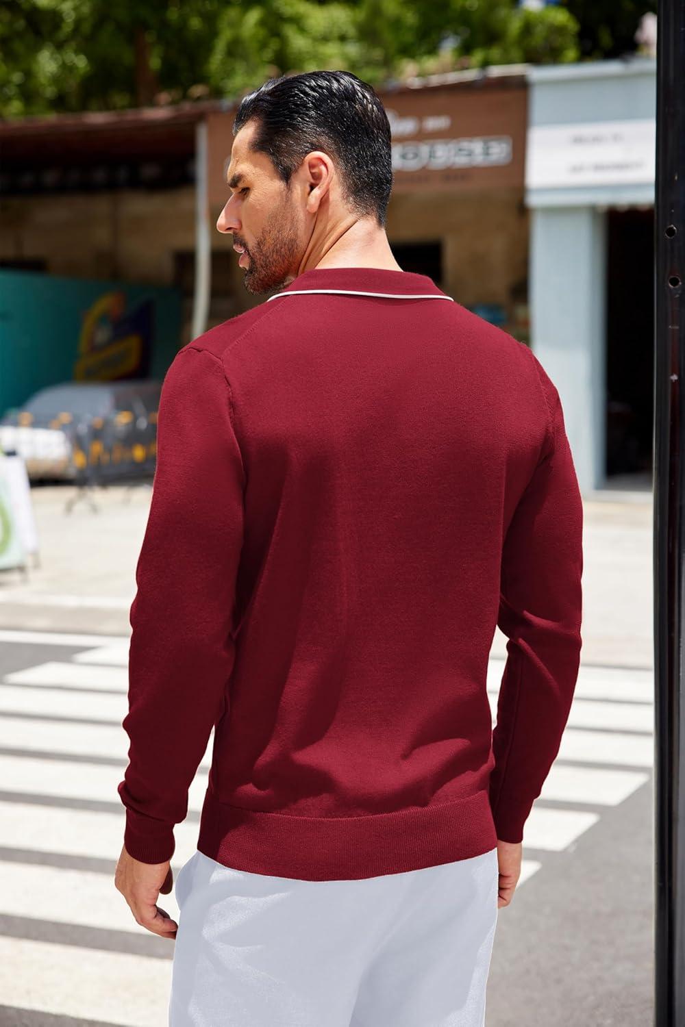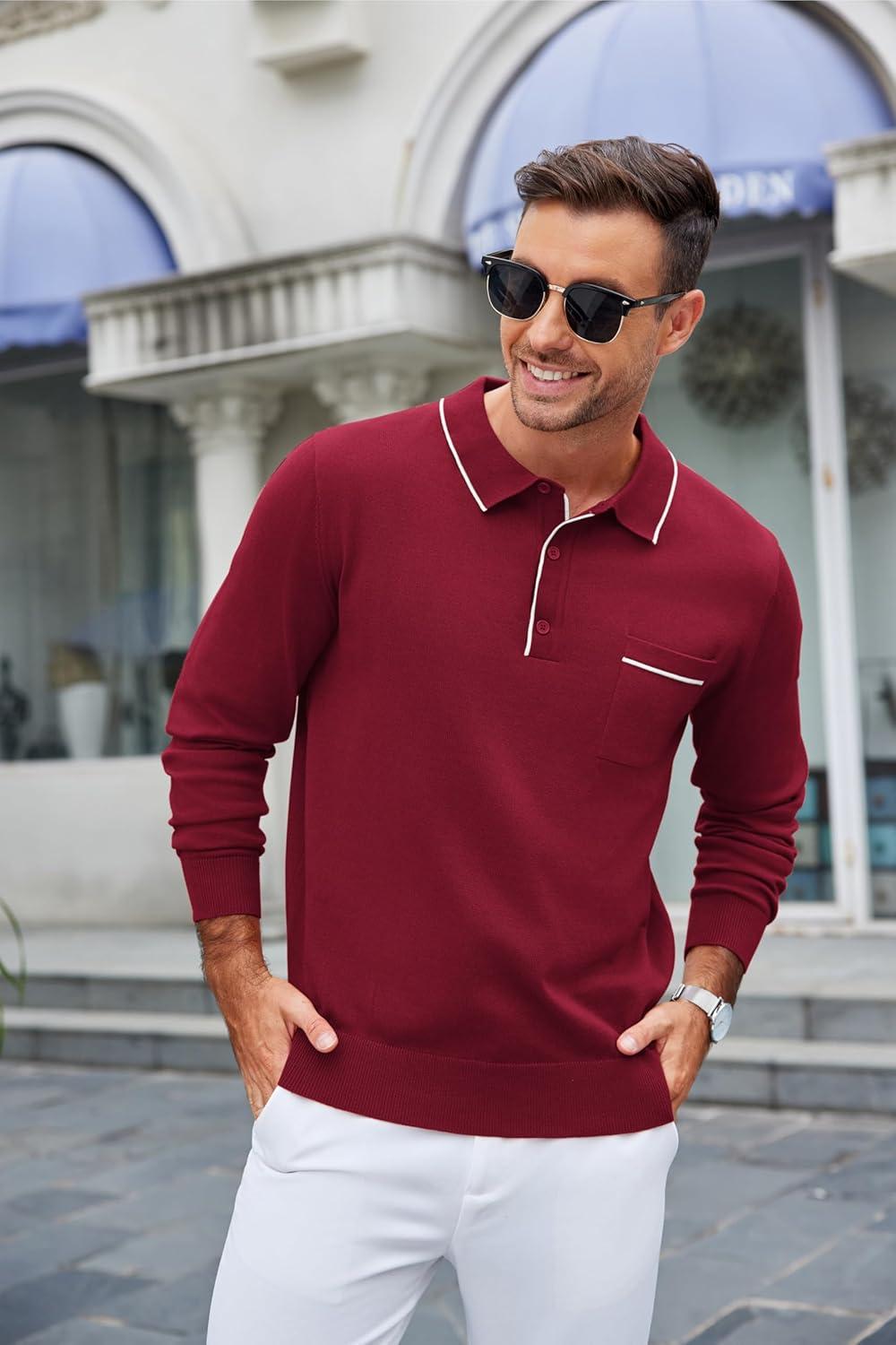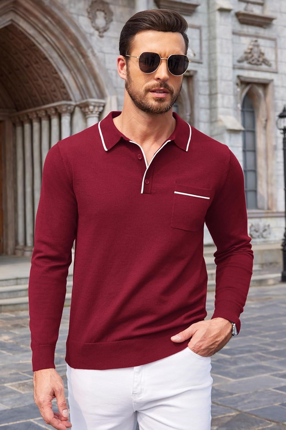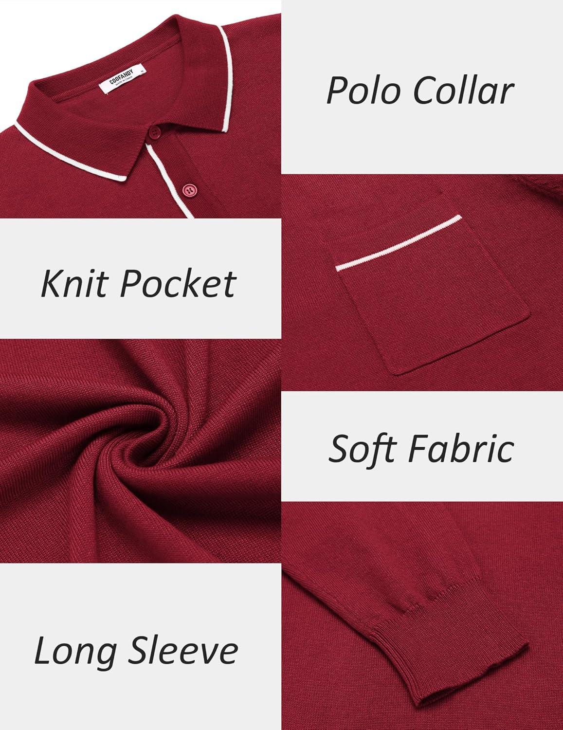 COOFANDY Mens Knit Polo Long Sleeve Collared Sweater Polo Business Casual Polos with Pocket(Wine Red)