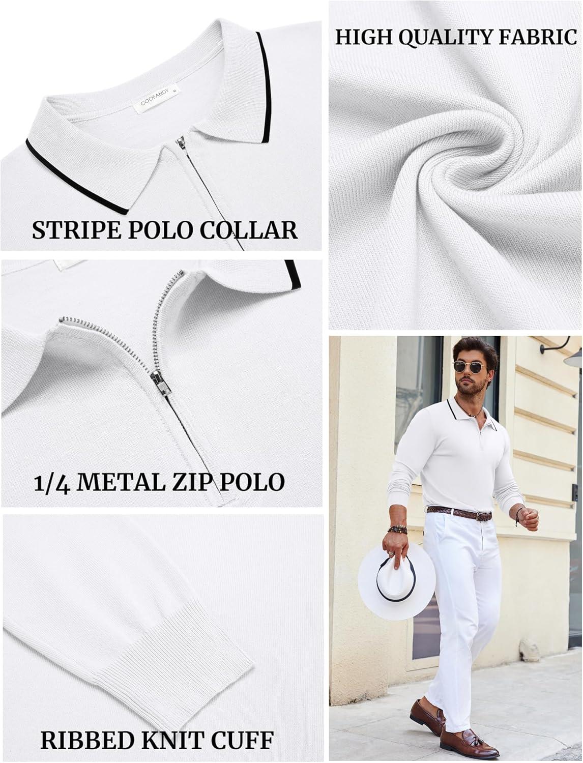 COOFANDY Men’s Knit Polo Shirt Long Sleeve Quarter Zip Polo Sweater Casual Golf Shirts Vintage Striped Collar Polo(All White)