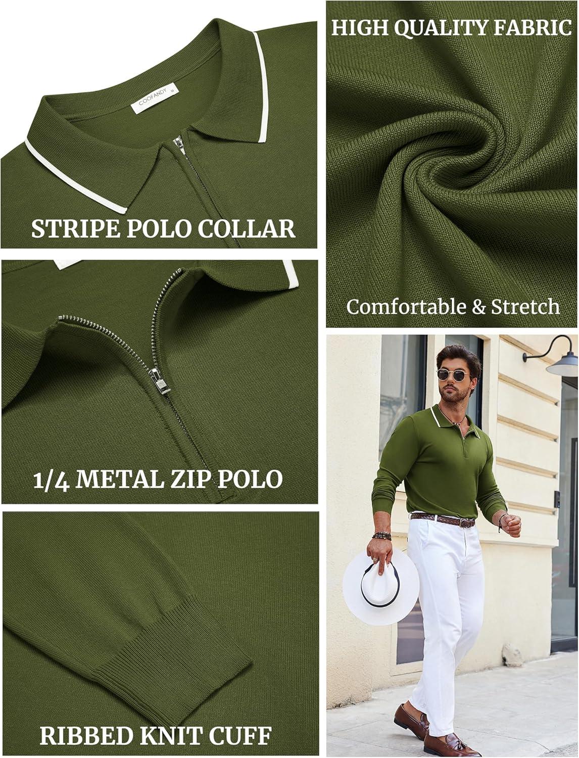 COOFANDY Men’s Knit Polo Shirt Long Sleeve Quarter Zip Polo Sweater Casual Golf Shirts Vintage Striped Collar Polo(Army Green)