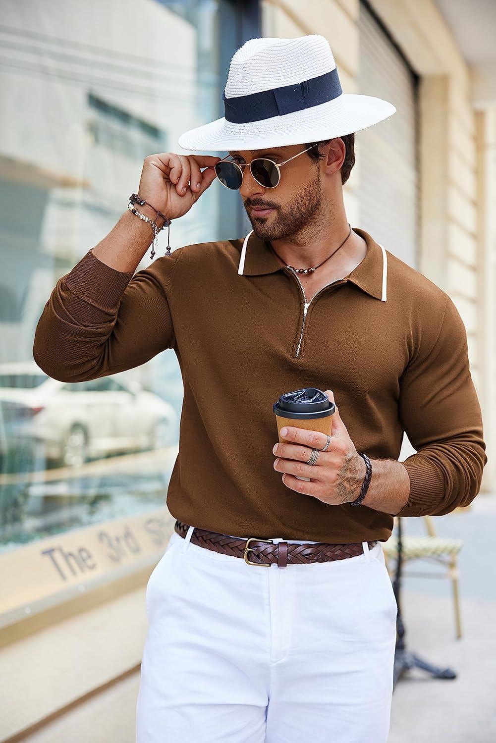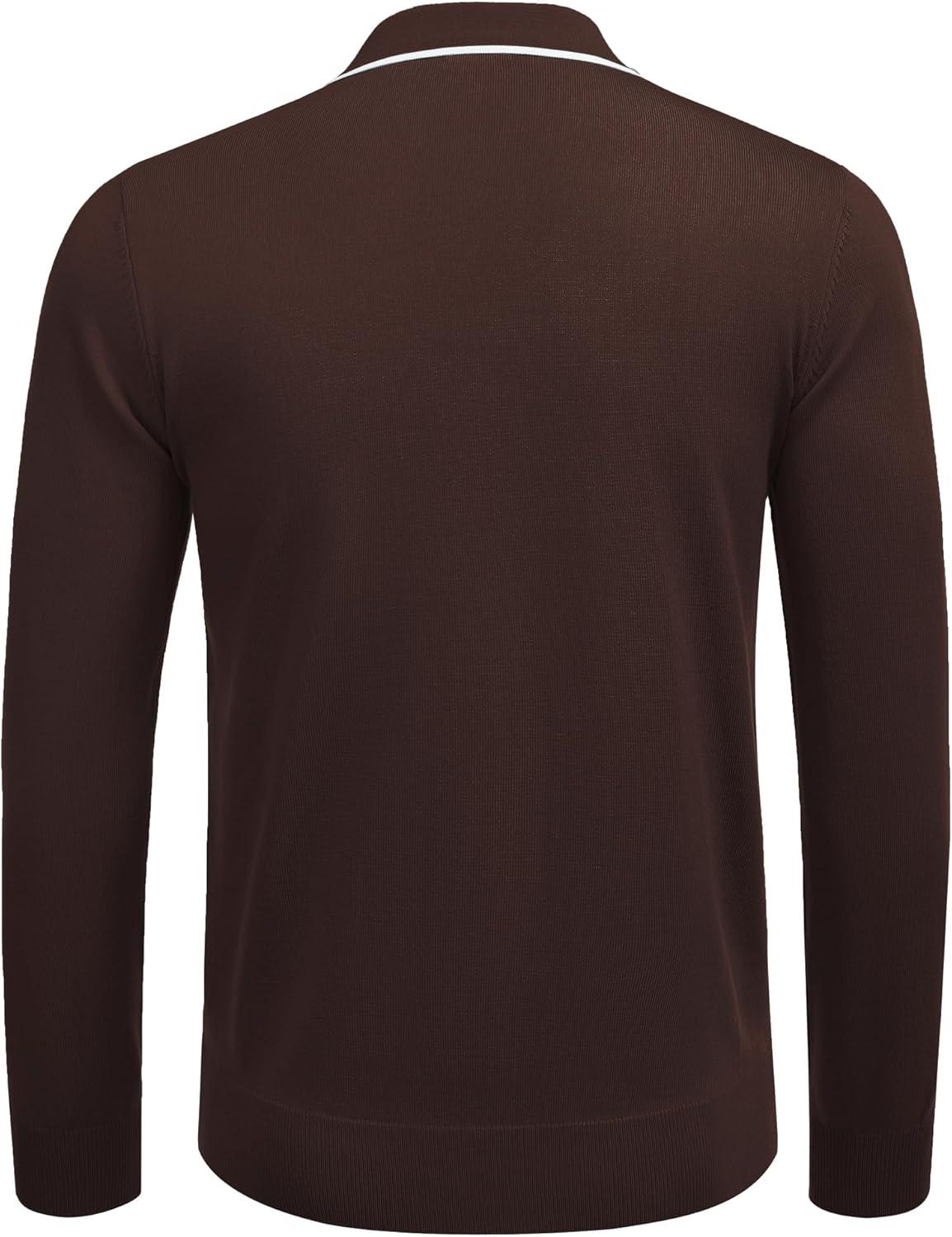 COOFANDY Men’s Knit Polo Shirt Long Sleeve Quarter Zip Polo Sweater Casual Golf Shirts Vintage Striped Collar Polo(Brown)