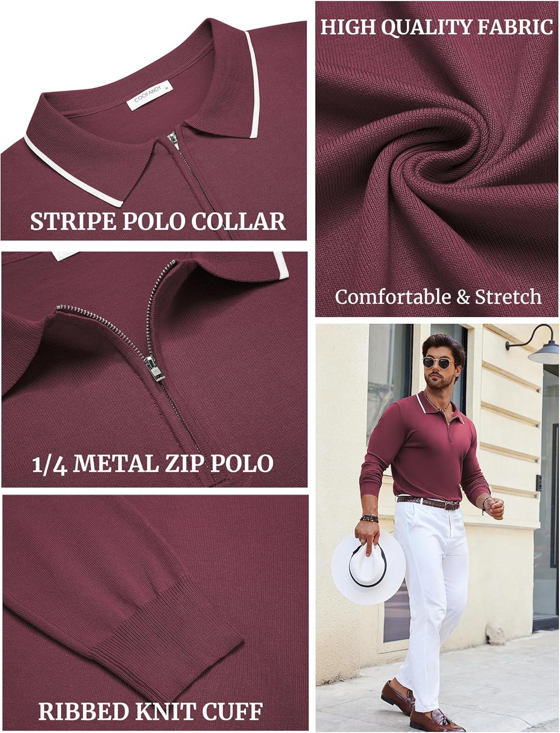 COOFANDY Men’s Knit Polo Shirt Long Sleeve Quarter Zip Polo Sweater Casual Golf Shirts Vintage Striped Collar Polo(Wine Red)