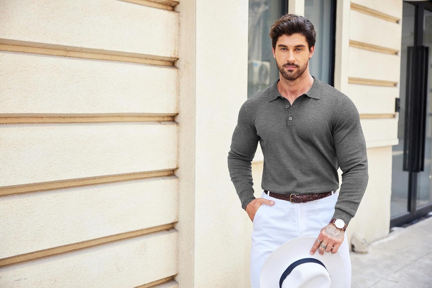 COOFANDY Mens Knit Polo Shirts Casual Long Sleeve Classic Polo Shirts Button Down Golf Shirts(Dark Grey)
