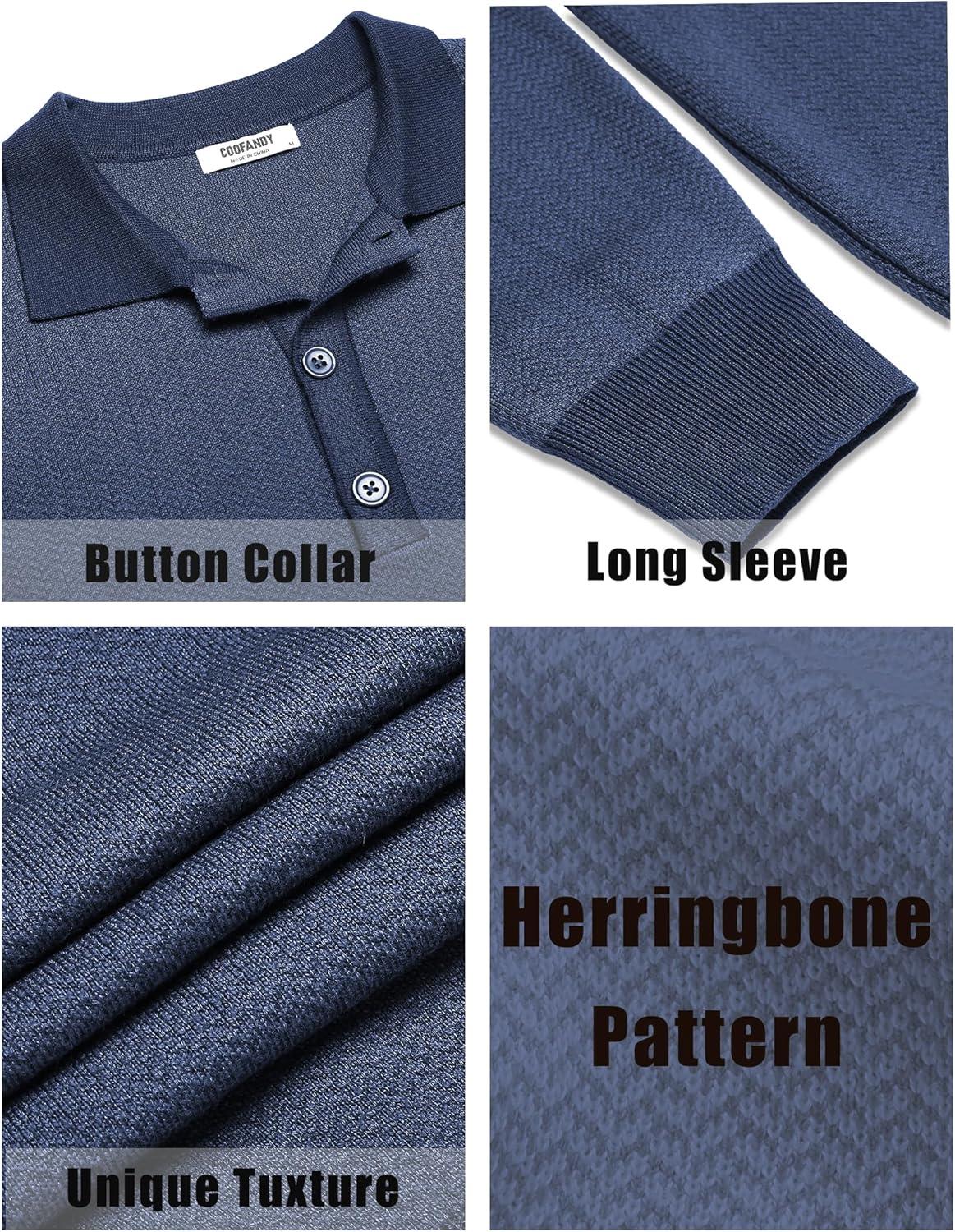 COOFANDY Mens Knit Polo Shirts Casual Long Sleeve Classic Polo Shirts Button Down Golf Shirts(Herringbone Blue)