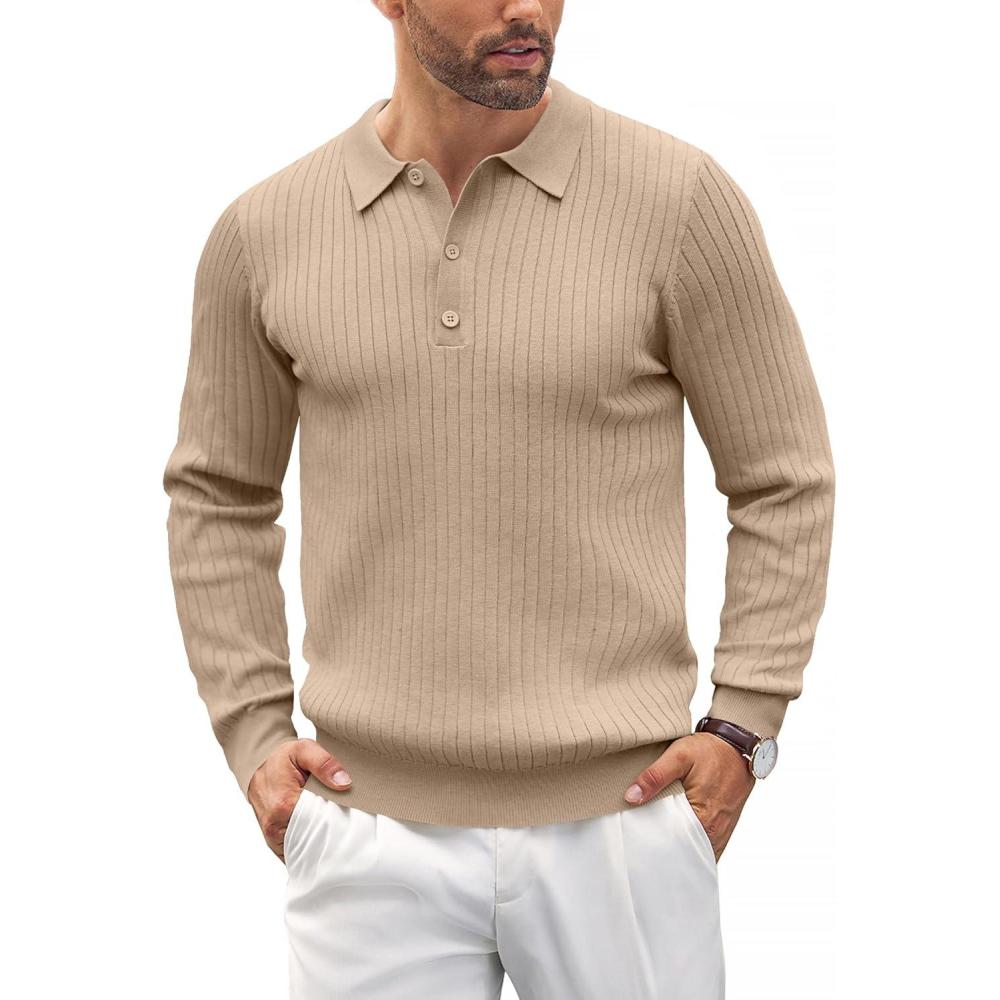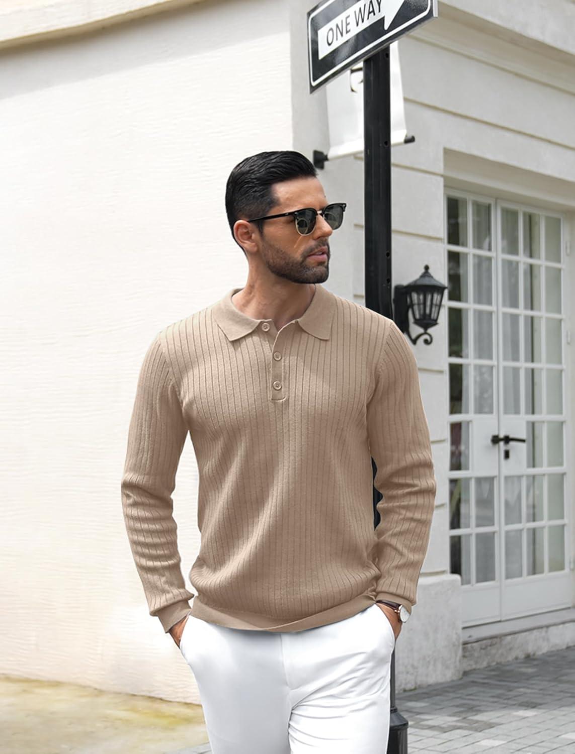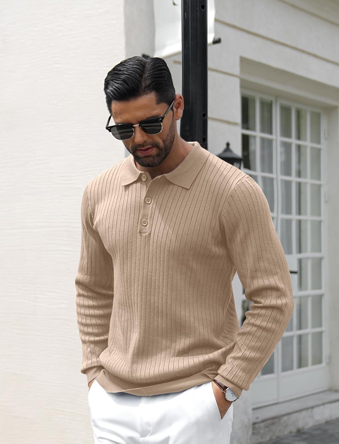 COOFANDY Mens Knit Polo Shirts Casual Long Sleeve Classic Polo Shirts Button Down Golf Shirts(Ribbed Khaki)