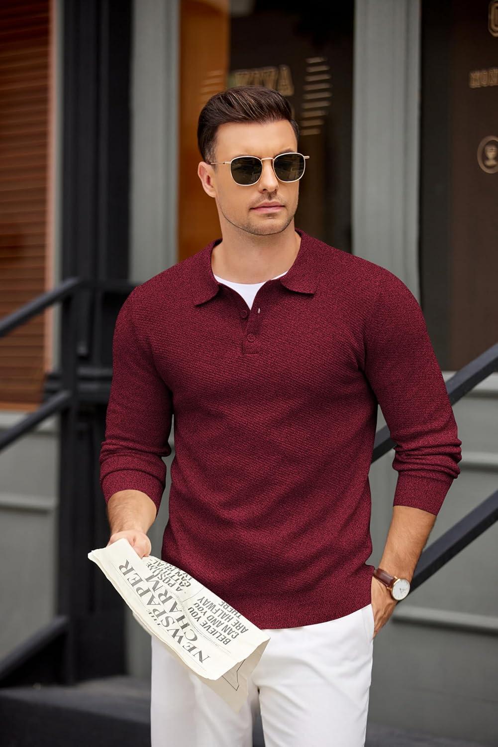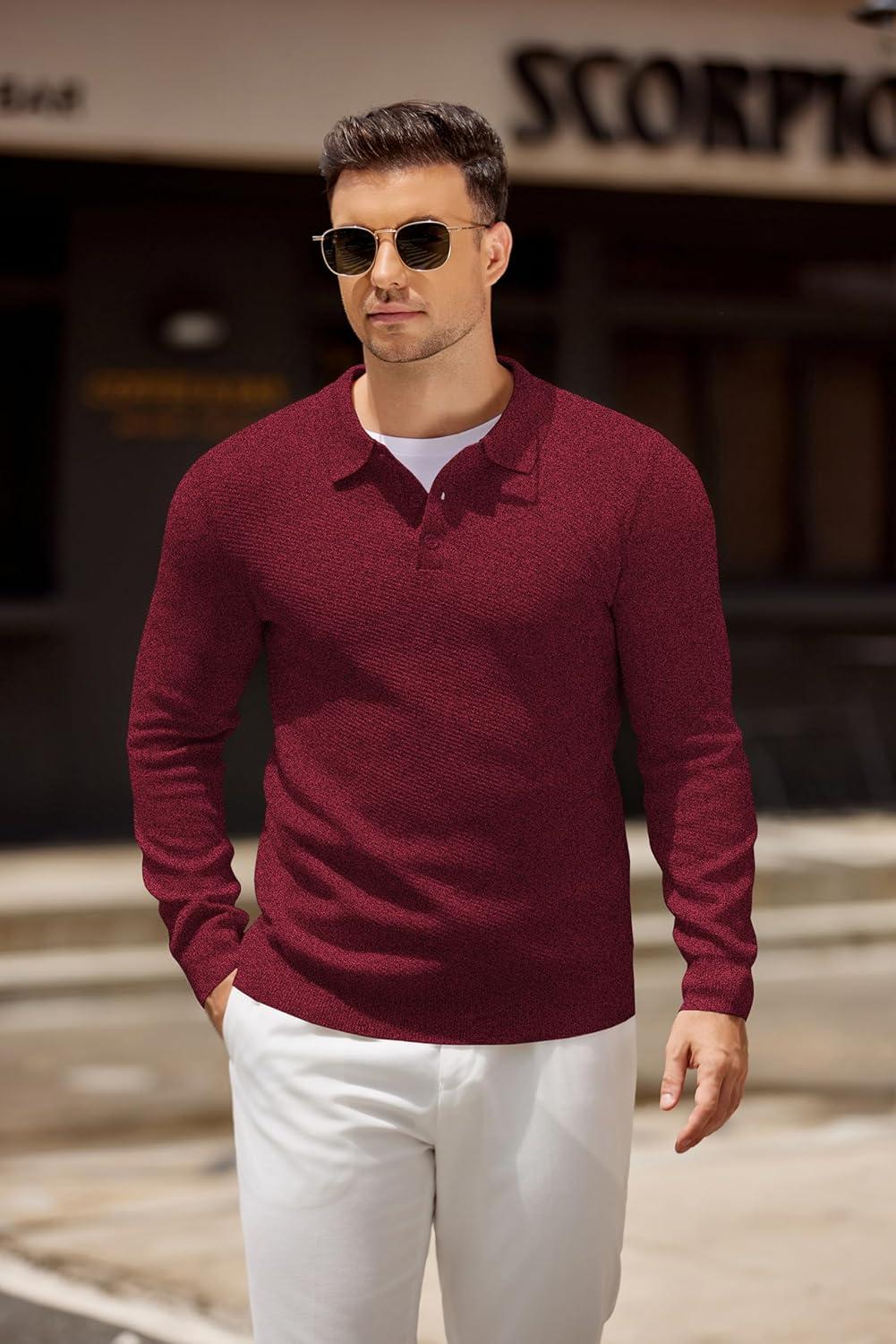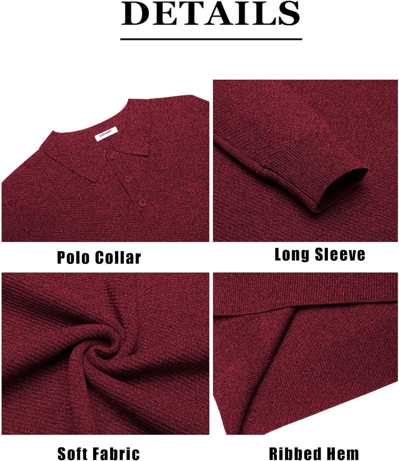COOFANDY Men’s Knit Polo Shirts Casual Long Sleeve Collared Pullover Sweaters Quarter Button Ribbed Vintage Polo Sweater(Wine Red)