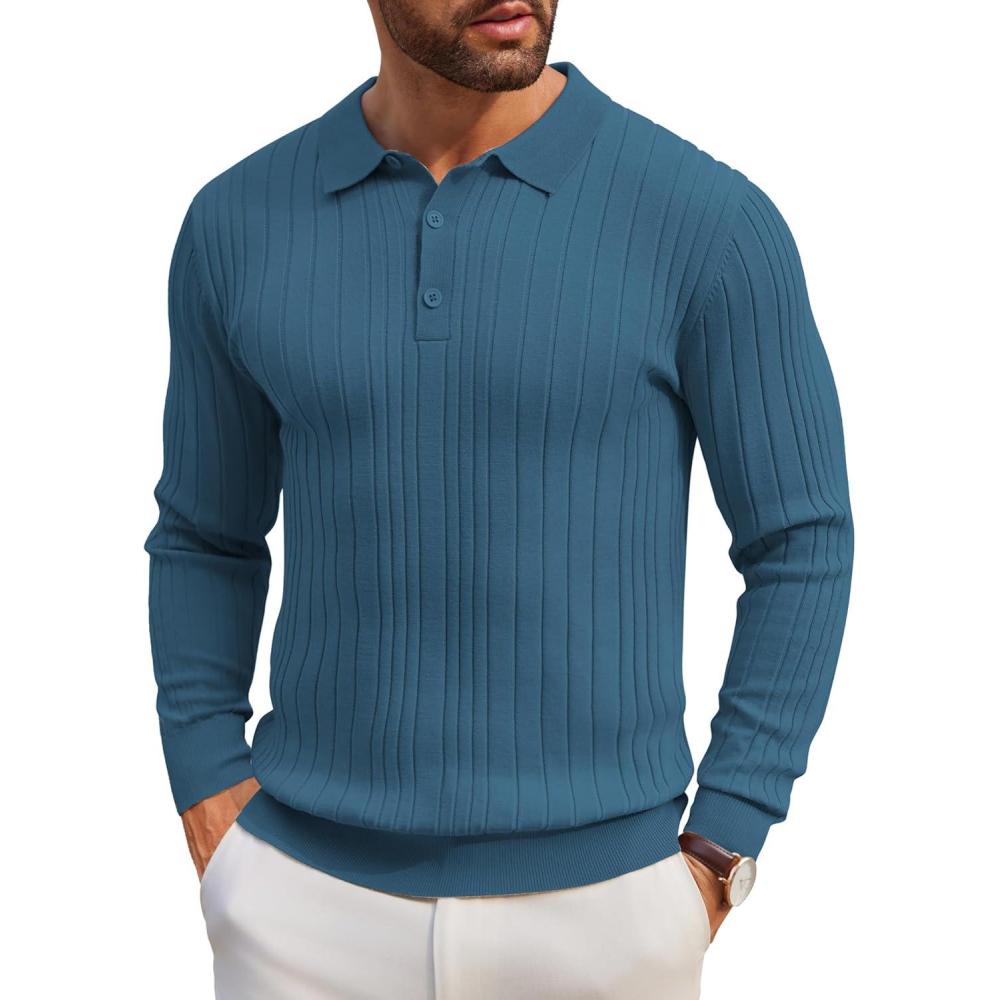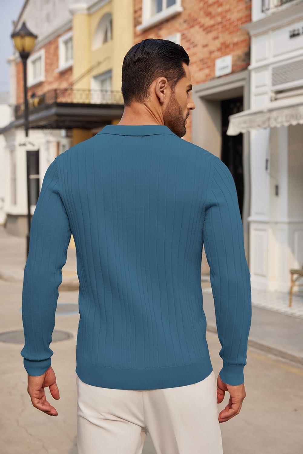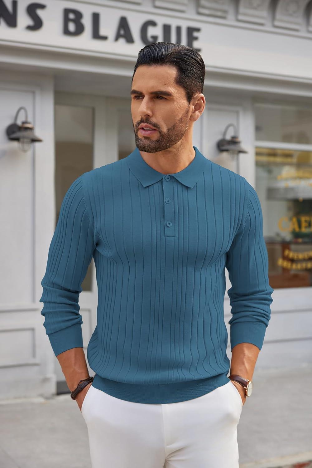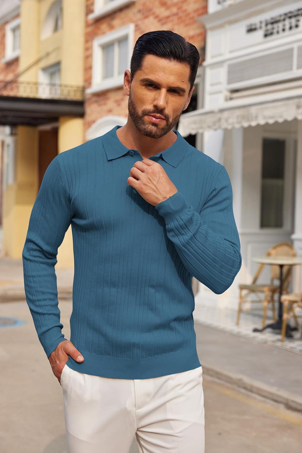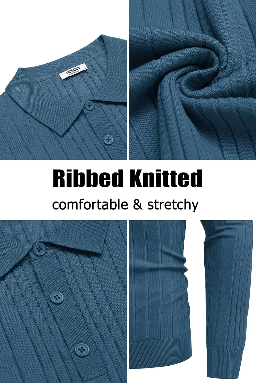 COOFANDY Men’s Knit Polo Shirts Long Sleeve Casual Button Down Ribbed Polo Shirt Fashion Golf Shirts(Blue)