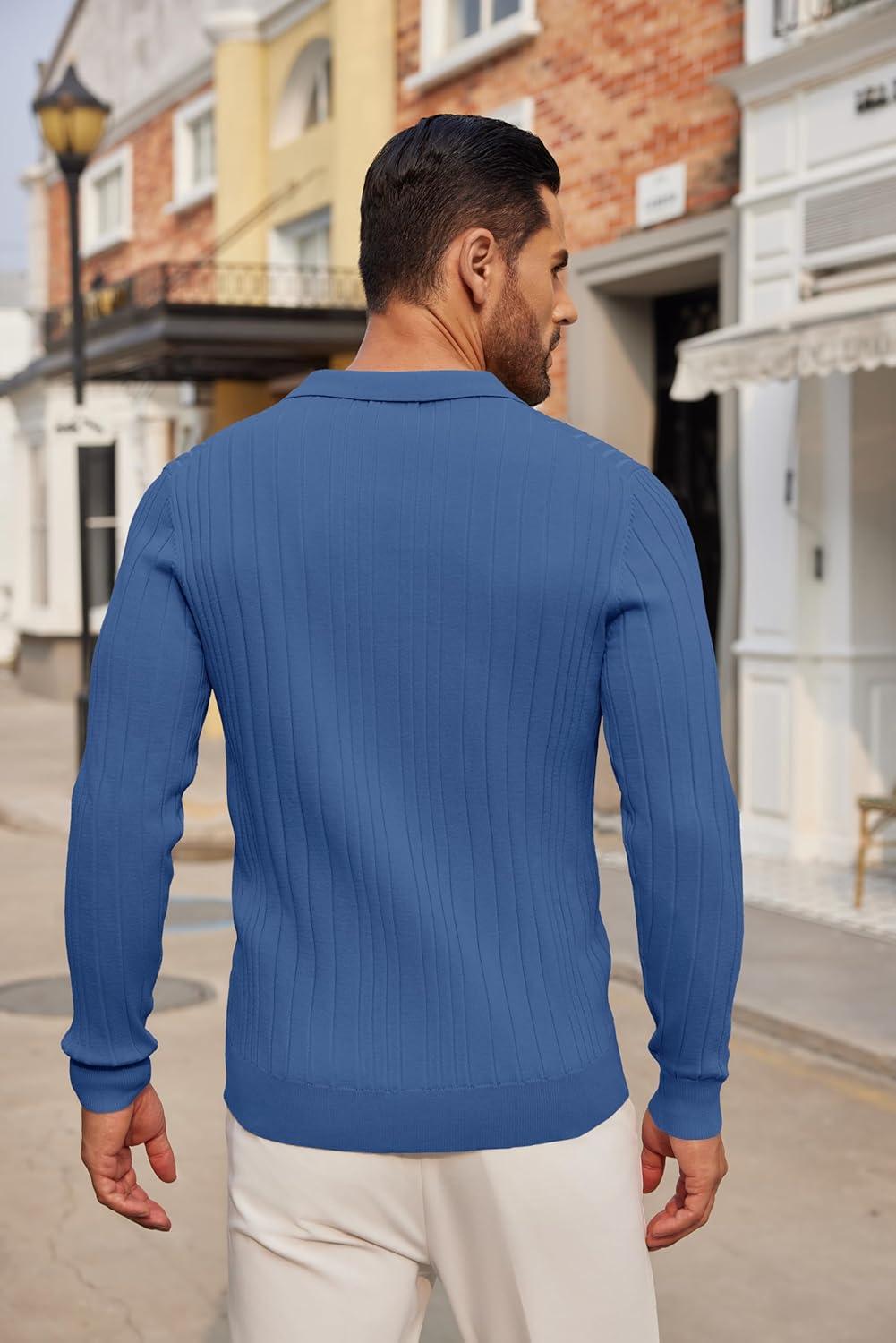 COOFANDY Men’s Knit Polo Shirts Long Sleeve Casual Button Down Ribbed Polo Shirt Fashion Golf Shirts(Denim Blue)