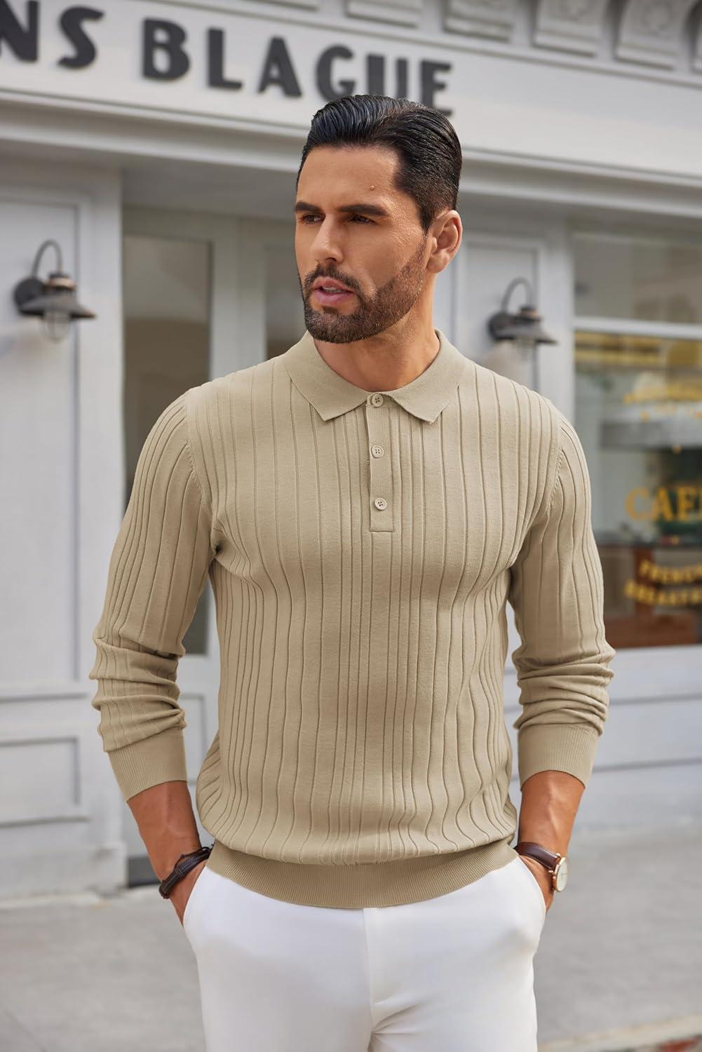 COOFANDY Men’s Knit Polo Shirts Long Sleeve Casual Button Down Ribbed Polo Shirt Fashion Golf Shirts(Khaki)