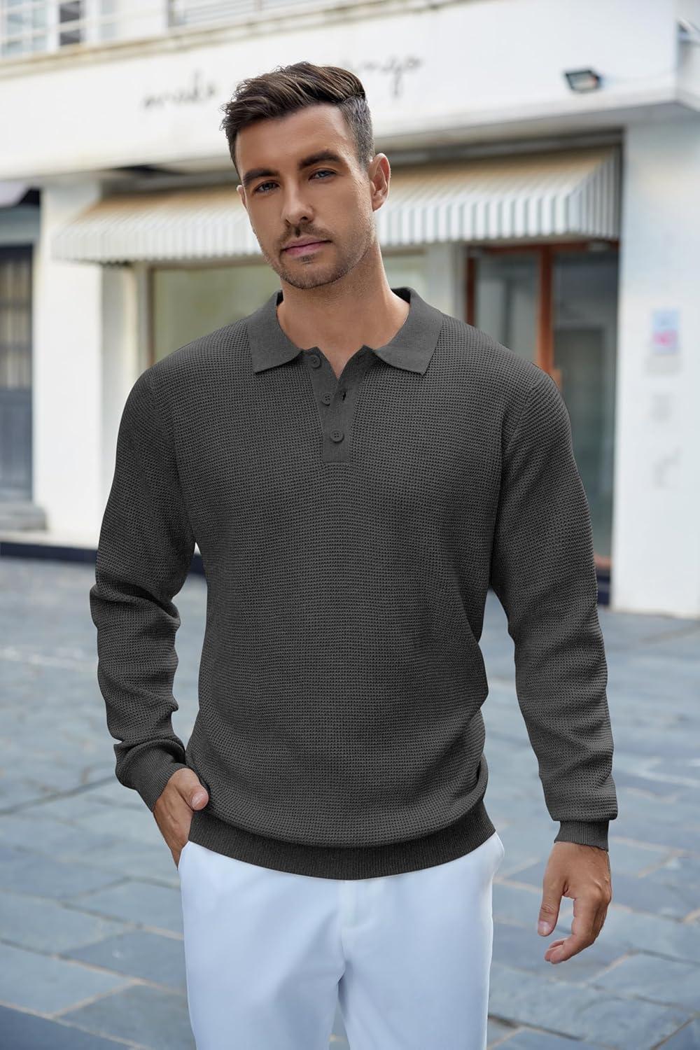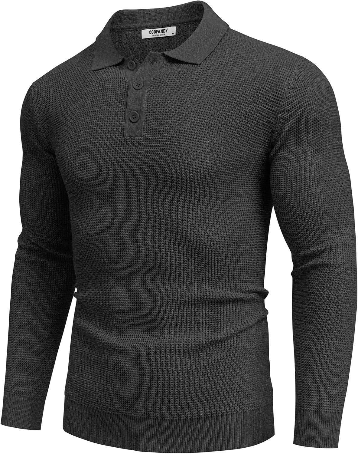 COOFANDY Mens Knit Polo Shirts Long Sleeve Sweater Casual Polo Shirts Lightweight Collared T Shirts(Dark Grey)