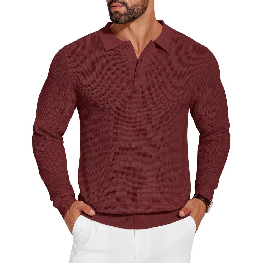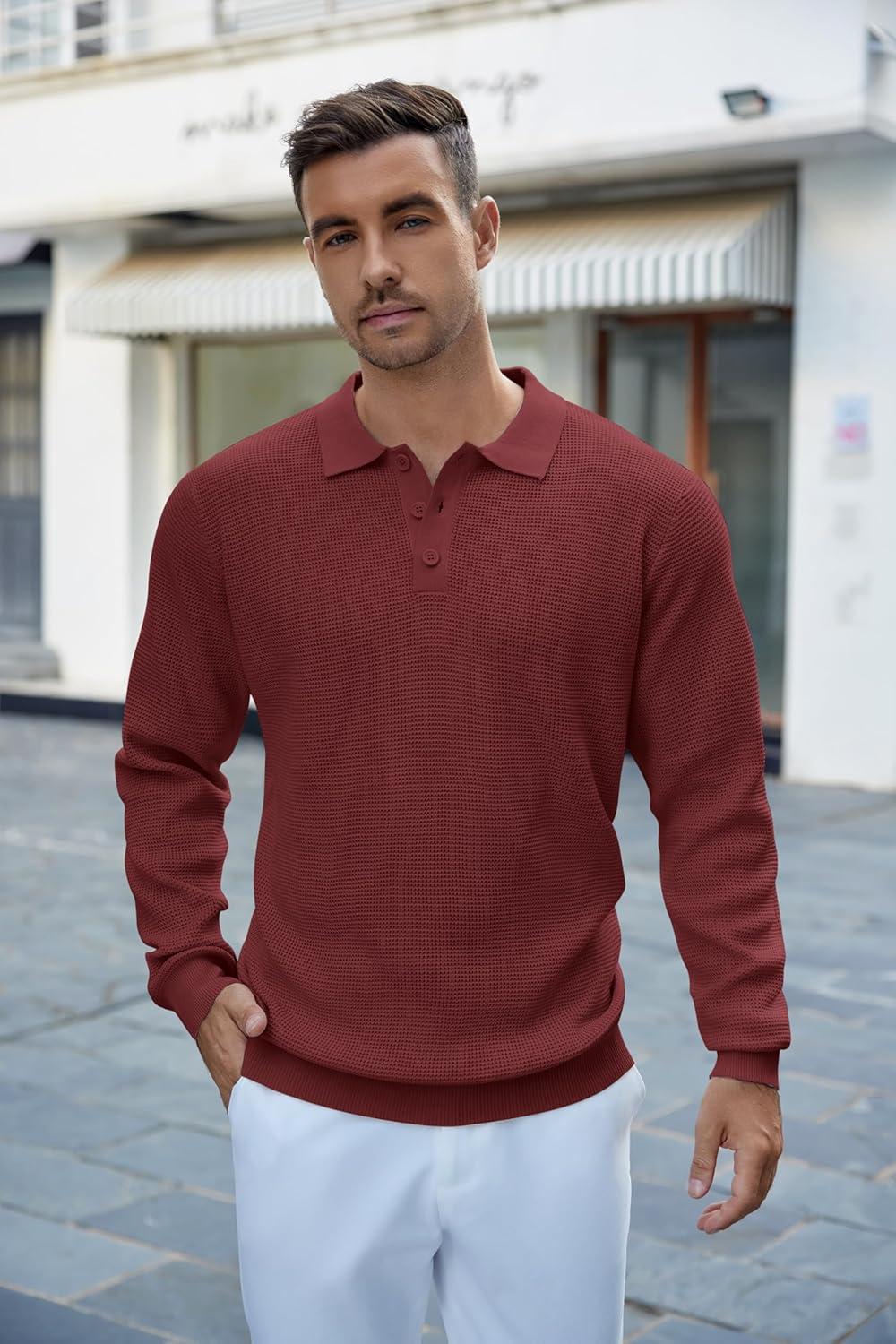 COOFANDY Mens Knit Polo Shirts Long Sleeve Sweater Casual Polo Shirts Lightweight Collared T Shirts(Wine Red)
