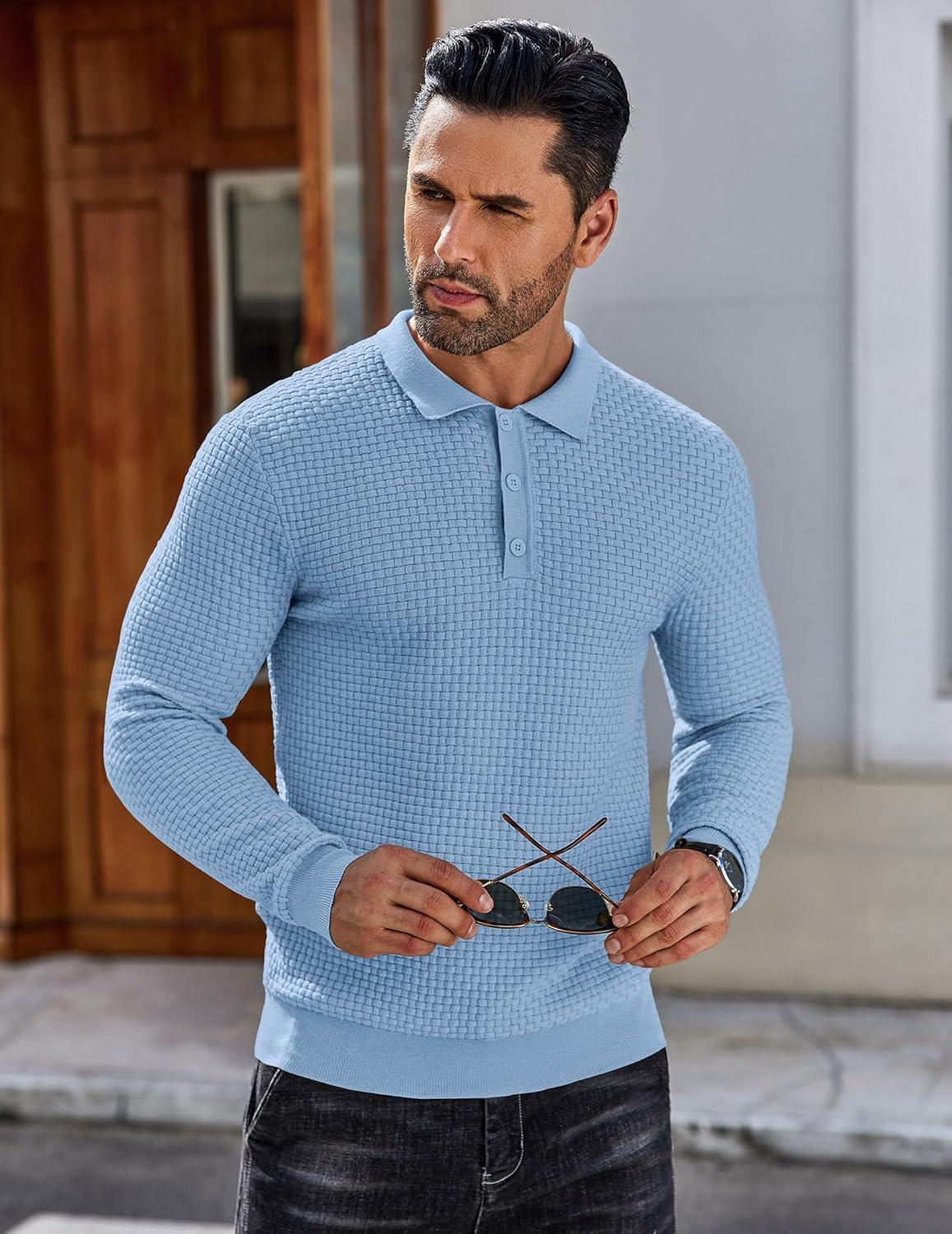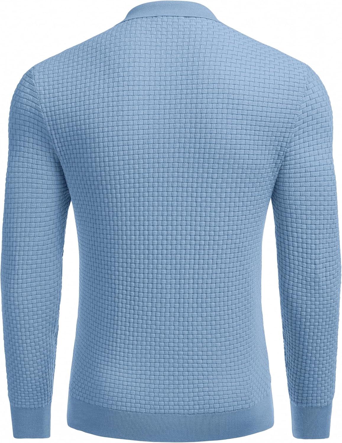 COOFANDY Men’s Knit Polo Shirts Long Sleeve Sweater Polo Lightweight Fashion Casual Collared Shirts(Airy Blue)