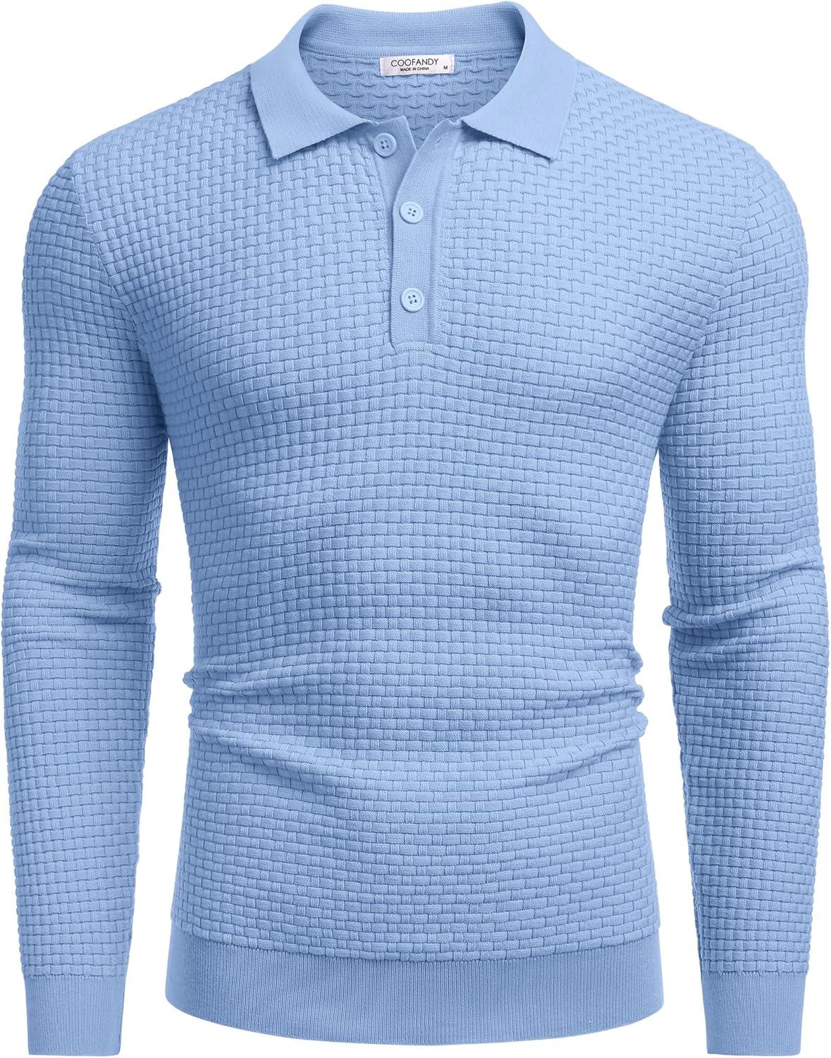 COOFANDY Men’s Knit Polo Shirts Long Sleeve Sweater Polo Lightweight Fashion Casual Collared Shirts(Light Blue)
