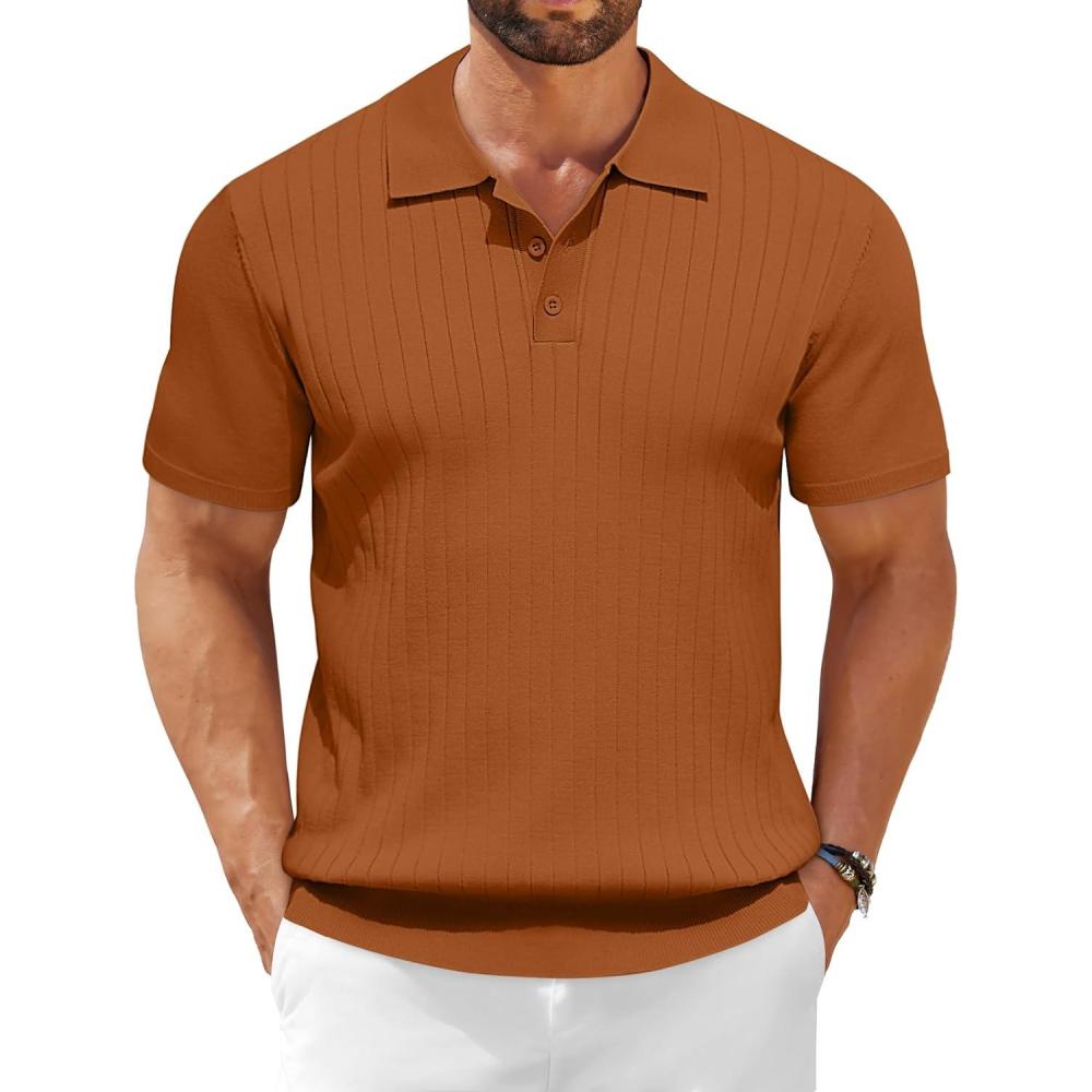 COOFANDY Men’s Knit Polo Shirts Short Sleeve Ribbed Knitted Shirt Summer Lightweight Casual Golf Shirts(Brown)