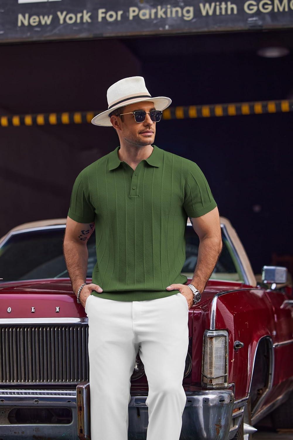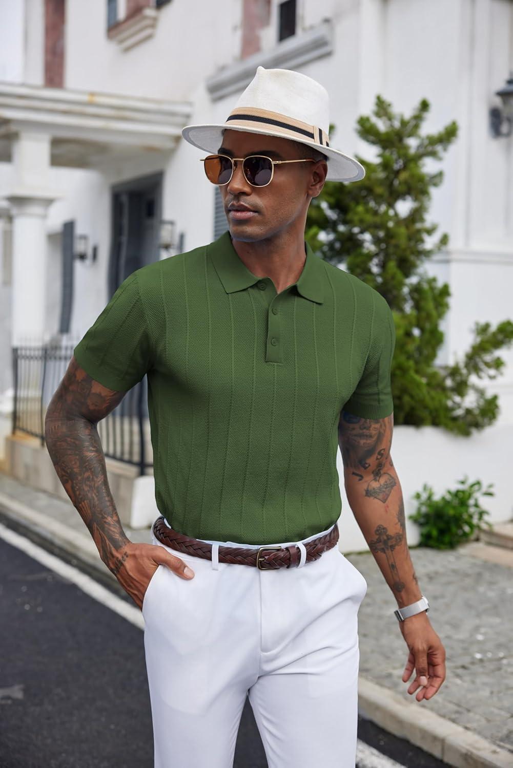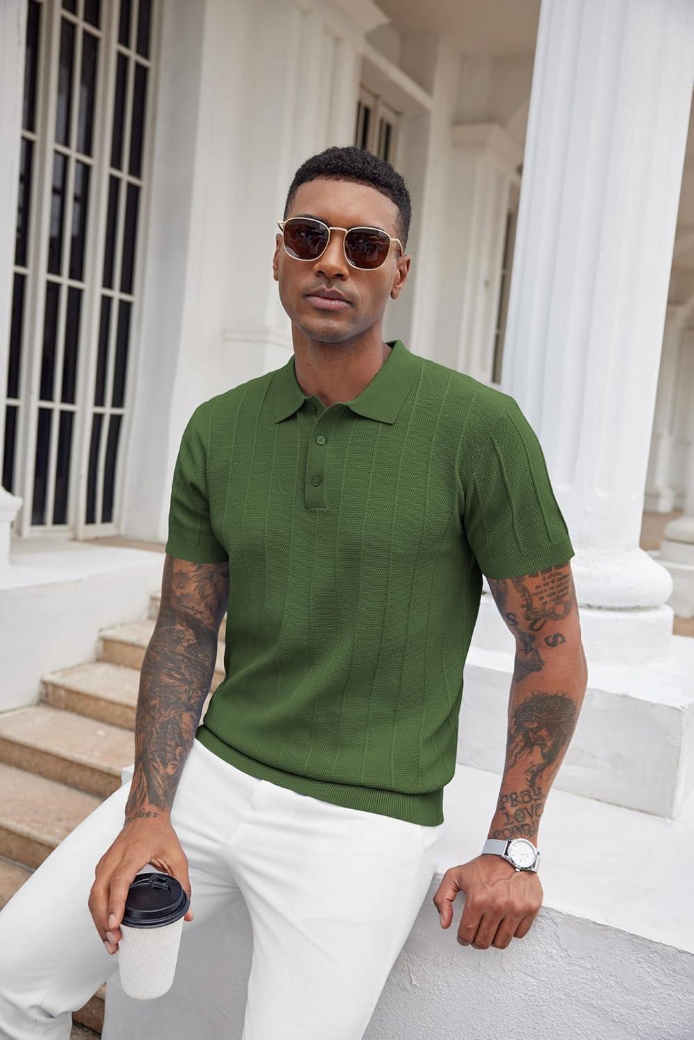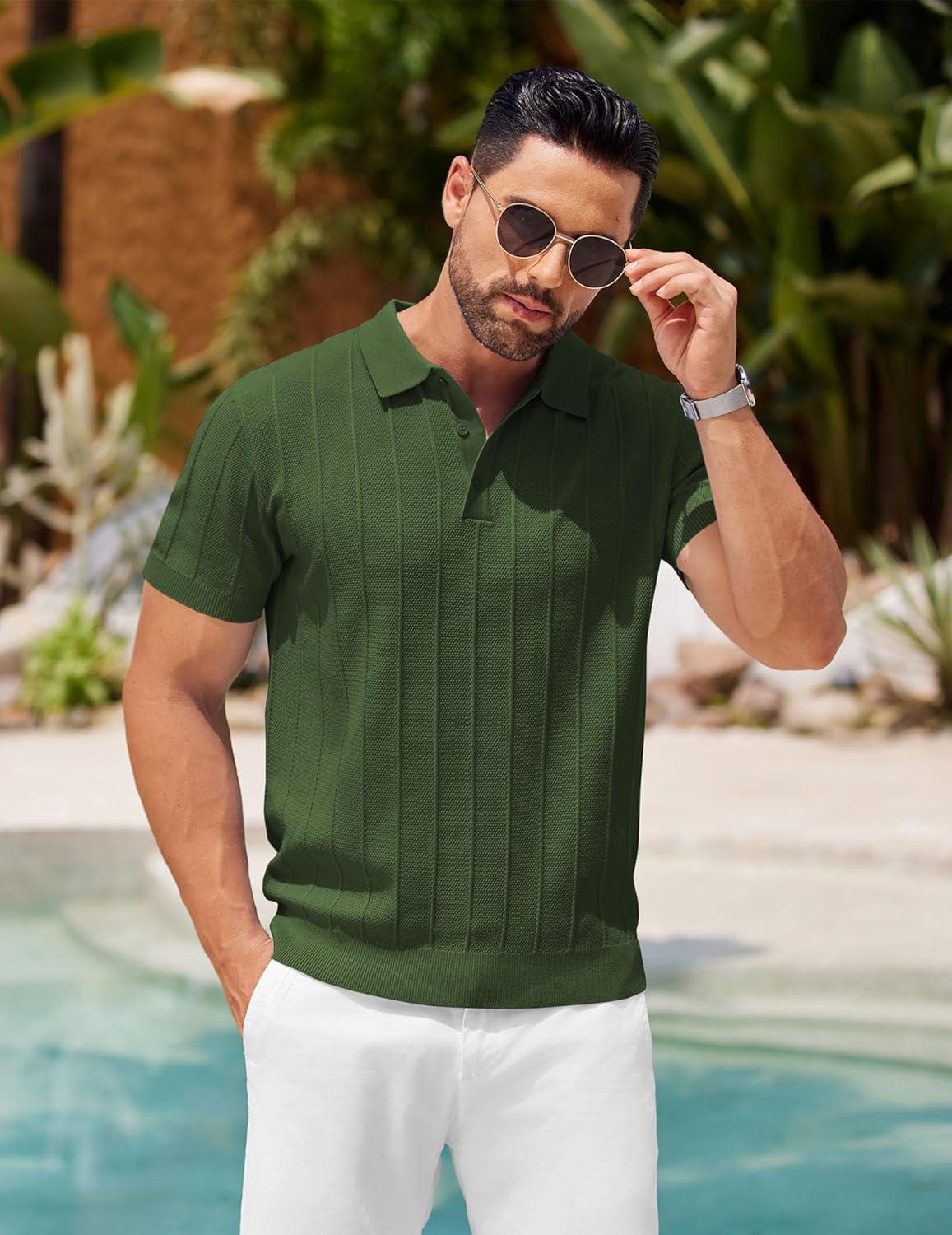COOFANDY Mens Knit Polo Shirts Short Sleeve Ribbed Textured Polo Shirt Lightweight Casual Golf Shirts Collared T Shirt(Army Green)