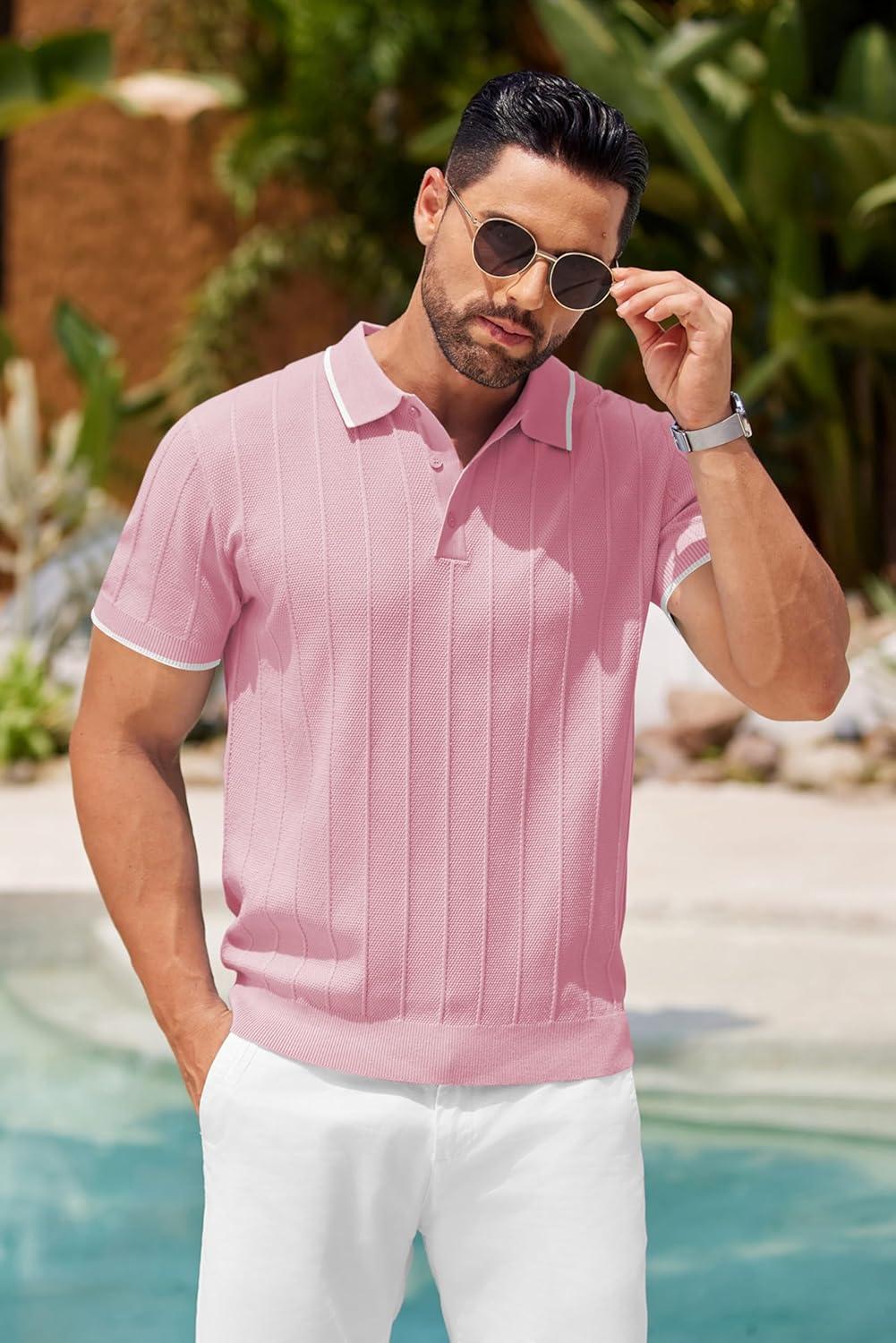 COOFANDY Mens Knit Polo Shirts Short Sleeve Ribbed Textured Polo Shirt Lightweight Casual Golf Shirts Collared T Shirt(Dark Pink White Striped)