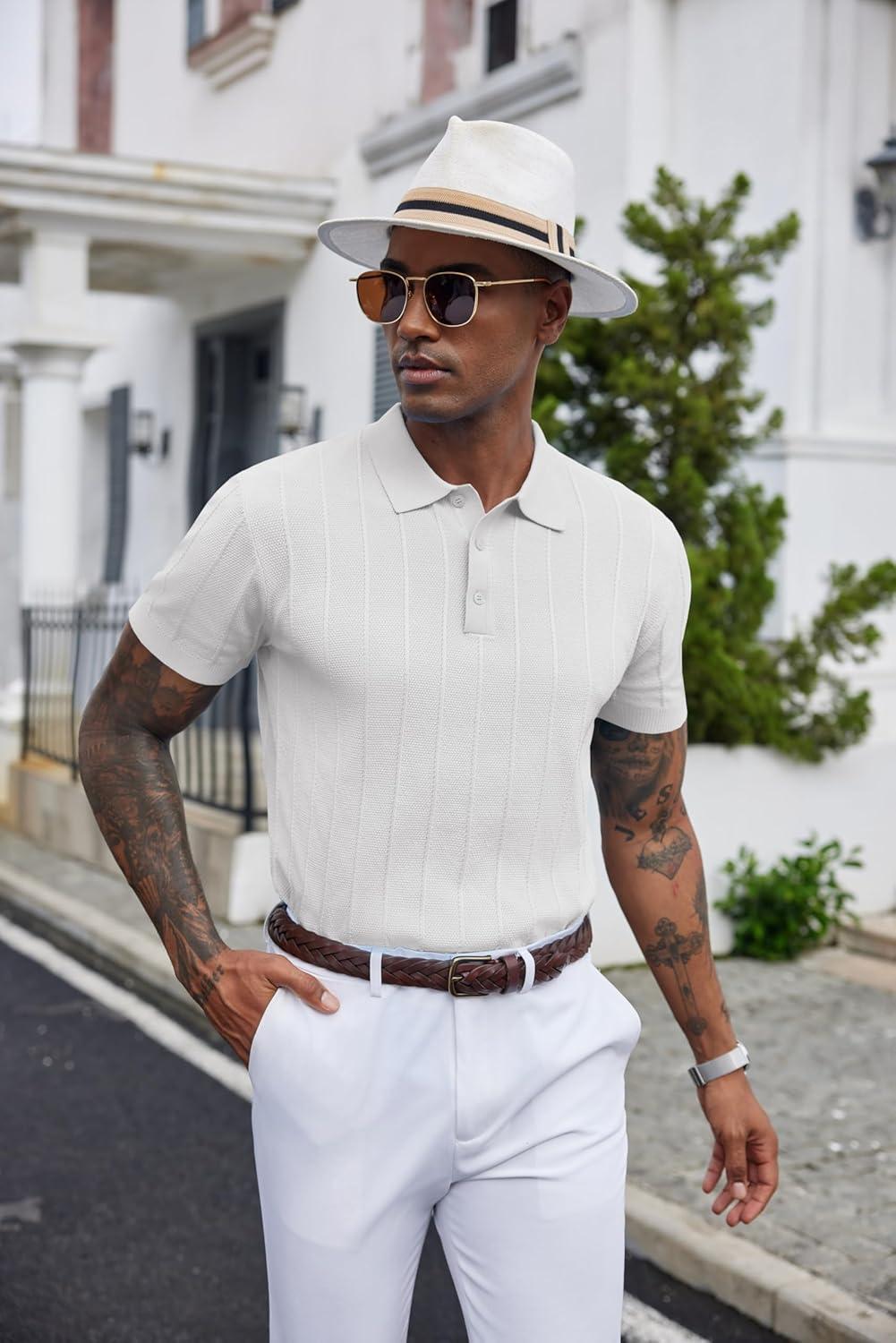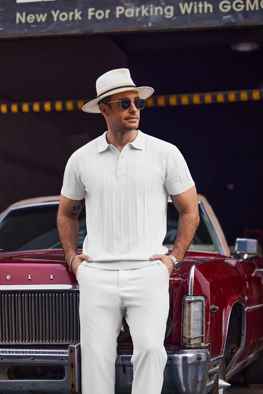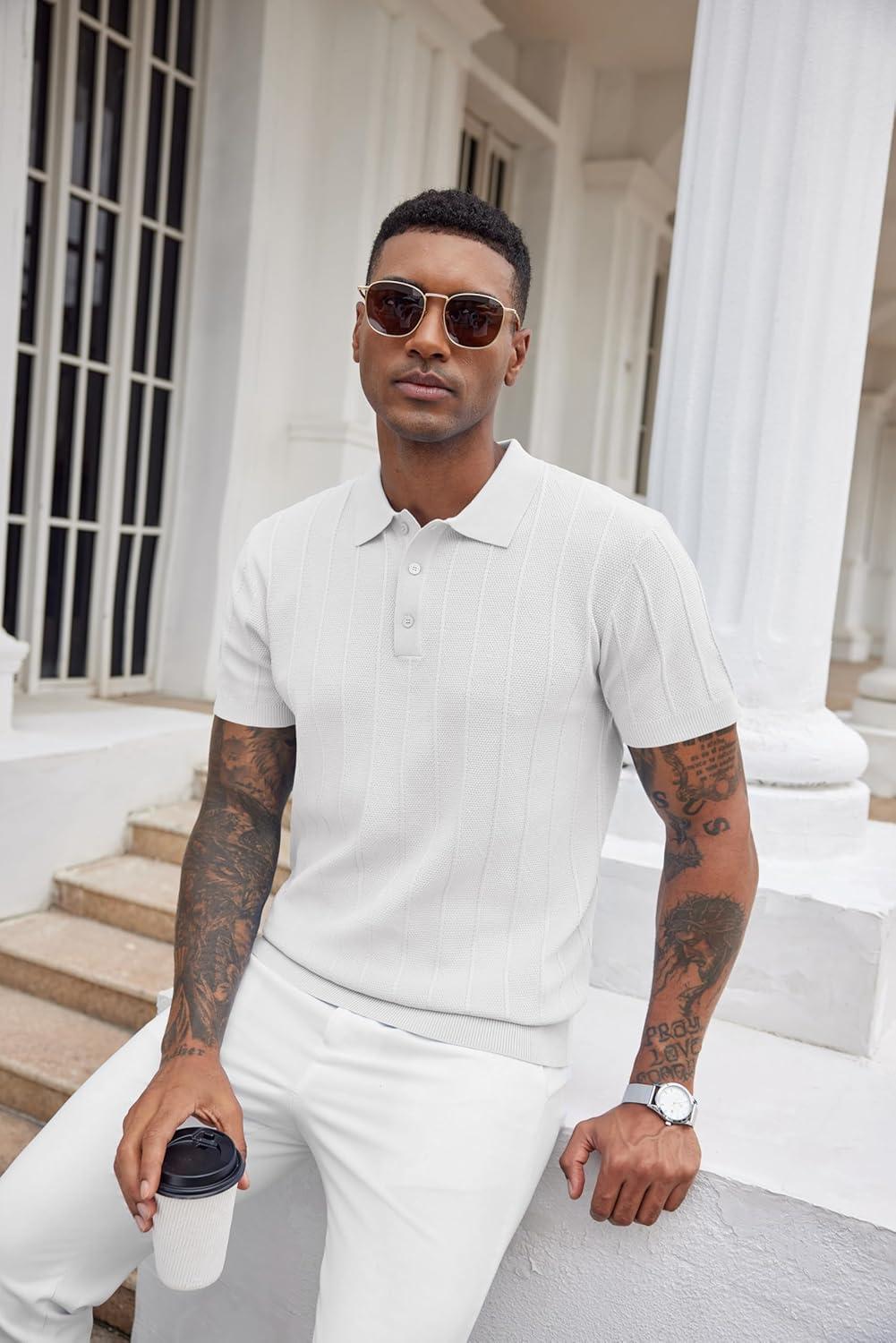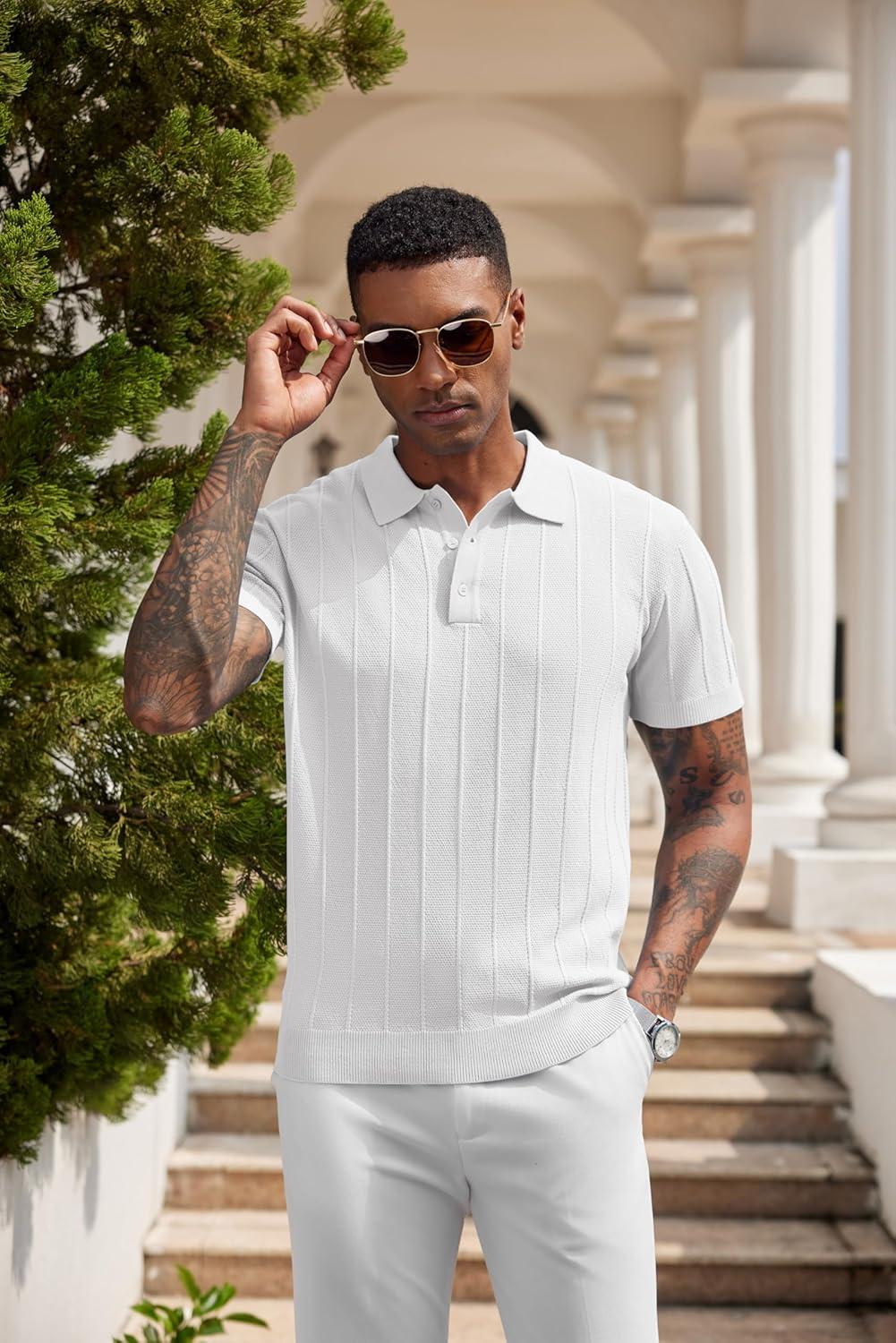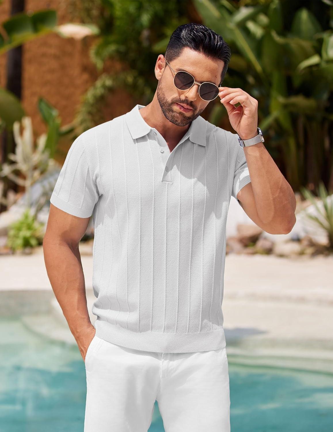 COOFANDY Mens Knit Polo Shirts Short Sleeve Ribbed Textured Polo Shirt Lightweight Casual Golf Shirts Collared T Shirt(White)