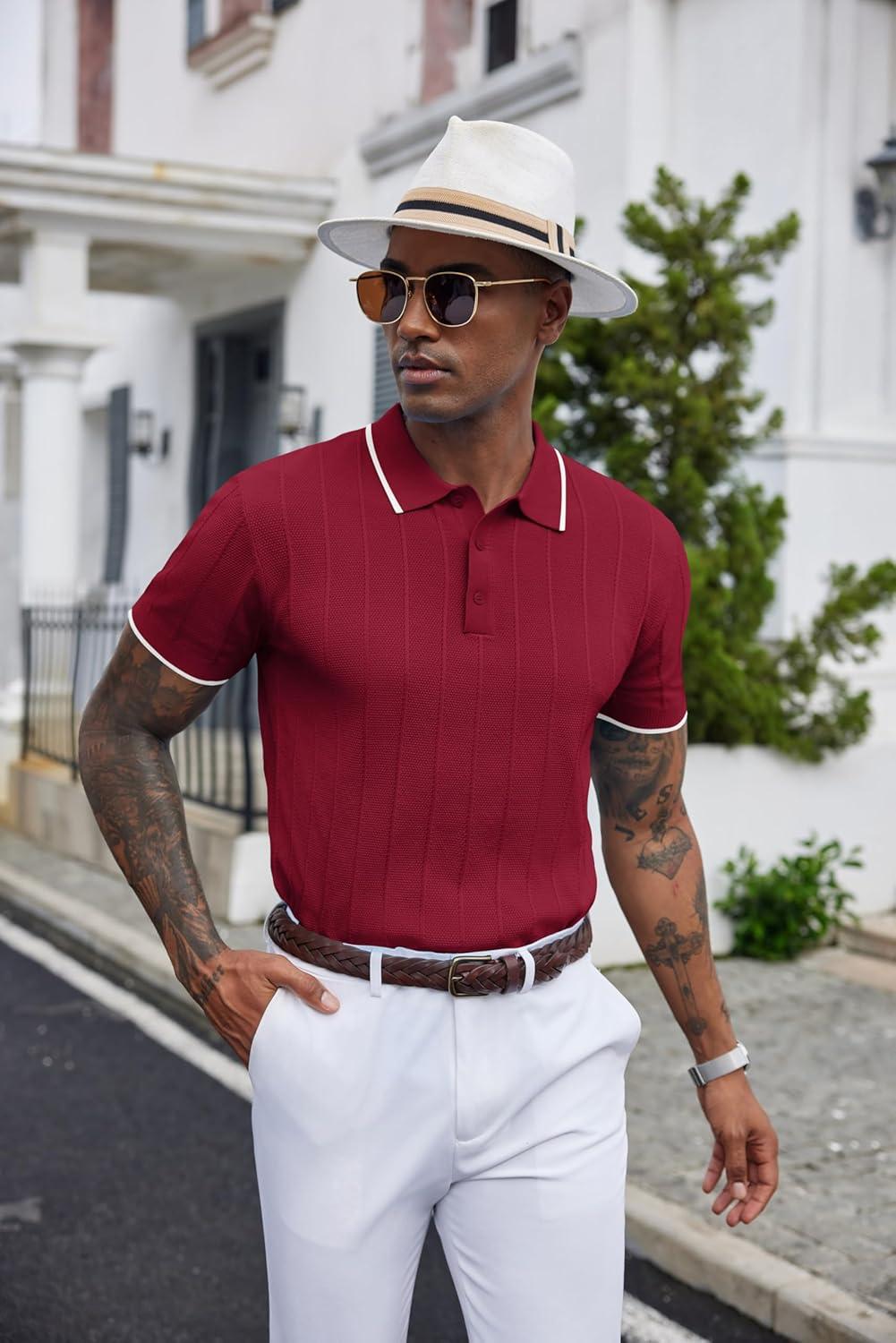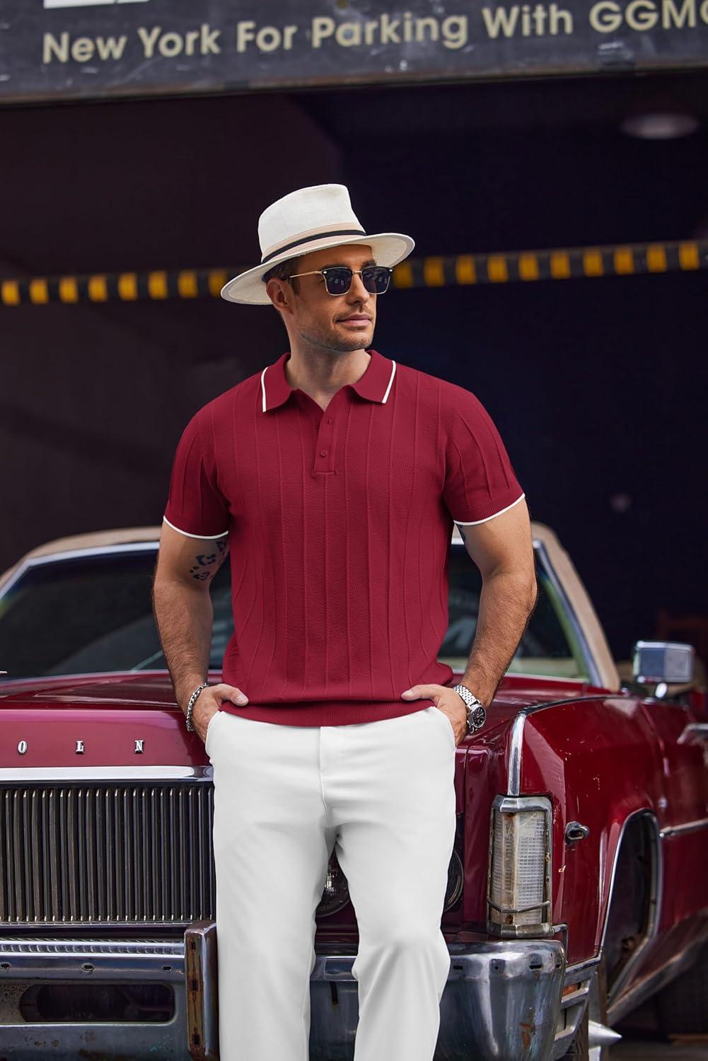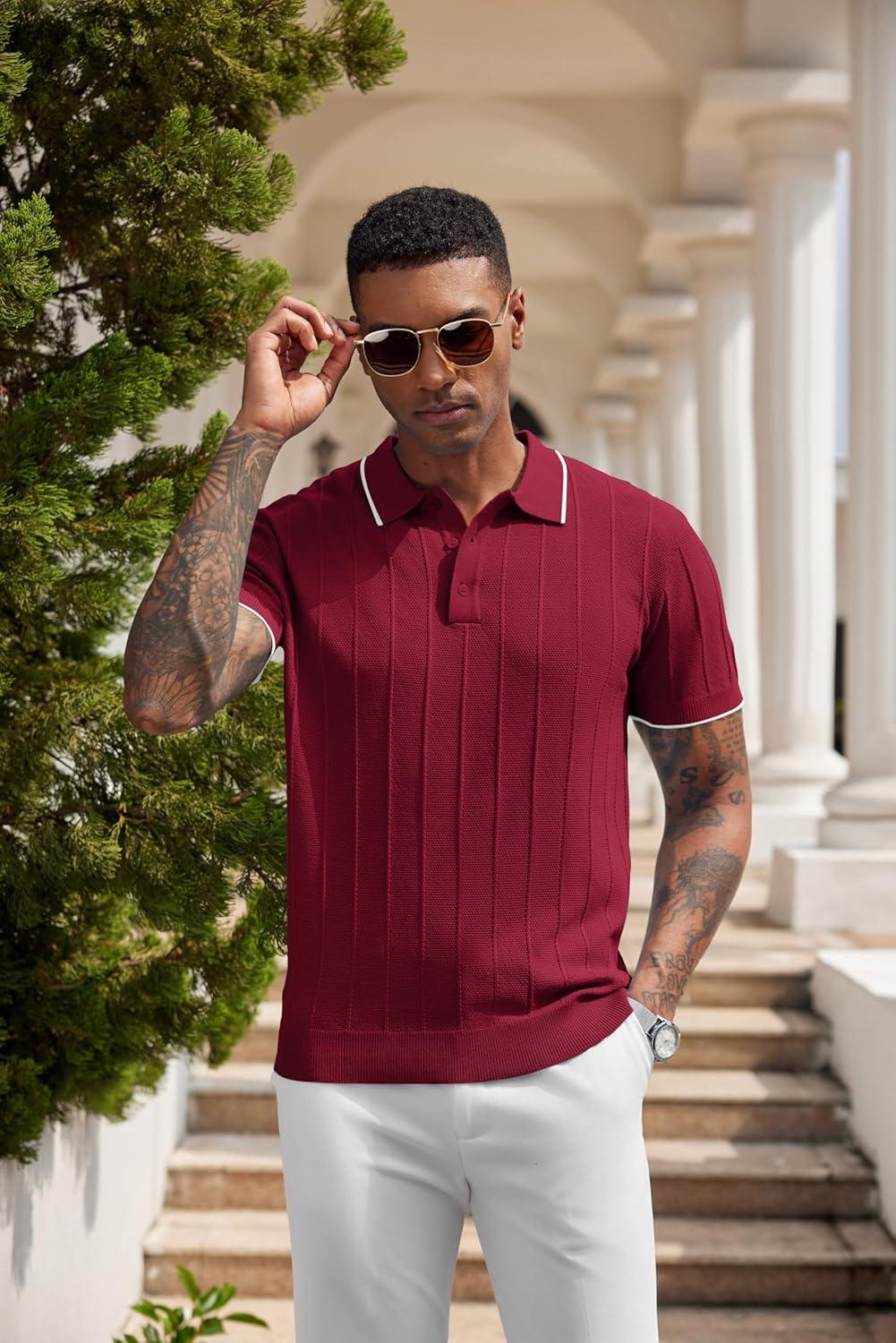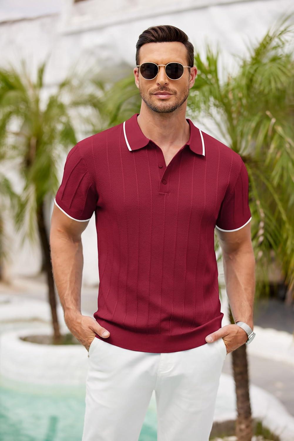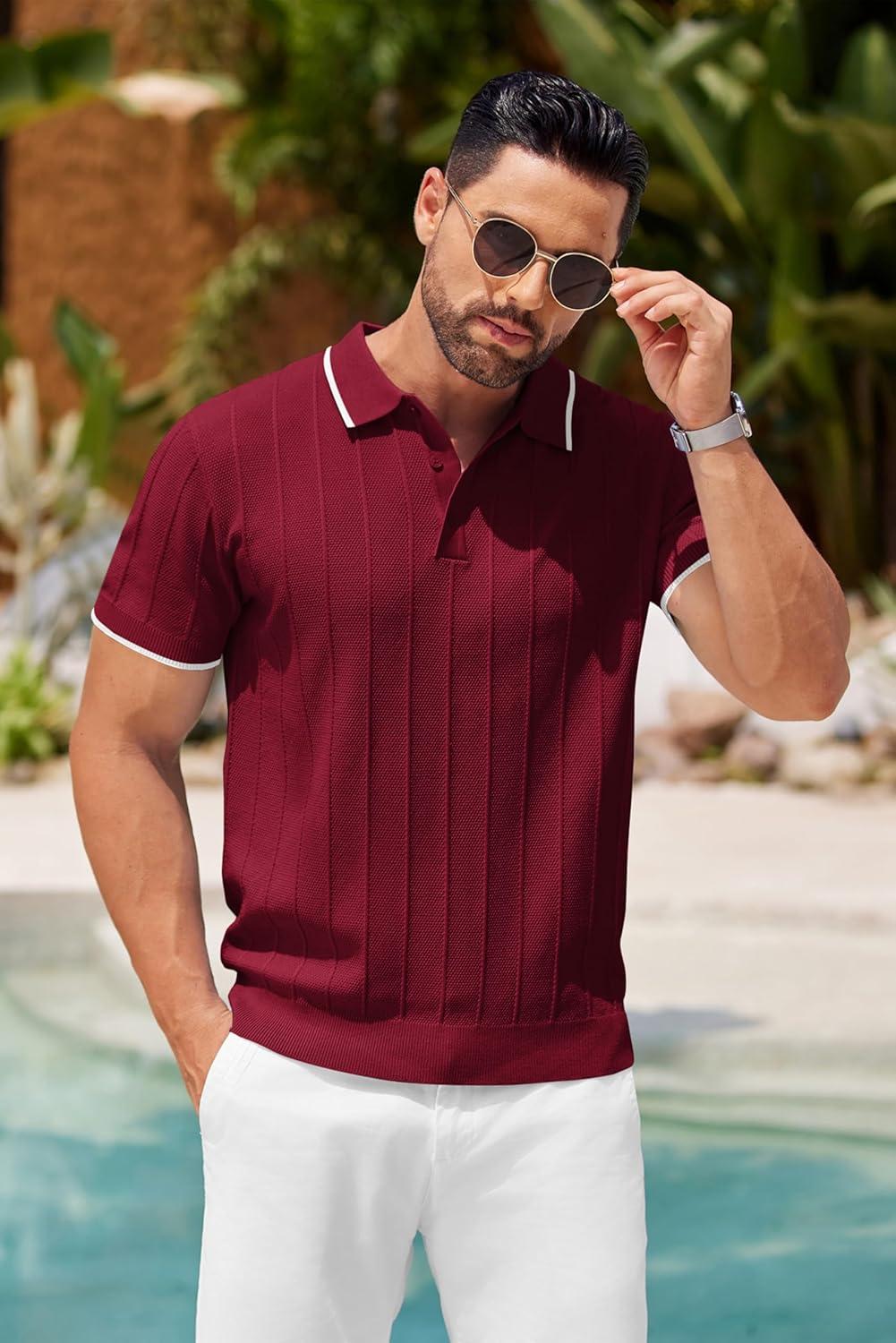 COOFANDY Mens Knit Polo Shirts Short Sleeve Ribbed Textured Polo Shirt Lightweight Casual Golf Shirts Collared T Shirt(Wine Red White Striped)