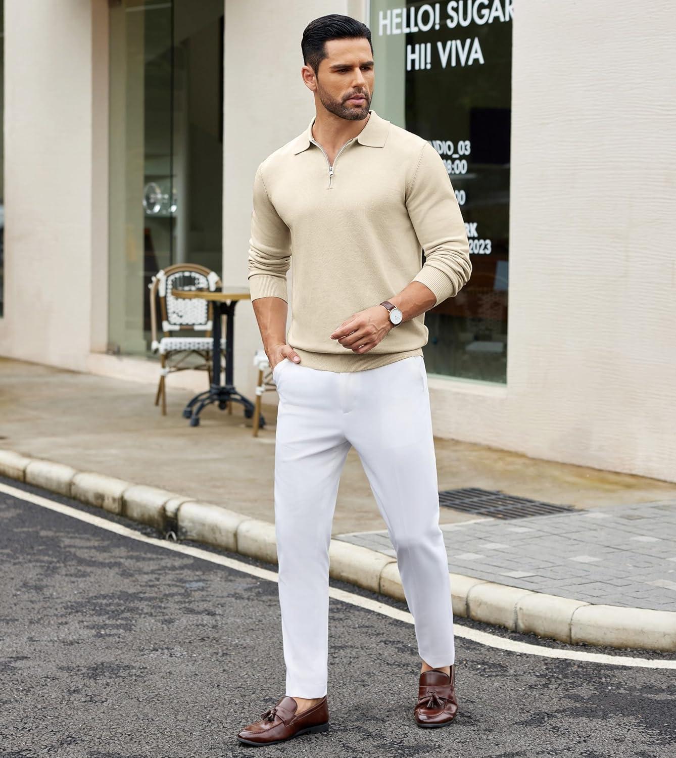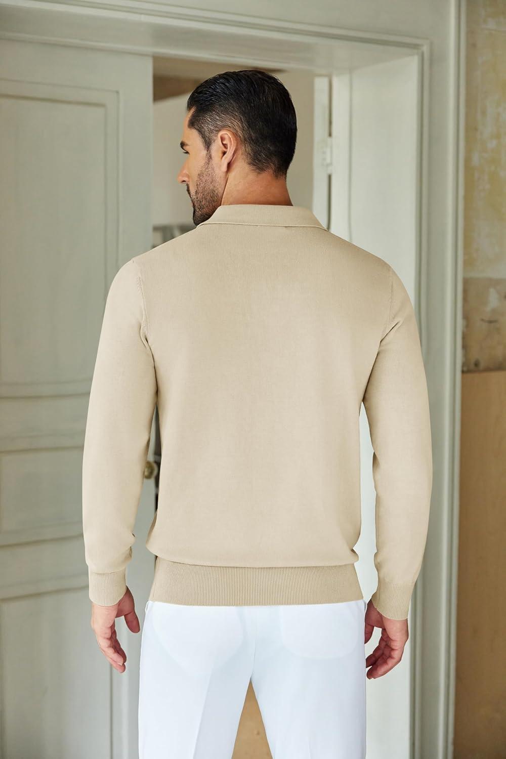 COOFANDY Mens Knit Polo Sweater Casual Long Sleeve Quarter Zip Polo Sweater Classic Golf Shirts(Beige)