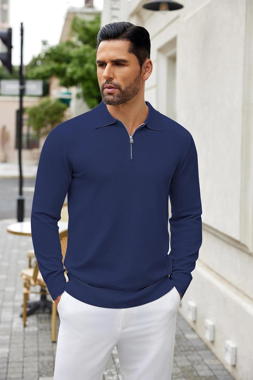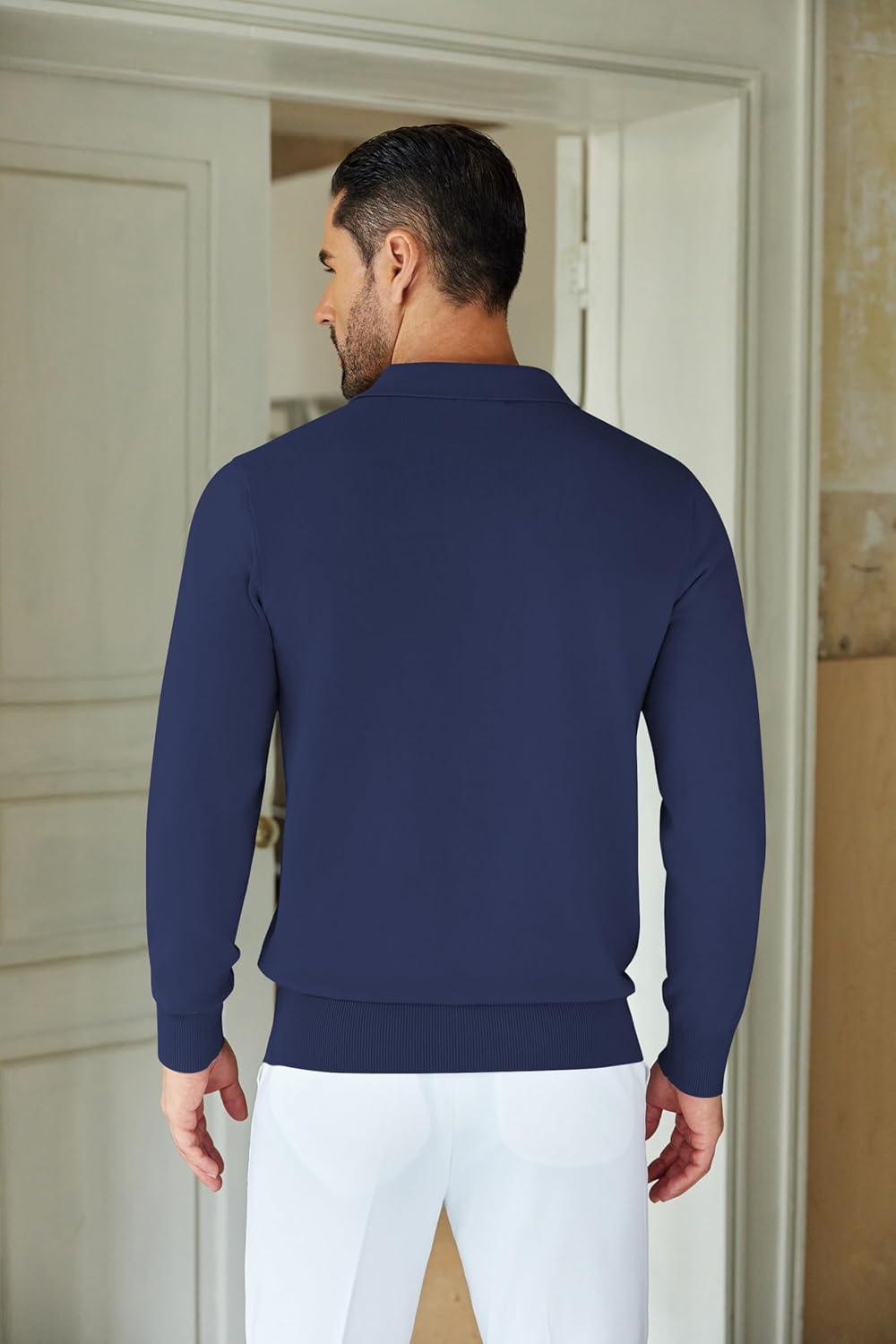 COOFANDY Mens Knit Polo Sweater Casual Long Sleeve Quarter Zip Polo Sweater Classic Golf Shirts(Navy Blue)