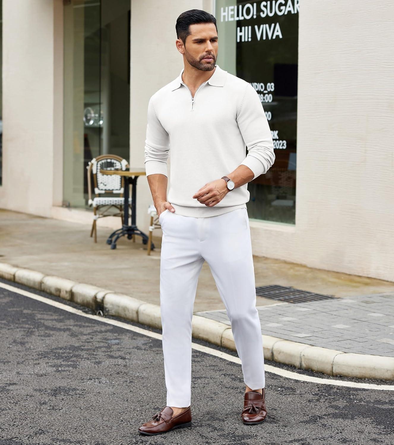 COOFANDY Mens Knit Polo Sweater Casual Long Sleeve Quarter Zip Polo Sweater Classic Golf Shirts(White)