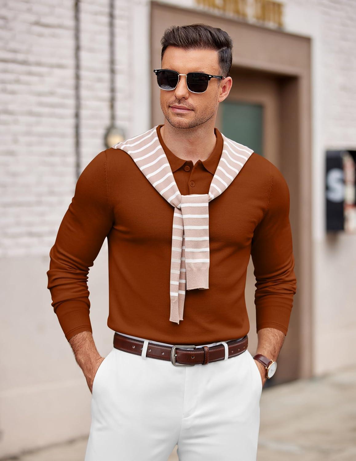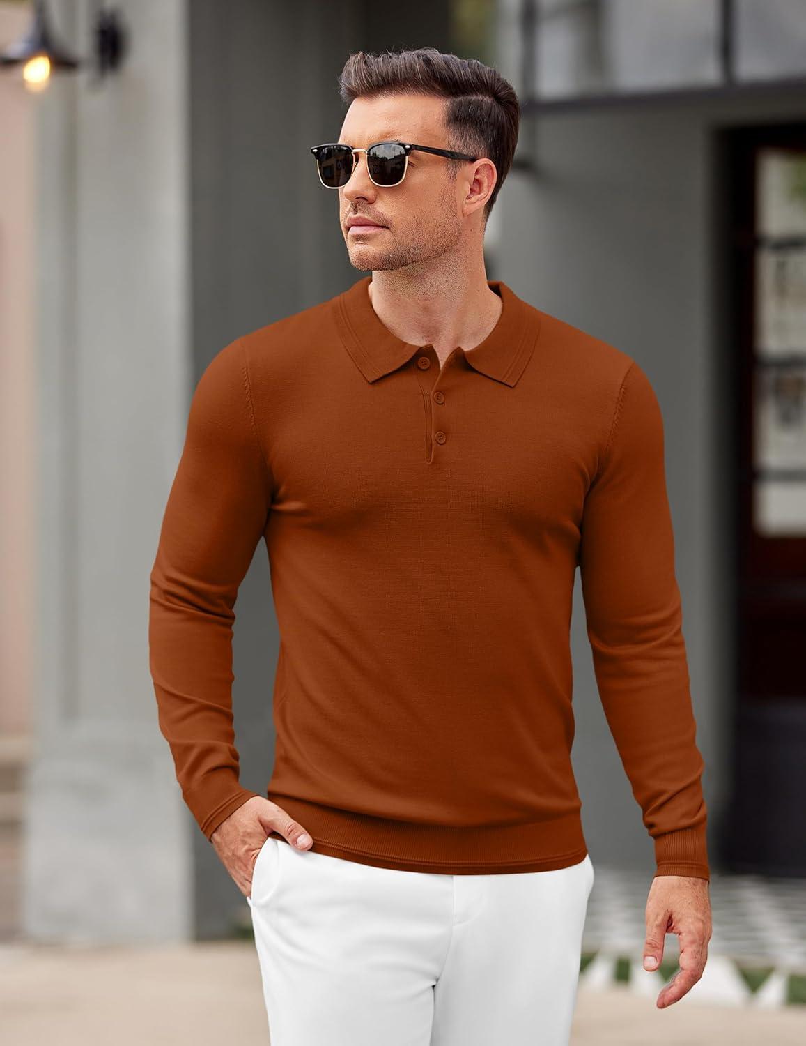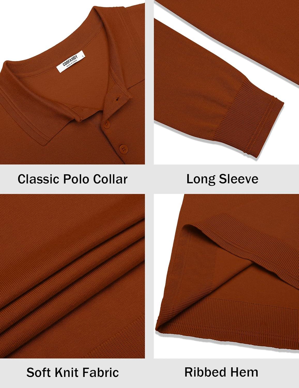 COOFANDY Mens Knit Polo Sweater Long Sleeve Casual Golf Polo Lightweight Dress Button Collar Pullover Sweaters(Caramel)