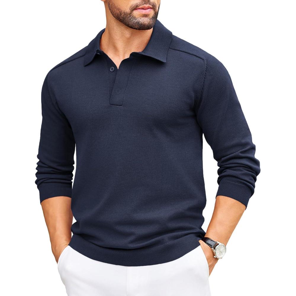 COOFANDY Mens Knit Polo Sweater Long Sleeve Polo Collared Sweaters Hidden Button Casual Pullover Sweater(Navy Blue)