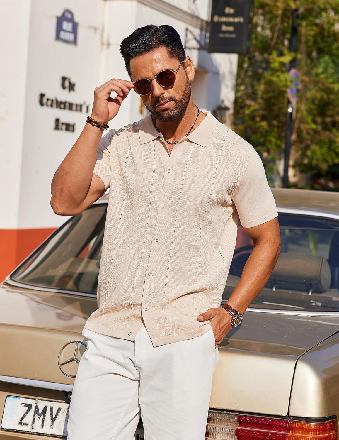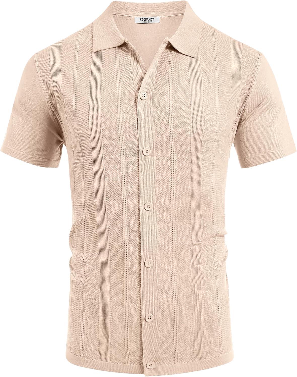 COOFANDY Mens Knit Shirt Short Sleeve Button Down Shirts Casual Summer Beach Vintage Polo Shirts Cream