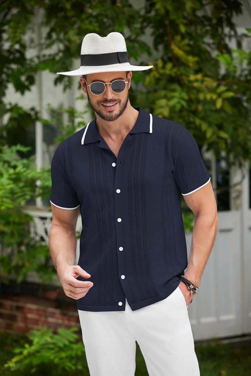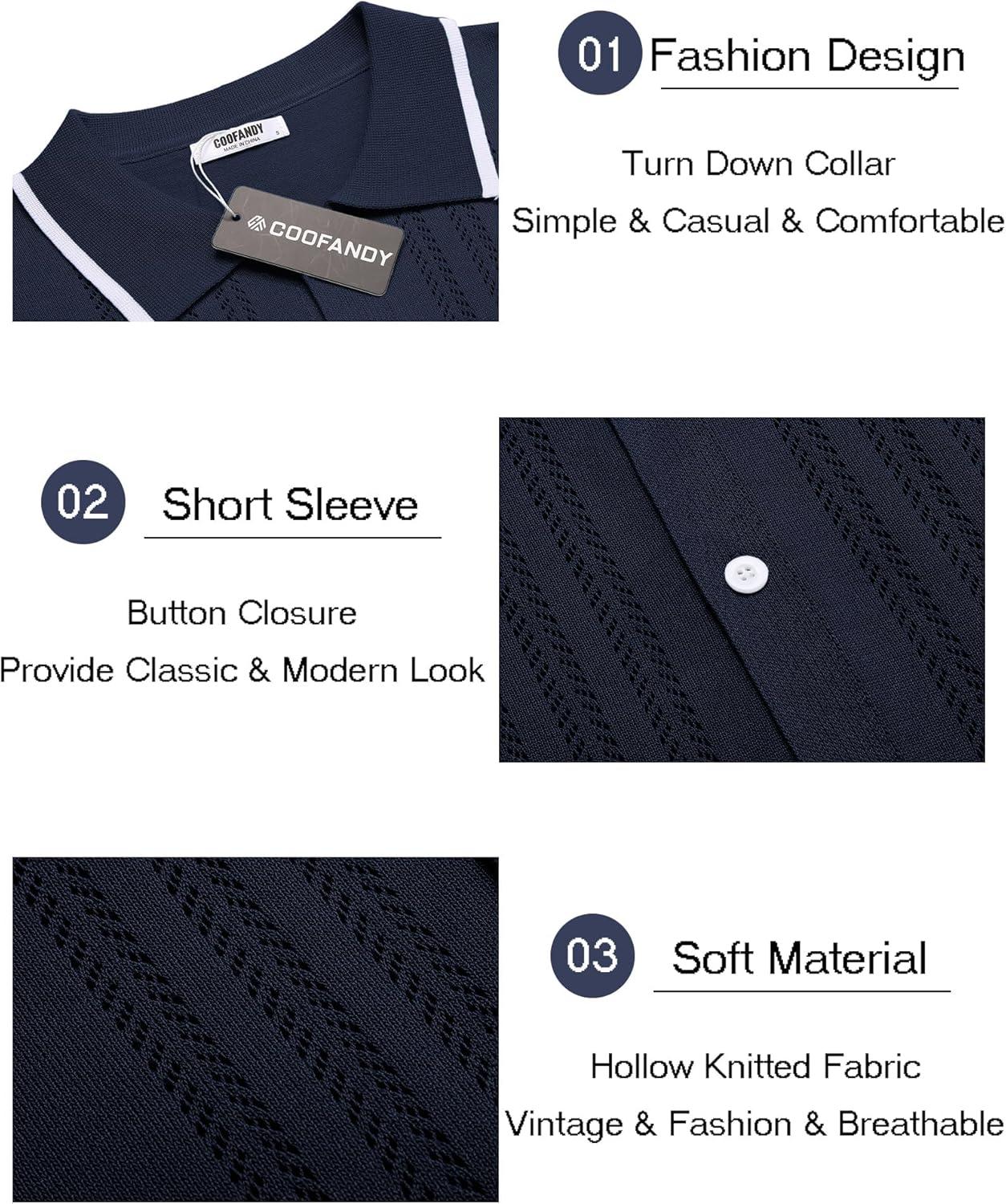 COOFANDY Men’s Knit Shirts Short Sleeve Button Down Polo Shirt Fashion Casual Summer Beach Shirts(Blue)