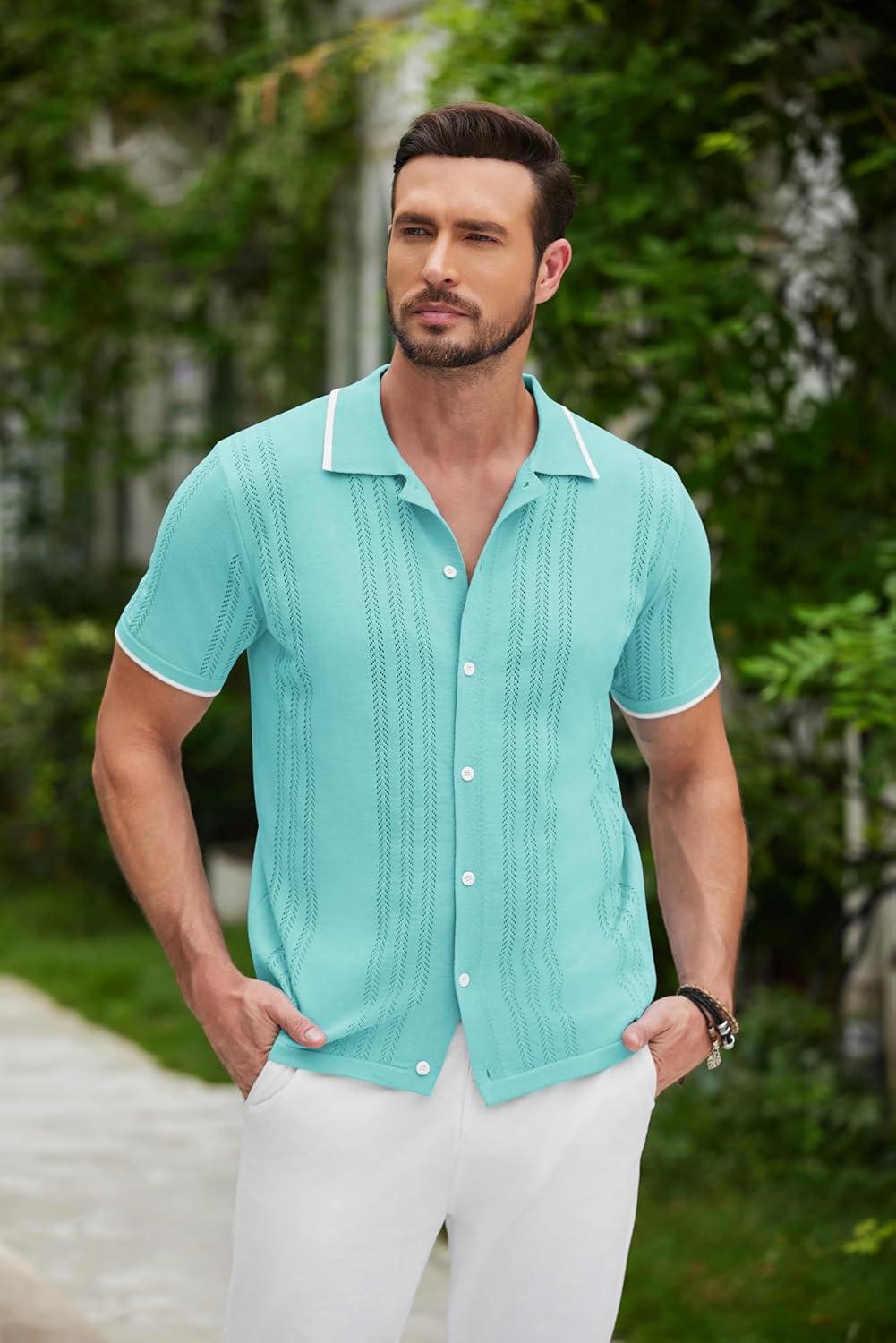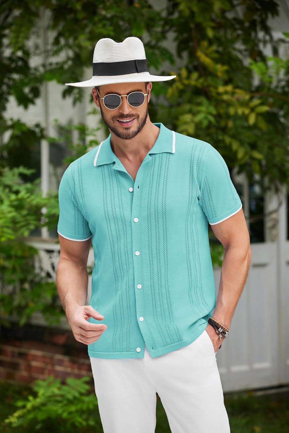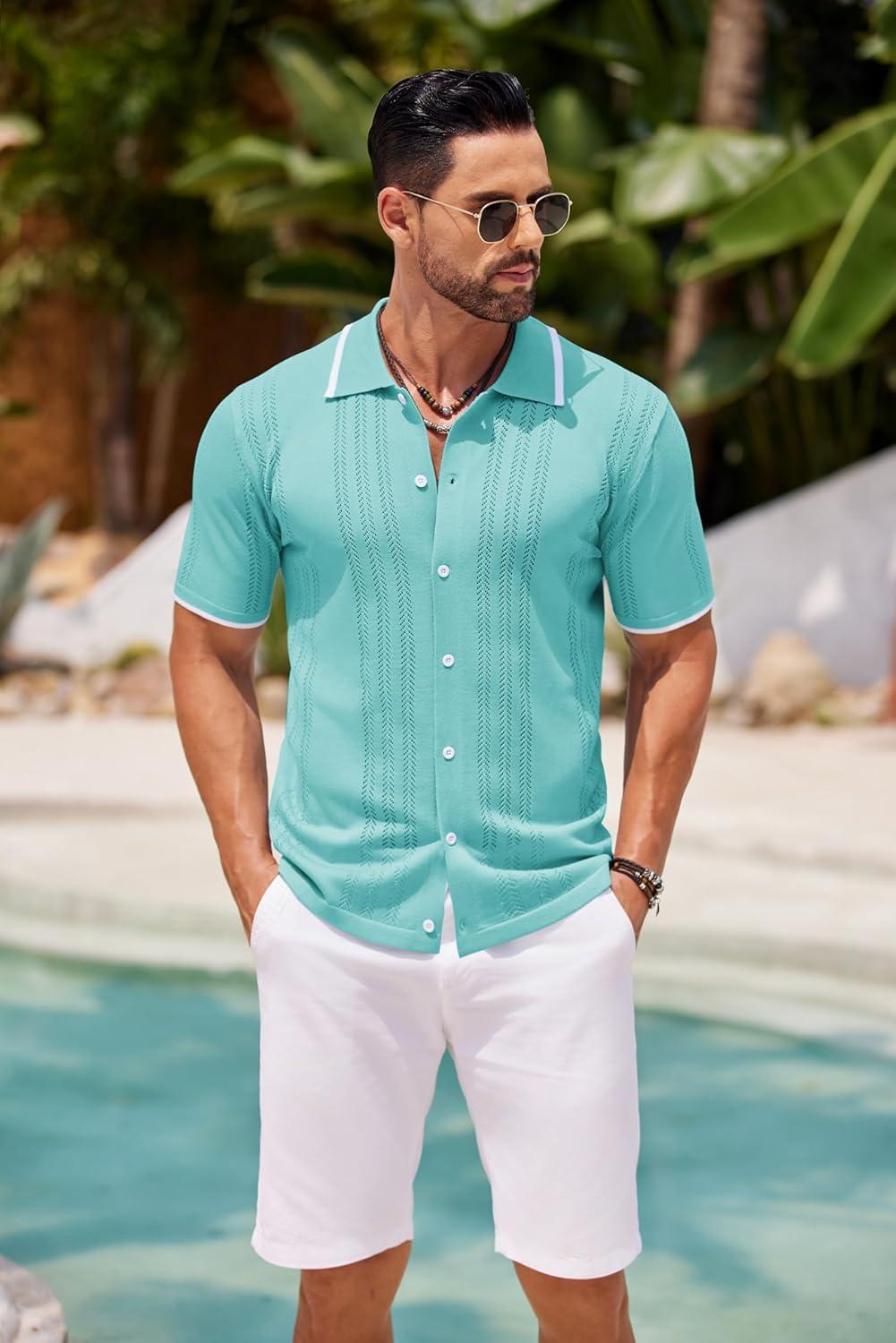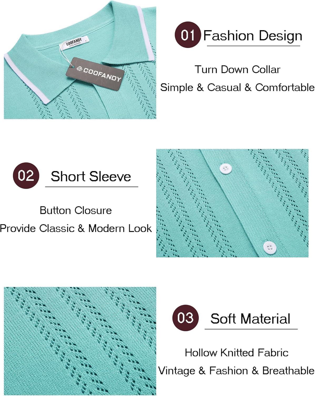 COOFANDY Men’s Knit Shirts Short Sleeve Button Down Polo Shirt Fashion Casual Summer Beach Shirts(Ceramic Green)