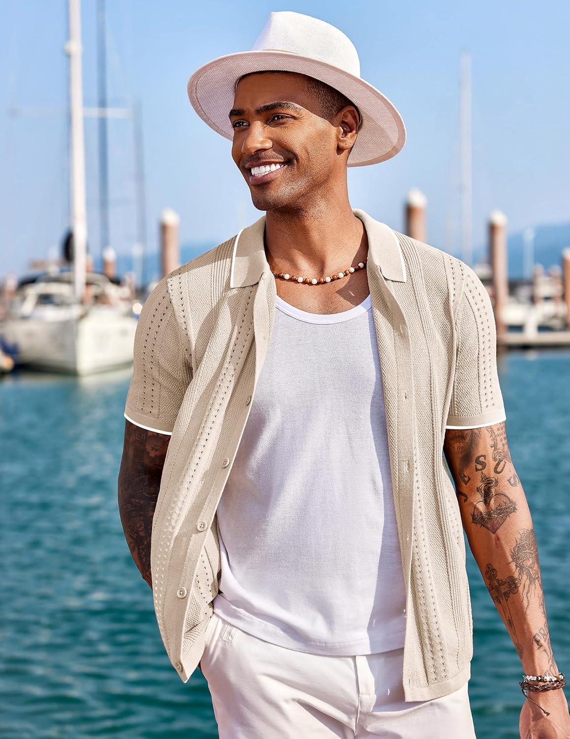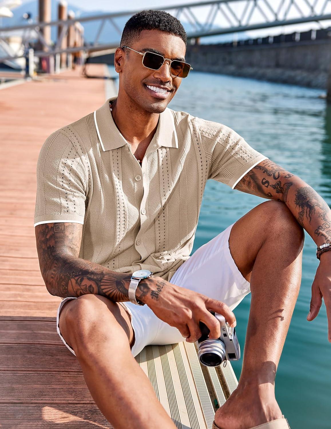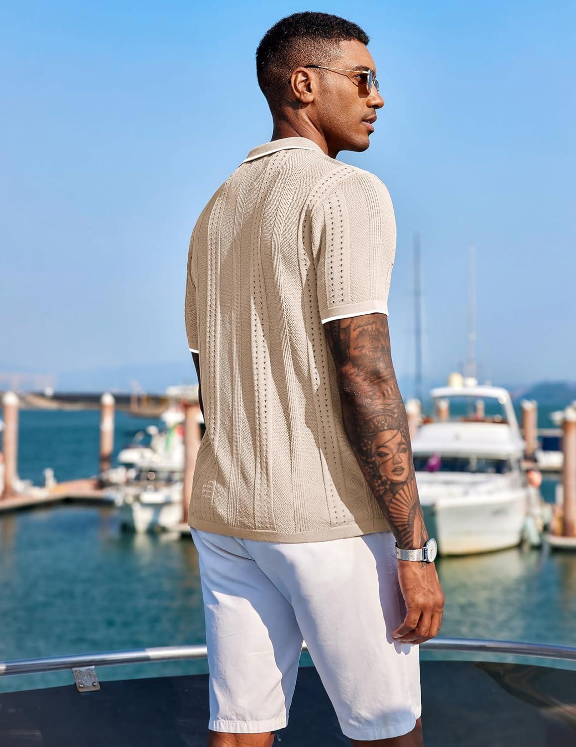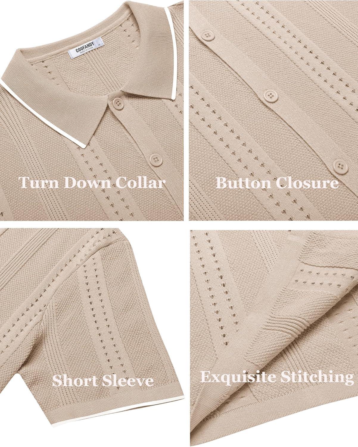 COOFANDY Men’s Knit Shirts Short Sleeve Button Down Polo Shirt Fashion Casual Summer Beach Shirts(Classic Apricot & White)