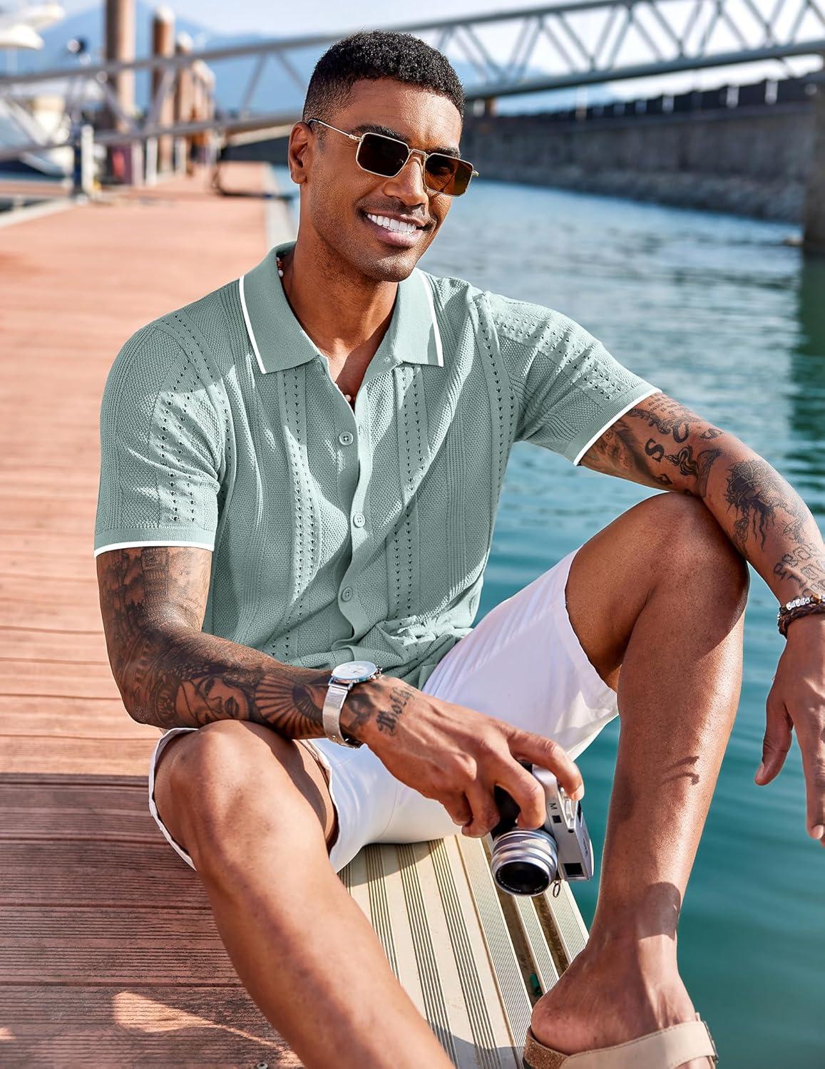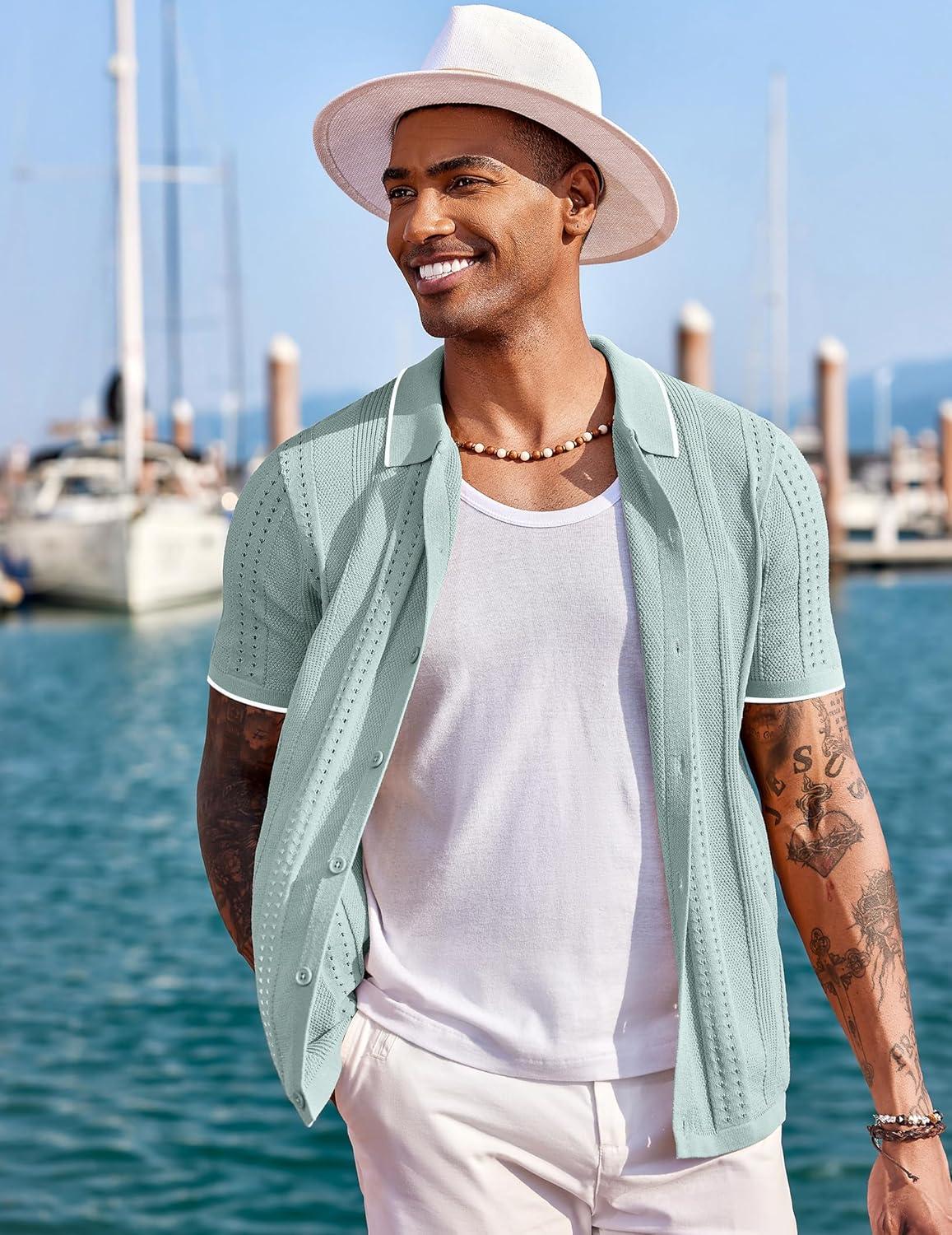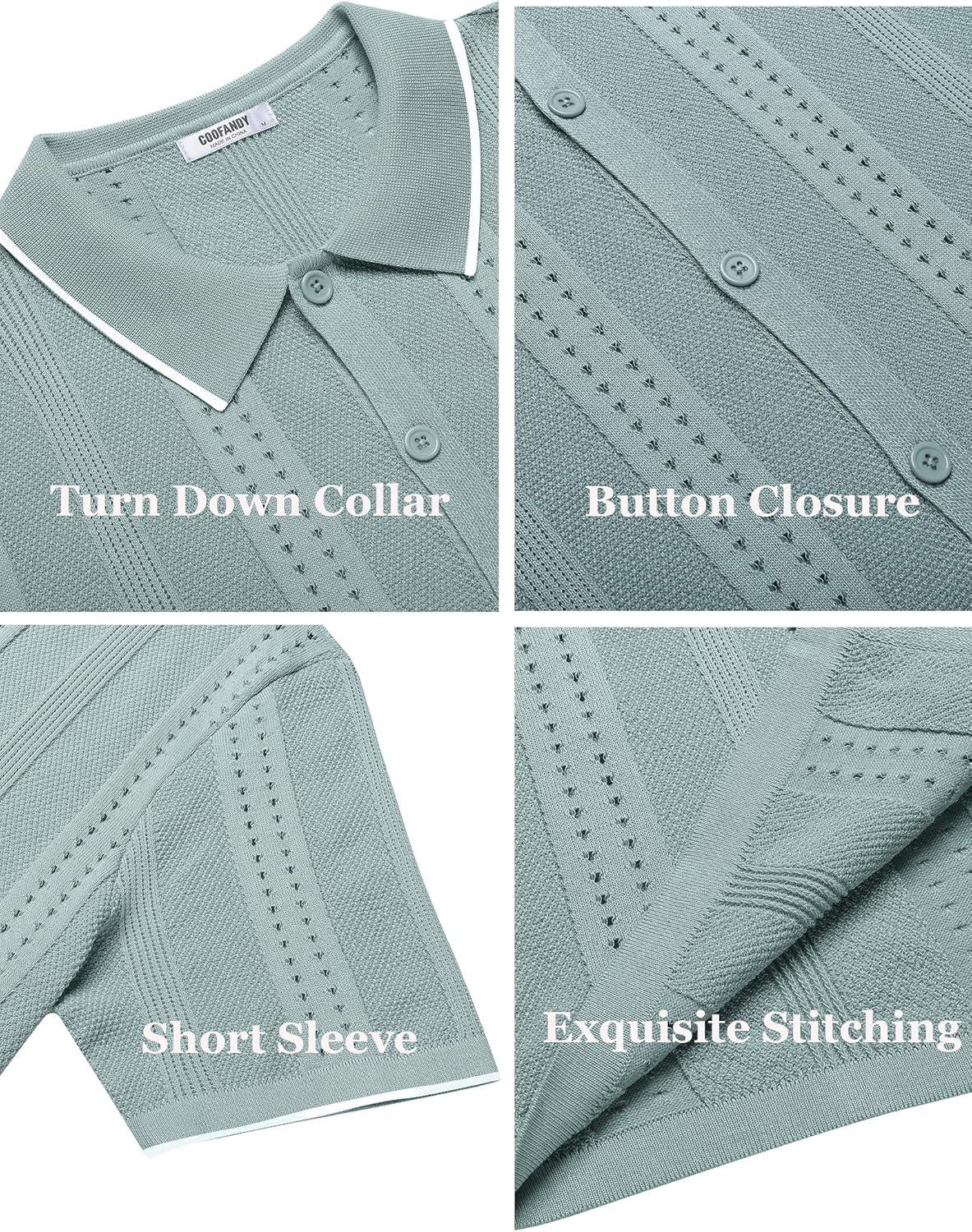 COOFANDY Men’s Knit Shirts Short Sleeve Button Down Polo Shirt Fashion Casual Summer Beach Shirts(Classic Ice Green & White)