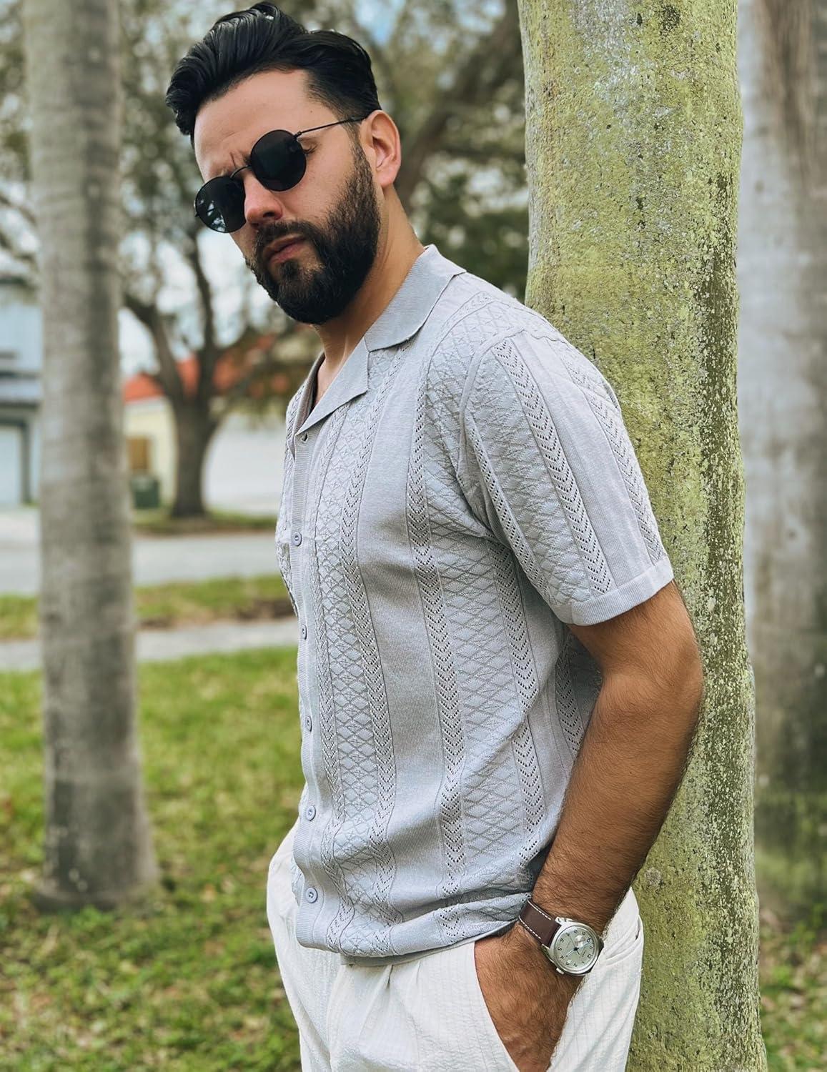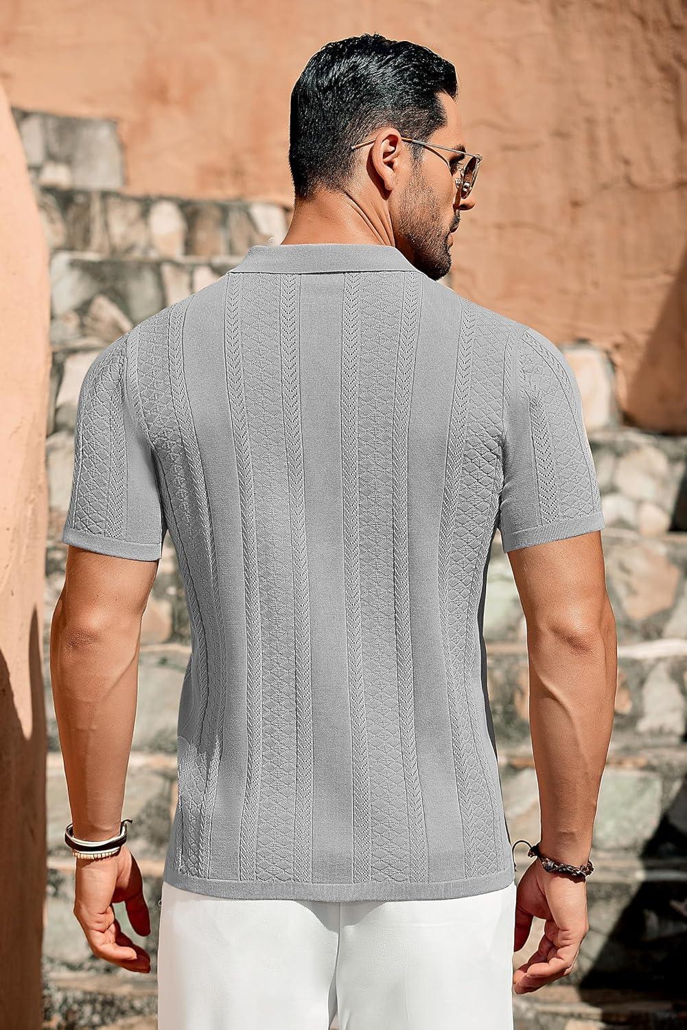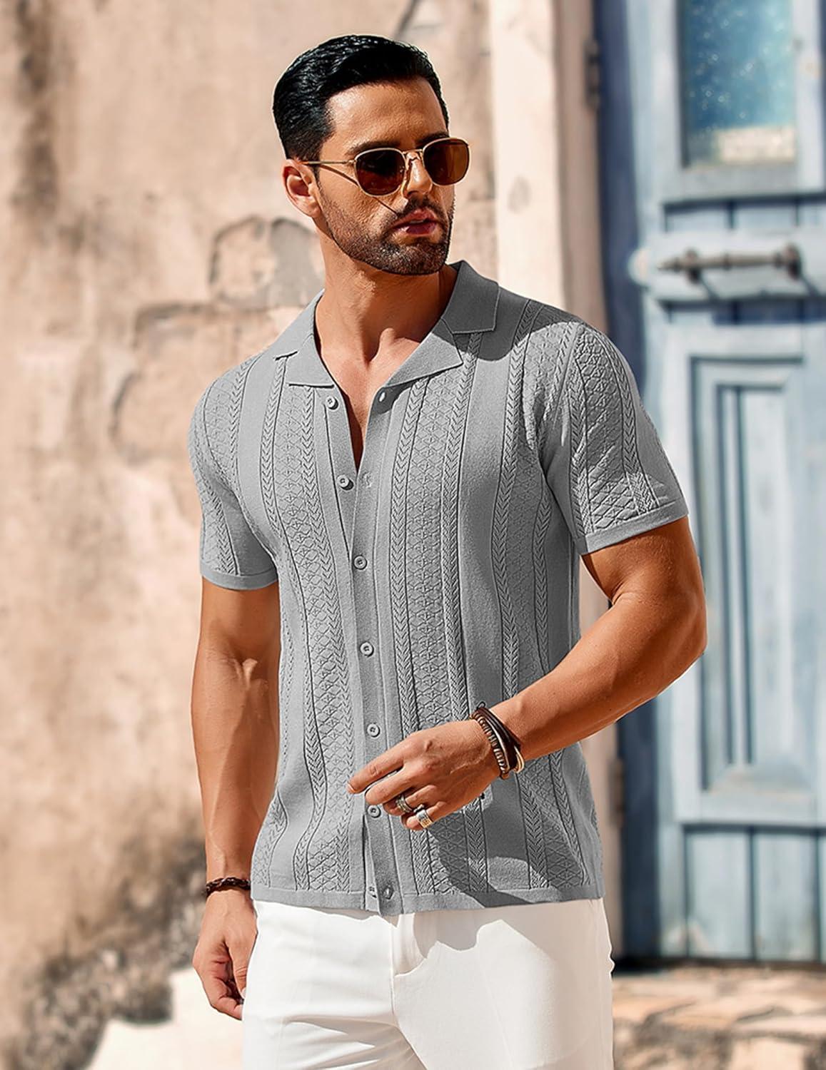 COOFANDY Men’s Knit Shirts Short Sleeve Button Down Polo Shirt Fashion Casual Summer Beach Shirts(Light Gray)