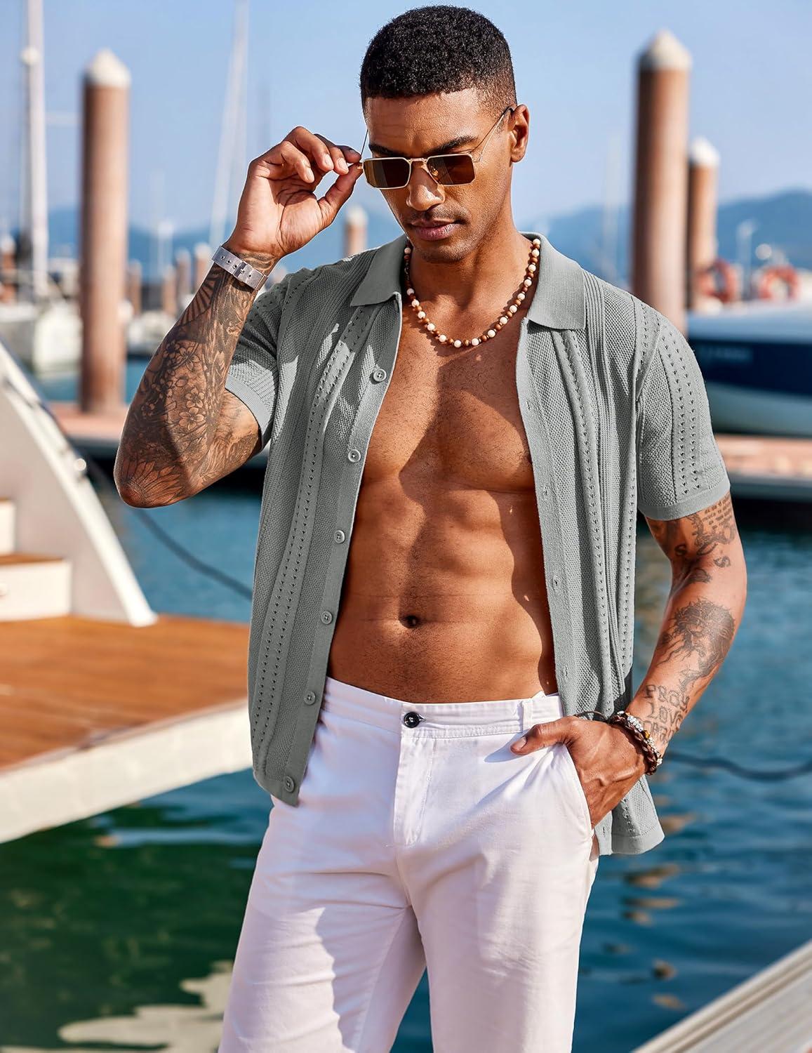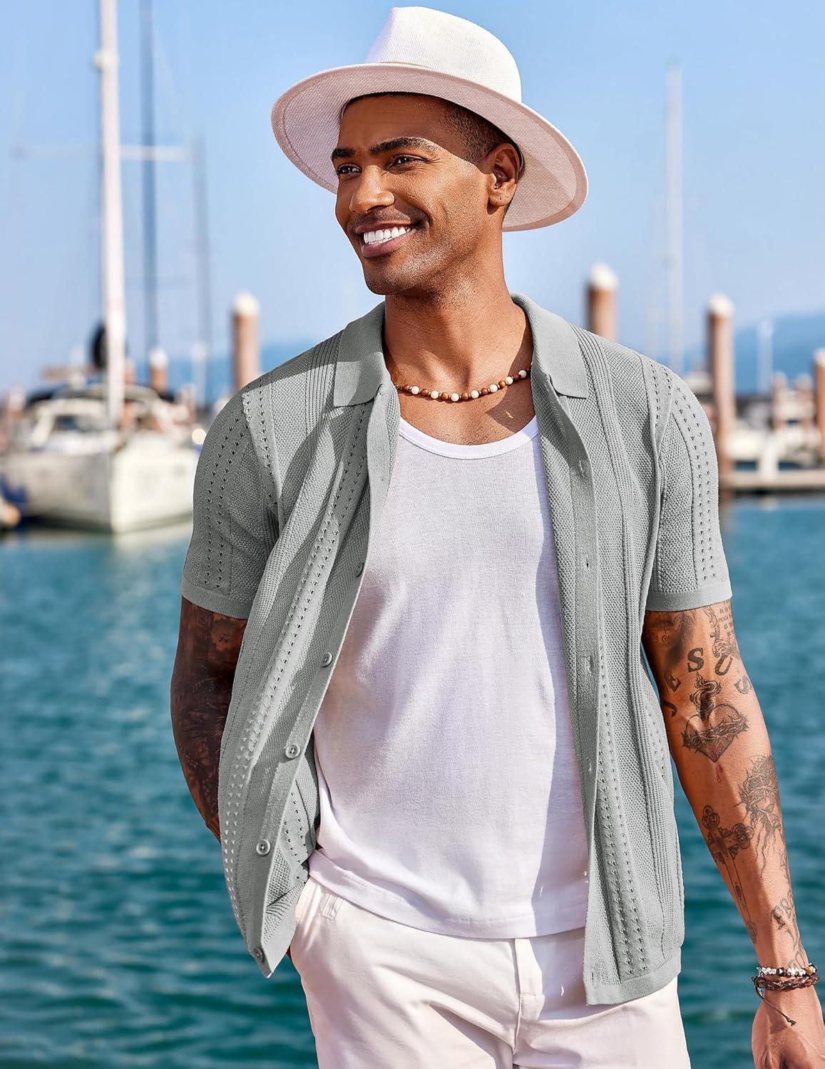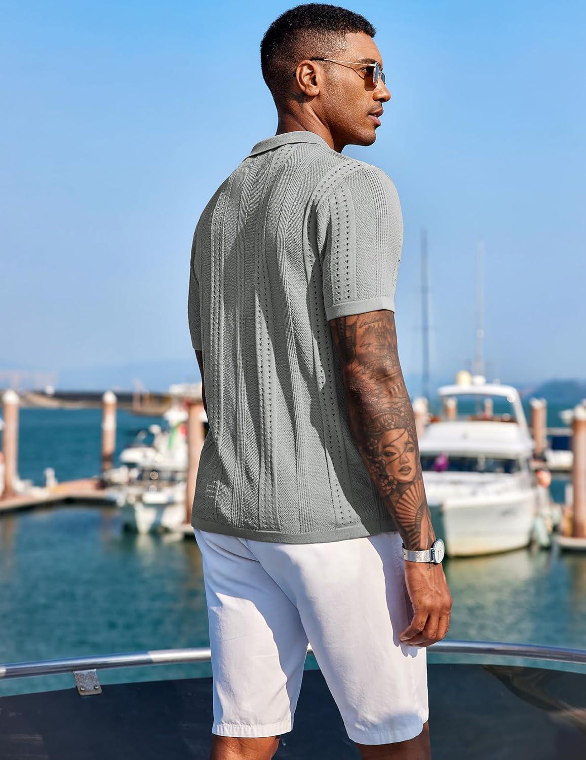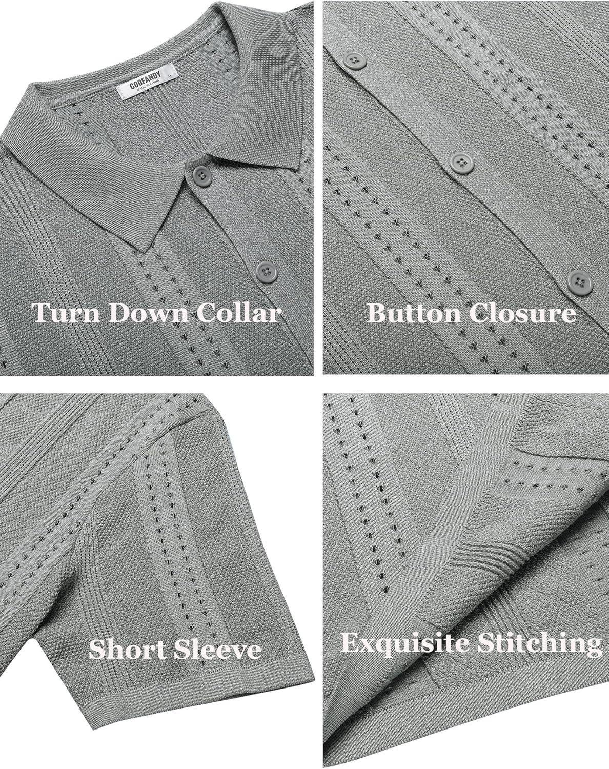 COOFANDY Men’s Knit Shirts Short Sleeve Button Down Polo Shirt Fashion Casual Summer Beach Shirts(Light Grey)