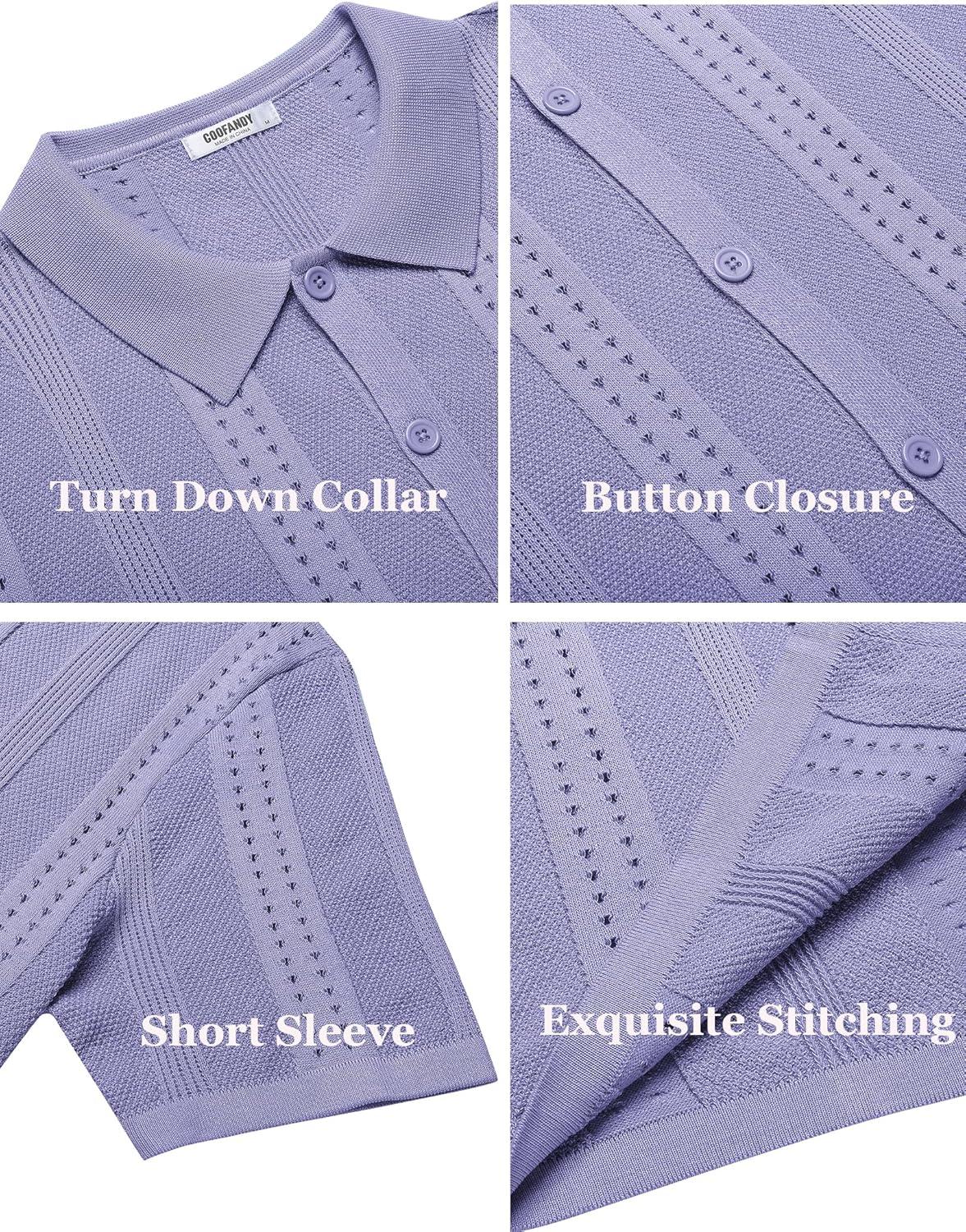 COOFANDY Men’s Knit Shirts Short Sleeve Button Down Polo Shirt Fashion Casual Summer Beach Shirts(Lilac)